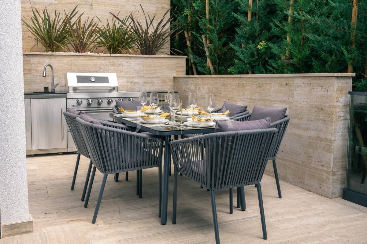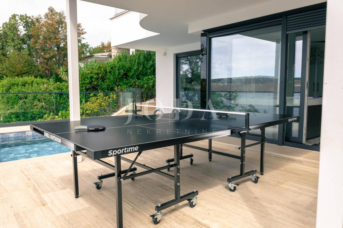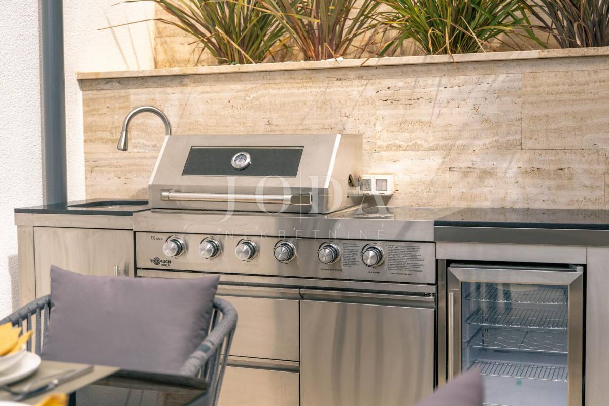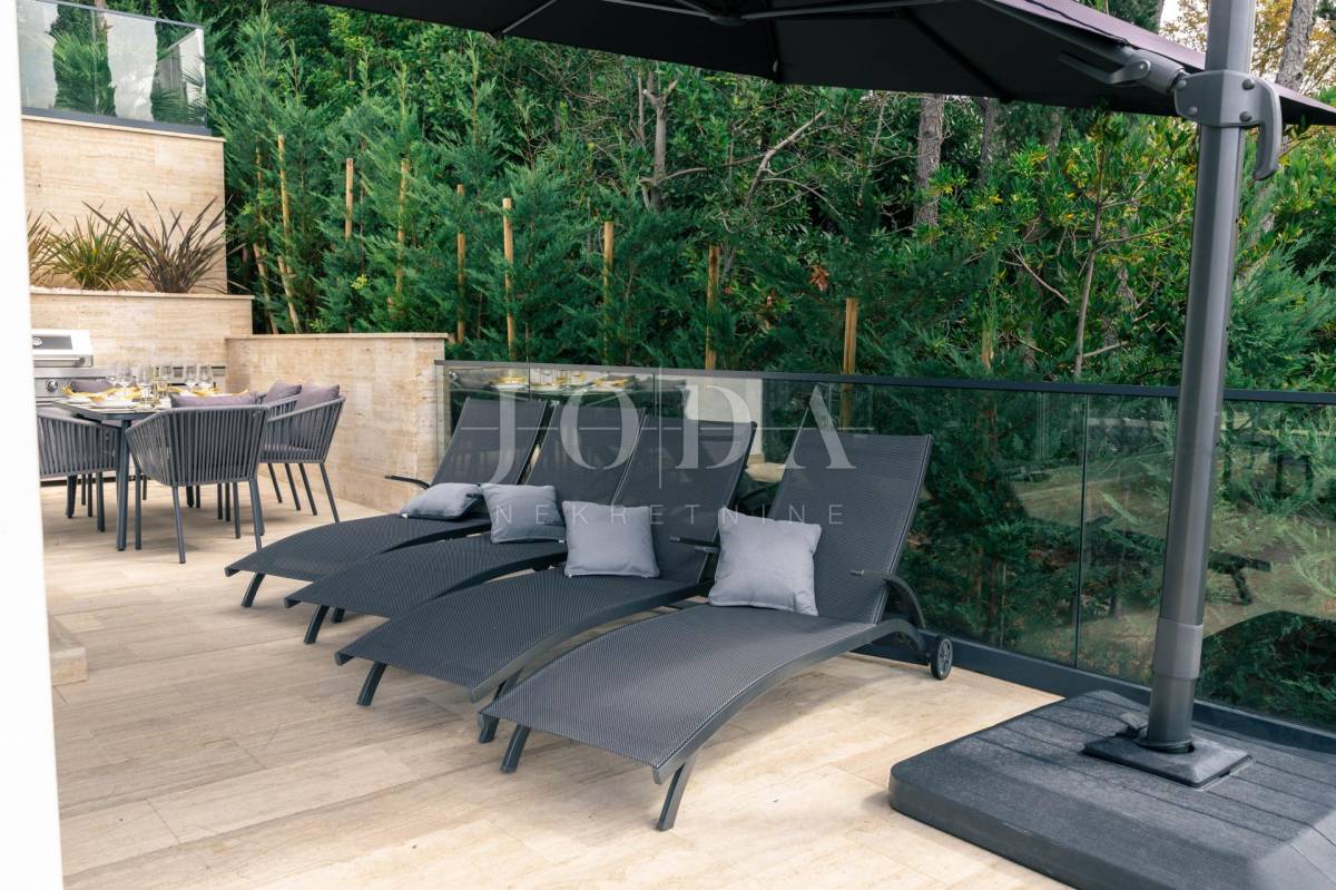 Villa je velikim dijelom u Kamenu (Traventino kamen uvezen iz Rima). Ostatak kuce je u bijeloj fasadi. Stolarija izvana u antracit boji, unutra bijela. Velike staklene stijene i elektricne roletne.Video Nadzor, grijanje, hladjenje, rasvjeta i ostalo na aplikaciji.