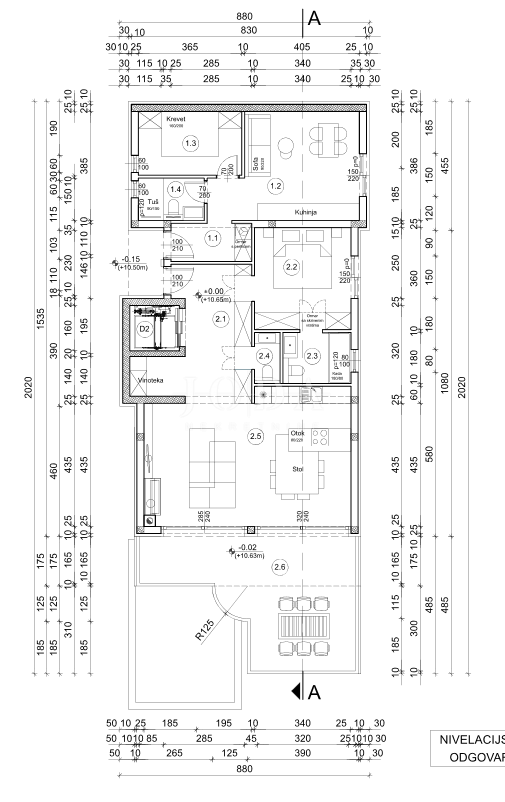 Sastoji se od predsoblja s vinarijom i velikim dnevnim boravkom. Moderna kuhinja s otokom i blagovaonskim stolom i kaminom ( trenutno električni kamin ali se može promijeniti u klasični otvoreni kamin na drva).