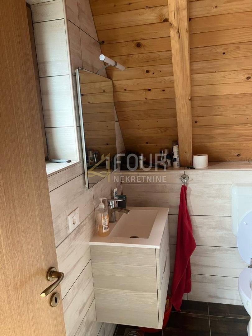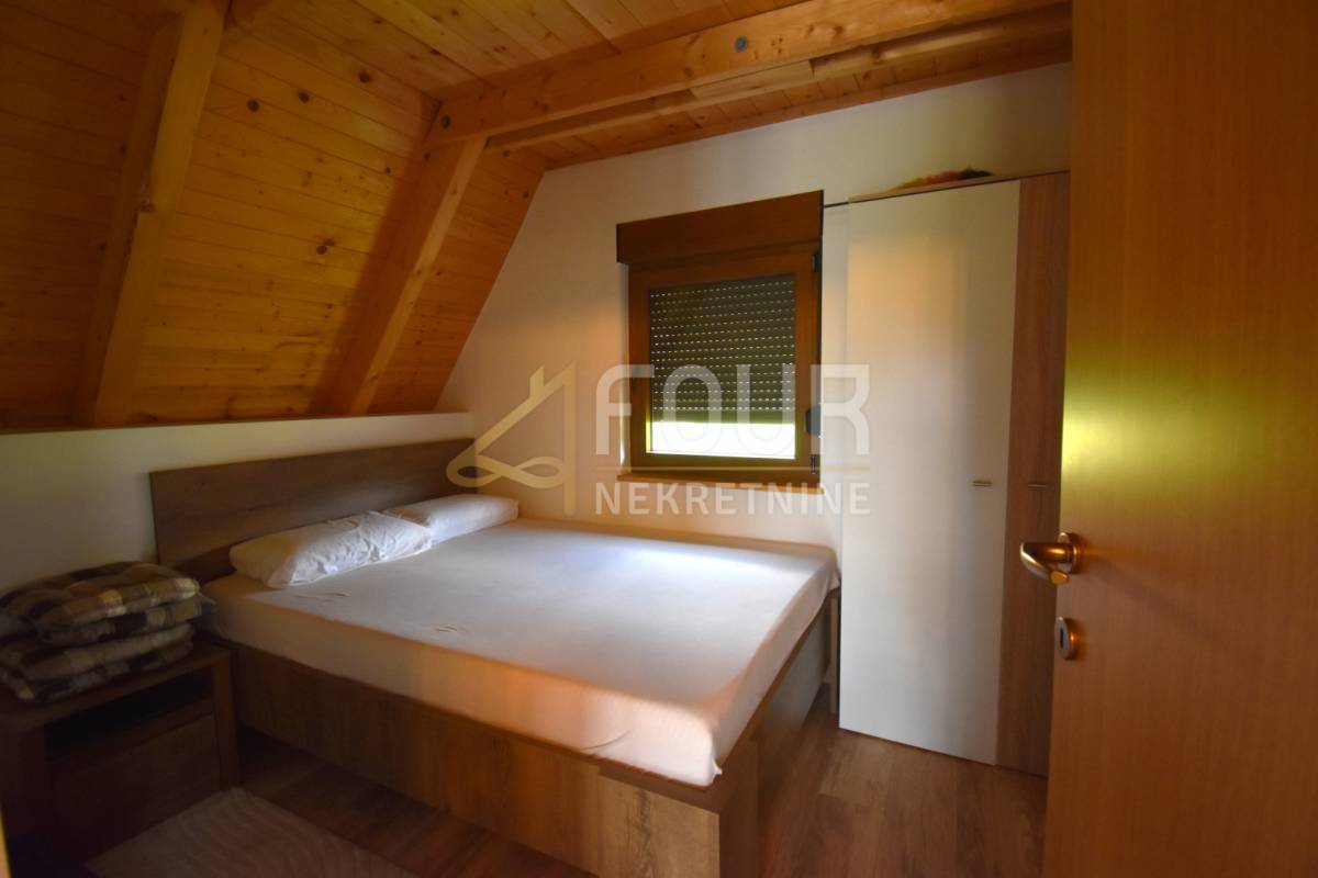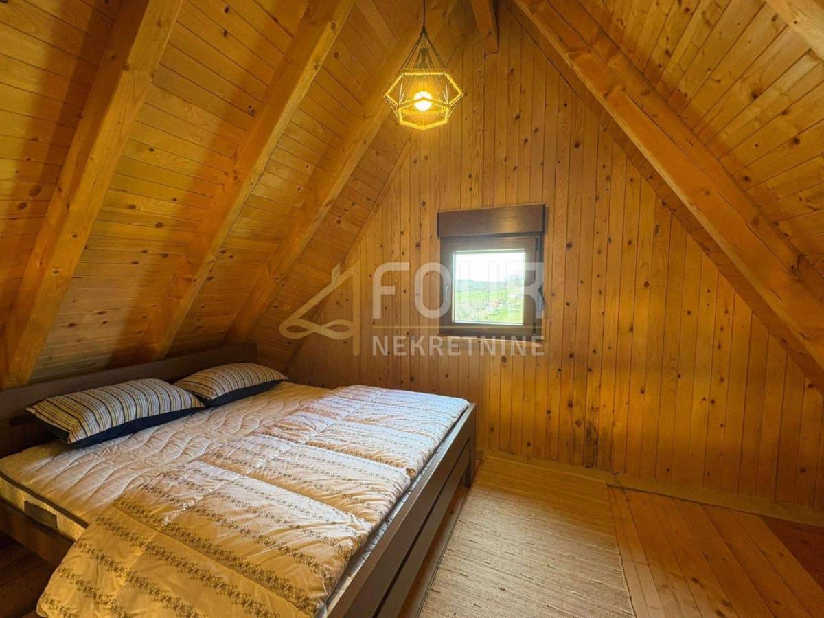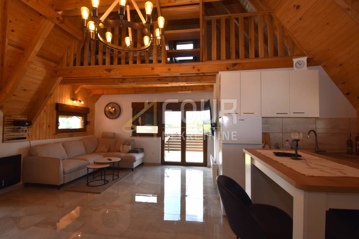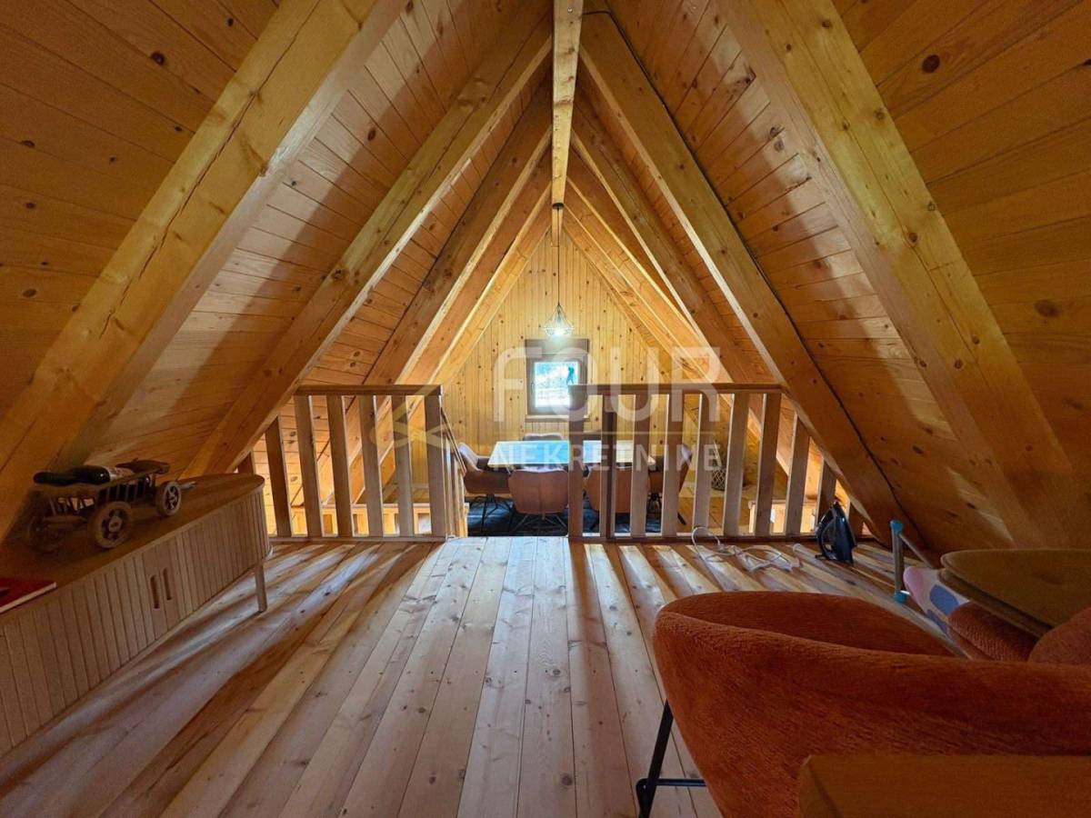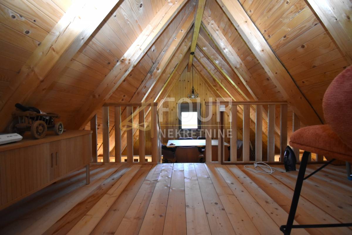 Stambeni prostor organiziran je kroz prizemlje i visoko potkrovlje. U prizemlju se nalazi ugodan dnevni boravak povezan s kuhinjom, kupaonica te dvije spavaće sobe, dok se u visokom potkrovlju smjestila jedna velika soba površine 40 m2 koja nudi brojne mogućnosti uređenja, ovisno o potrebama budućeg vlasnika. Iz kuće se izlazi na terasu koja dodatno povezuje interijer s vanjskim prostorom i prirodom.