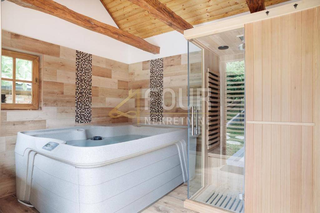 SPA zona, smještena u zasebnoj kućici od 14 m2, nudi saunu, jacuzzi, kupaonicu i prostor za odmor, pružajući potpuni wellness doživljaj u privatnosti vlastitog imanja.