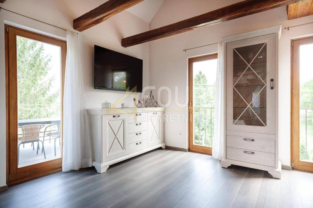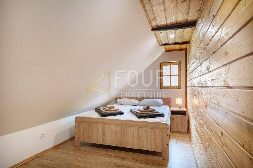 U potkrovlju su smještene dvije spavaće sobe, galerija i prostrana natkrivena terasa od 25 m2 s otvorenim pogledom na rijeku Koranu.