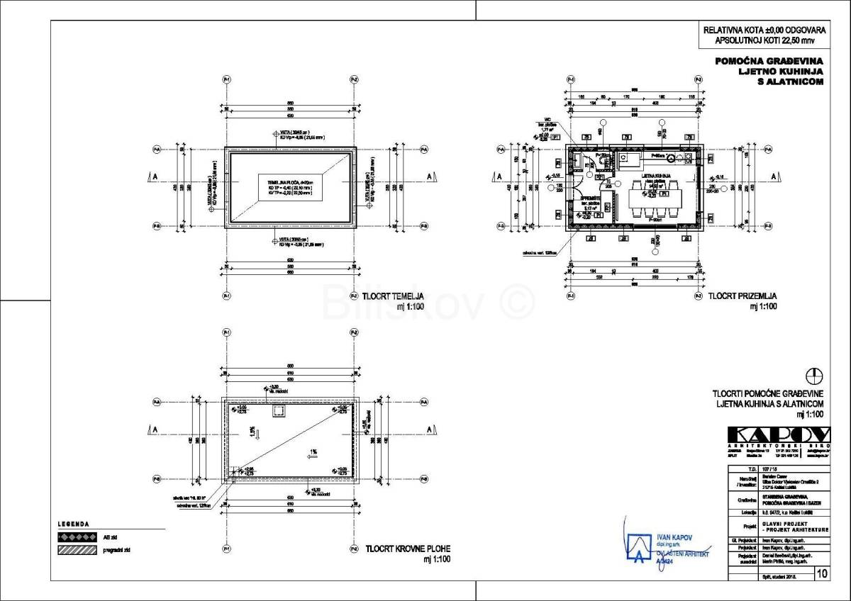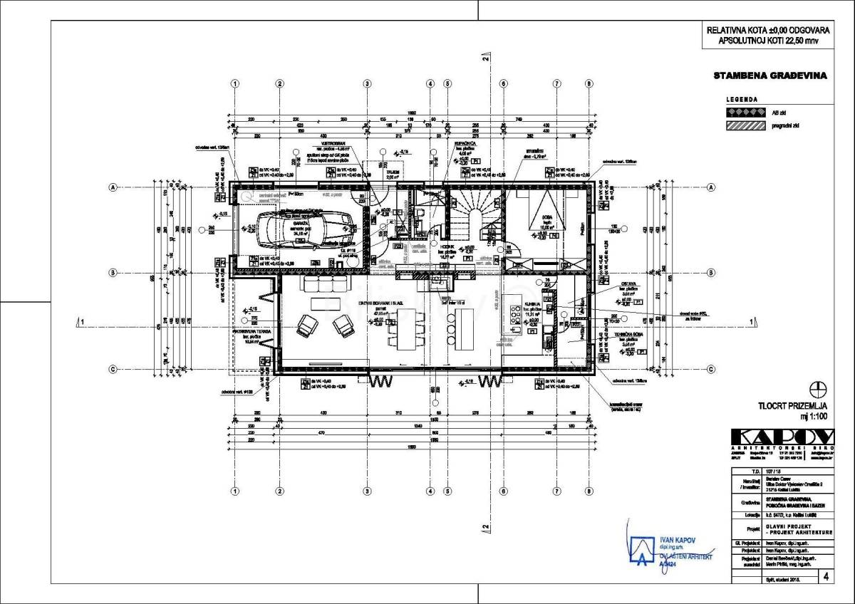 Prizemlje - predulaz, garaža, kuhinja, blagovaonica, dnevni boravk, spavaća soba, kupaonica, ostava s radnom sobom (video nadzor), stepenište i velika terasa