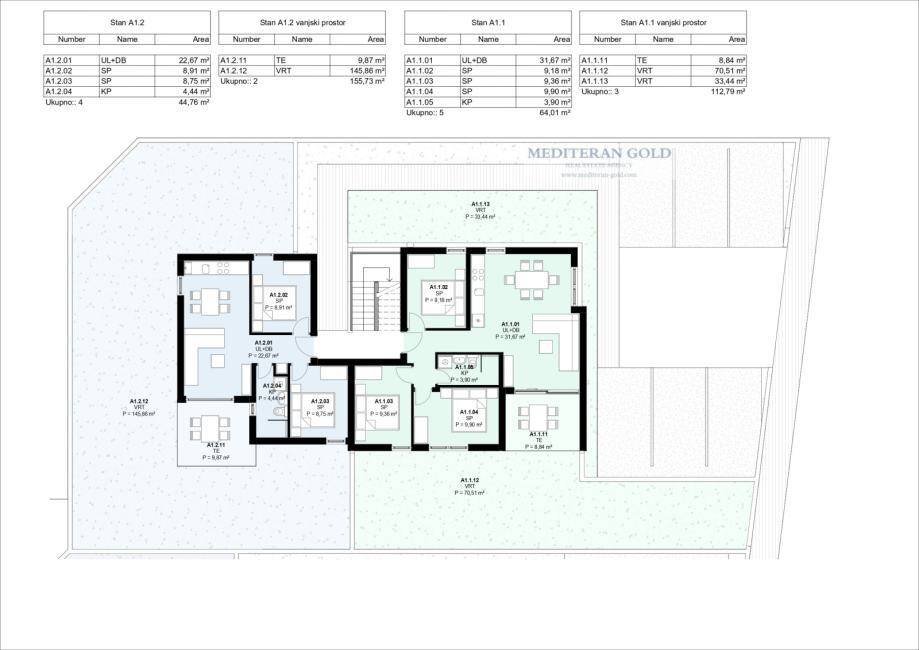 U PONUDI : dvosoban stan: A1.2 63,58m2, prizemlje sa vrtom, dvosoban stan + 1 parkirno mjesto = 241.604€.