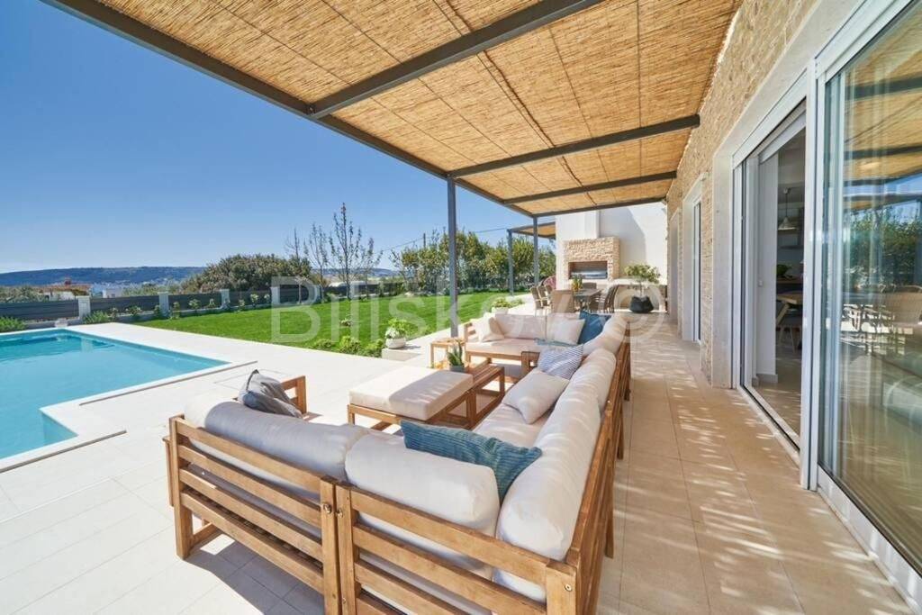 Vanjski dio opremljen je vrtnim namještajem, a dominira bazen okružen ležaljkama.