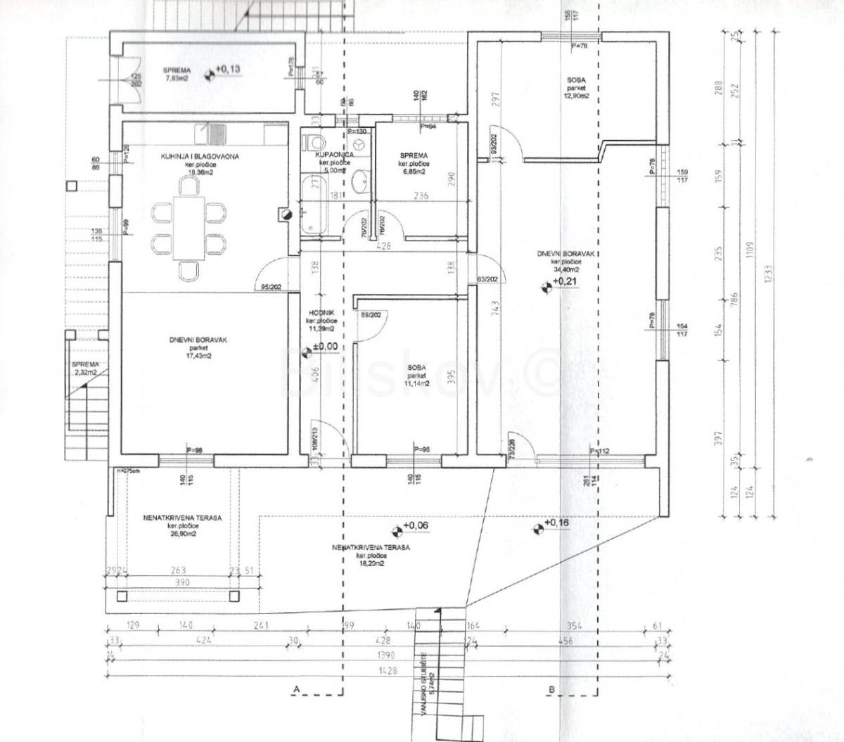 Na etaži prizemlja smještena je kuhinja sa blagovaonom ( 18,36 m2) i dnevnim boravkom ( 17,43 m2 ), sprema ( 7,83 m2 ) kupaonica ( 5m2 ) tri spavaće sobe ( 11,14 m2 i 12,90 m2 i 6,85 m2), dodatna prostorija u funkciji dnevnog dijela za opuštanje ( 34,40 m2) te dvije nenatkrivene terase ( 26,90m2 i 18,20 m2 ).