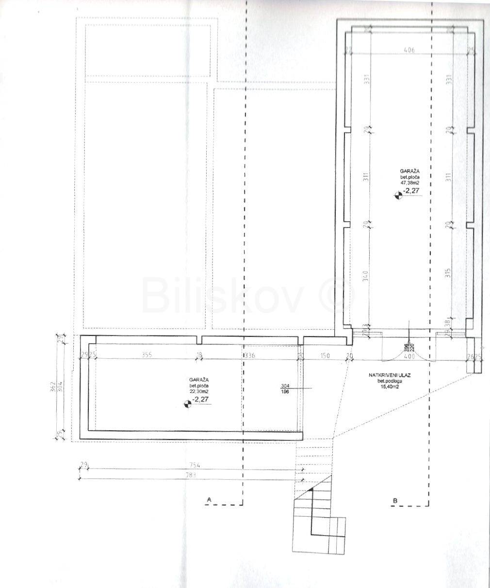 Na etaži podruma smjestile su se dvije garaže površina 47,38 m2 i 22,30 m2.