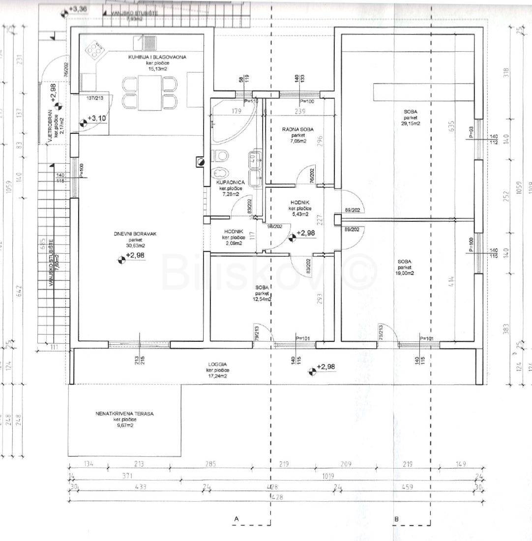 Na etaži 1.kata smještena je kuhinja sa blagovaonom ( 15,13 m2), dnevni boravak ( 30,63 m2 ), hodnik ( 2,09 m2 i 5,43 m2 ), kupaonica ( 7,28 m2 ), radna soba ( 7,05 m2 ), 3 spavaće sobe ( 29,15 m2, 19 m2 te 12,54 m2 ), loggia ( 17,24 m2) te nenatkrivena terasa ( 9,67 m2 ).