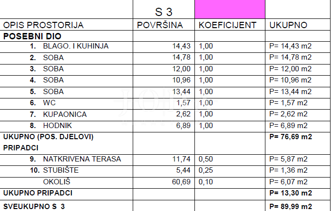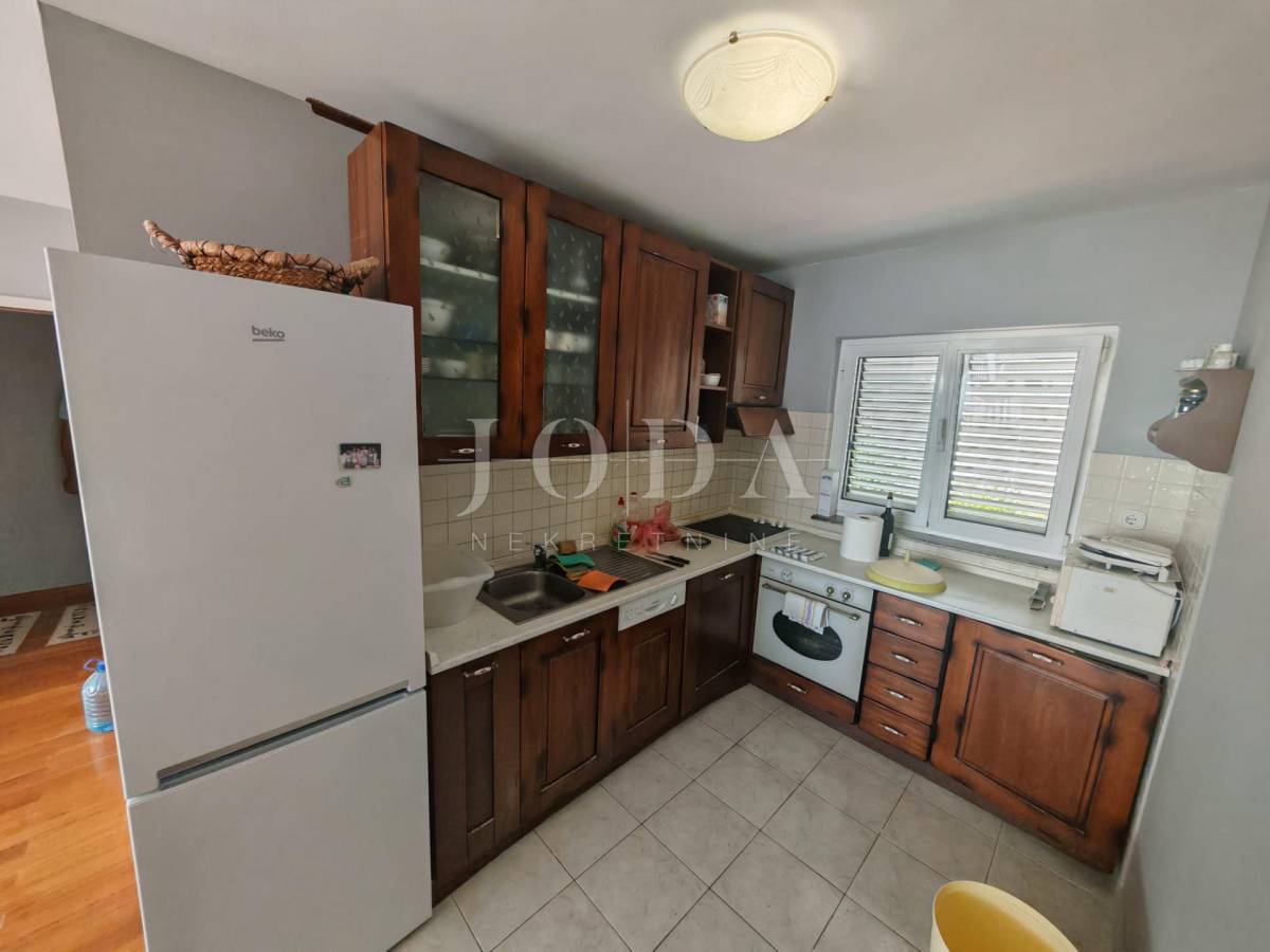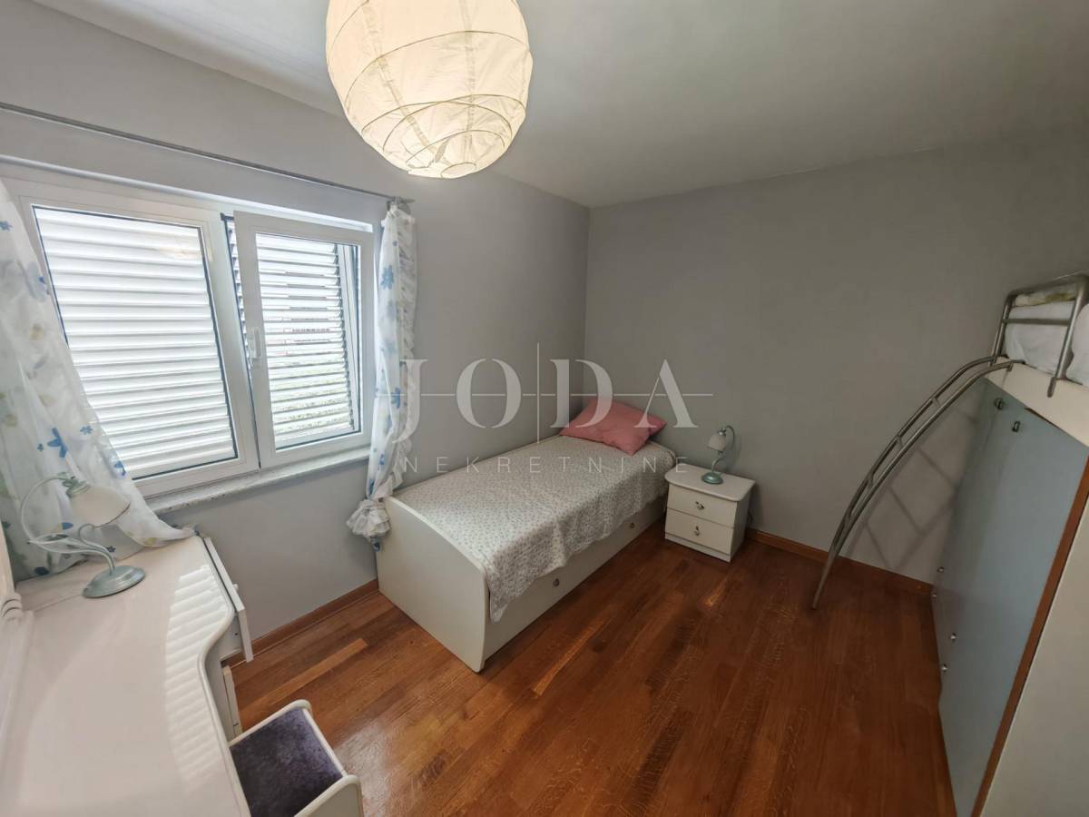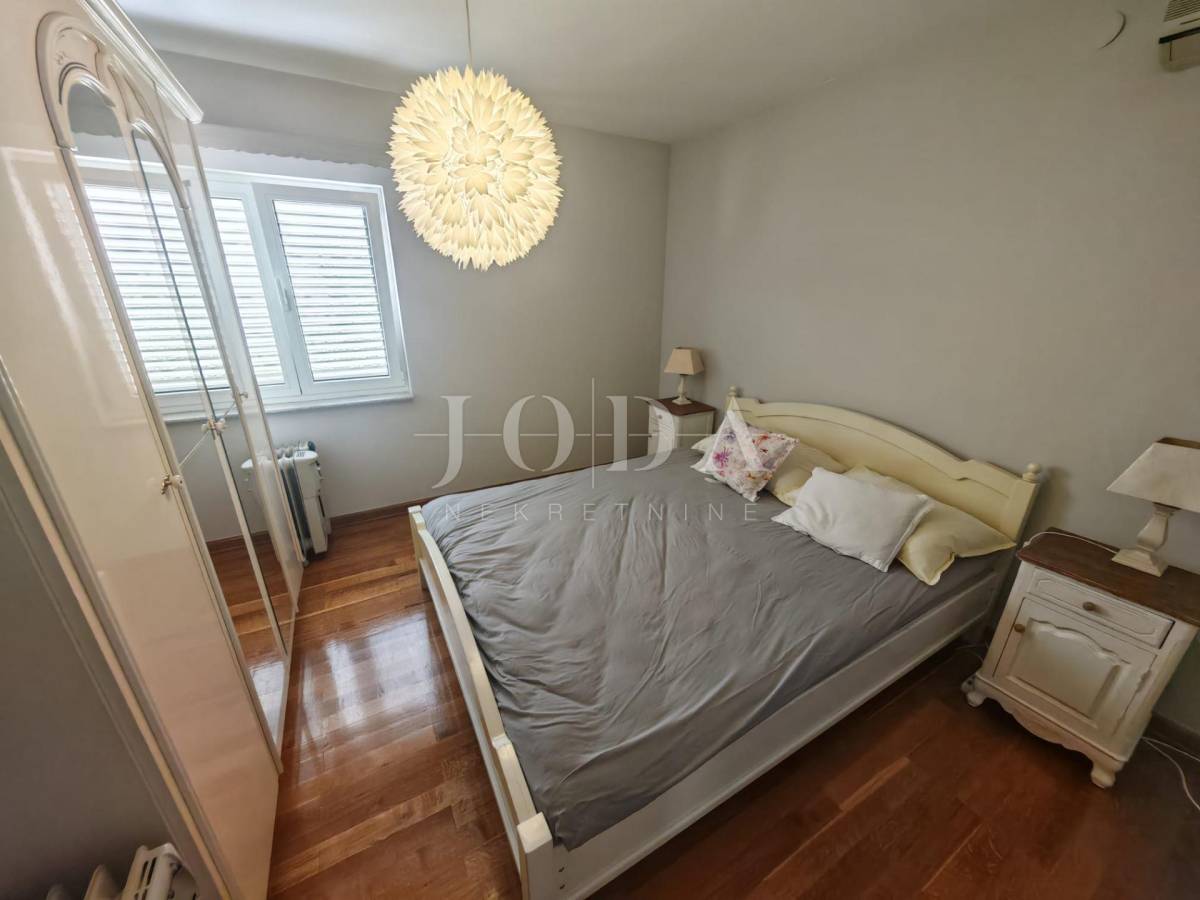Stan je izuzetno uredan i prostran a sastoji se od tri spavaće sobe, dvije kupaonice, kuhinje s blagovaonicom i dnevnog boravka s izlazom na prostranu terasu koja je većim dijelom natkrivena. Stan je klimatiziran a kompletna stolarija je aluminijska. Iz hodnika se može pristupiti prostranom tavanskom prostoru koji se može i dodatno oplemeniti ili koristiti kao skladište.