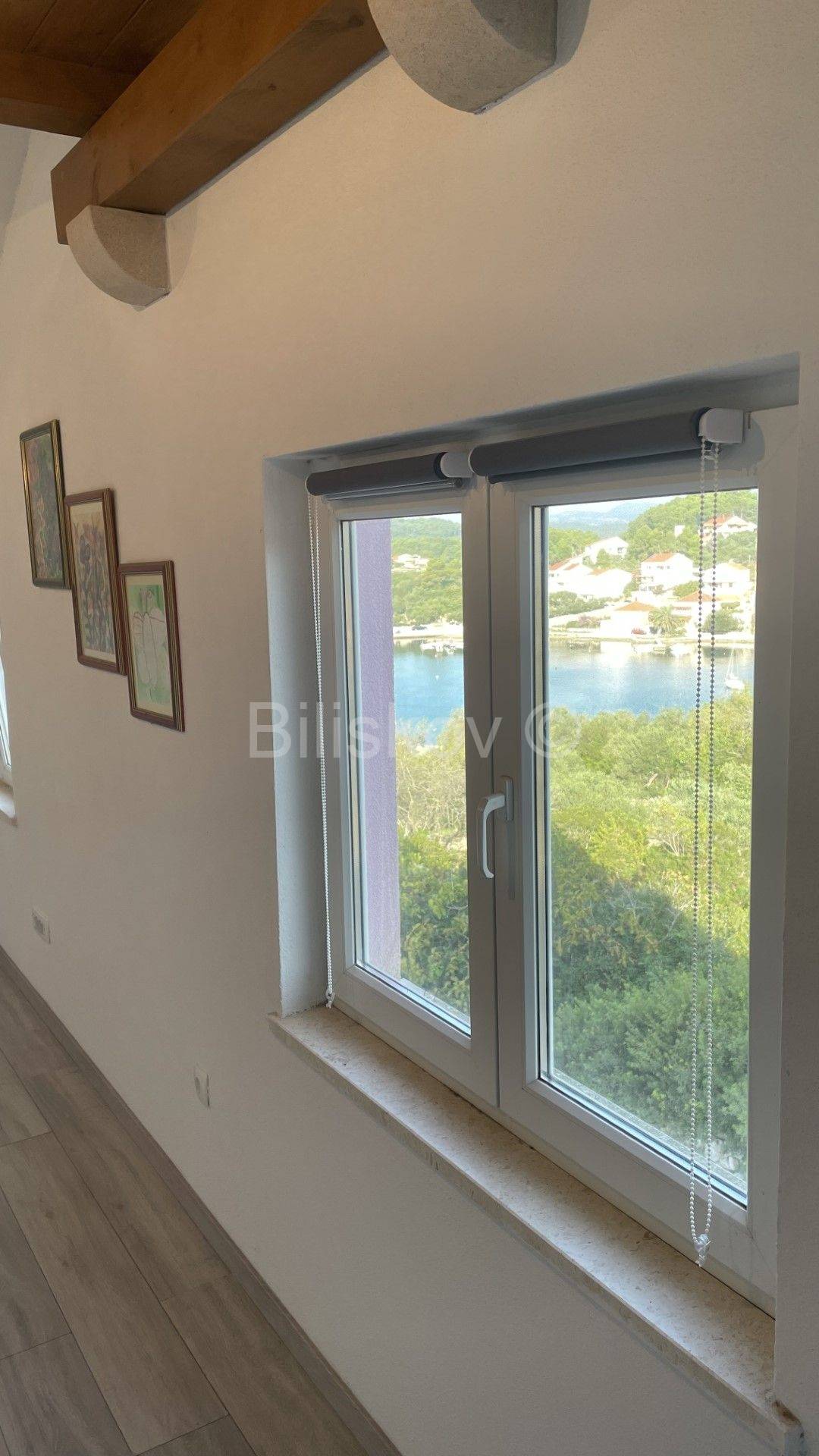 Na prvom katu se nalazi kuhinja s blagovaonicom i dnevnim boravkom kojeg staklena stjenka dijeli od prostranog balkona s kojeg se pruža otvoren pogled na cijelu uvalu, spavaća soba s kupaonicom, gostinjski WC i spremište. Na drugom katu se nalazi kuhinja, trpezarija s dnevnim boravkom, soba s kupaonicom, spremište i galerija površine 10m2 na kojoj je predviđena druga spavaća soba.