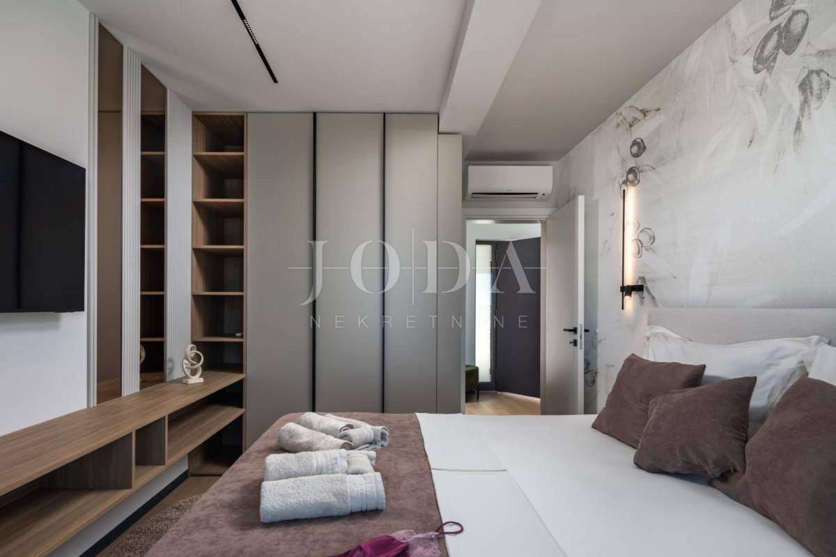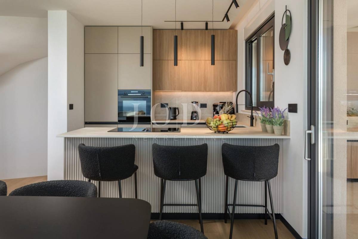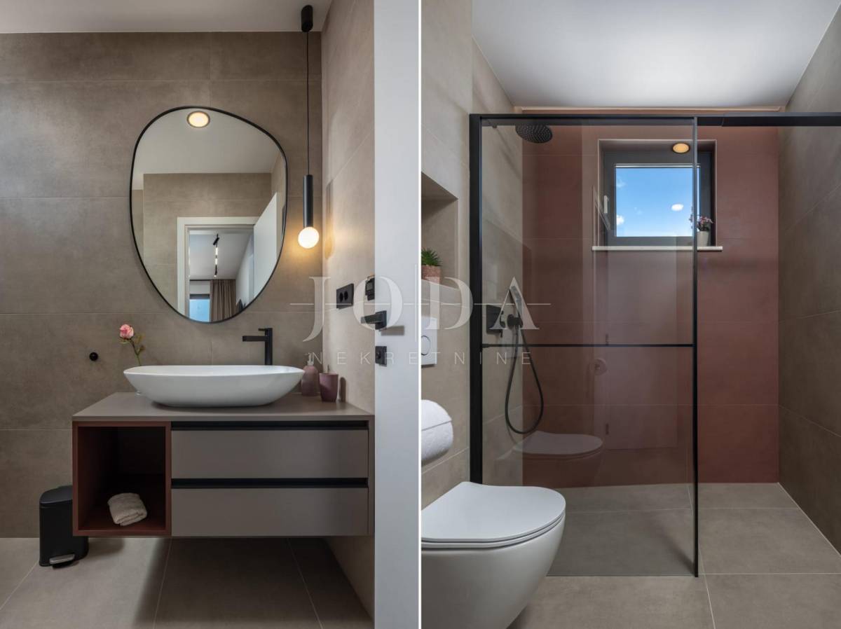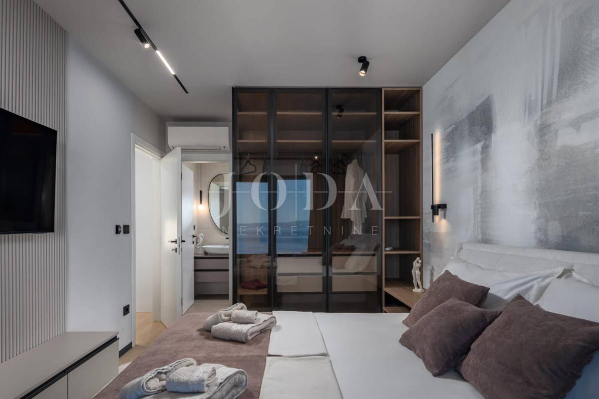 Na katu su smještene tri prostrane spavaće sobe, svaka s vlastitom kupaonicom i izlazom na balkon s otvorenim pogledom na more. Prostorije su moderno uređene i dizajnirane kako bi pružile maksimalnu udobnost i privatnost.