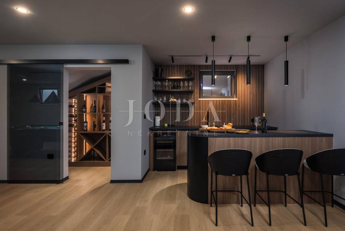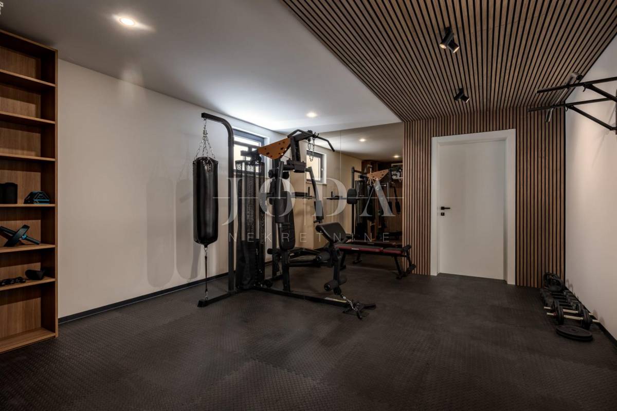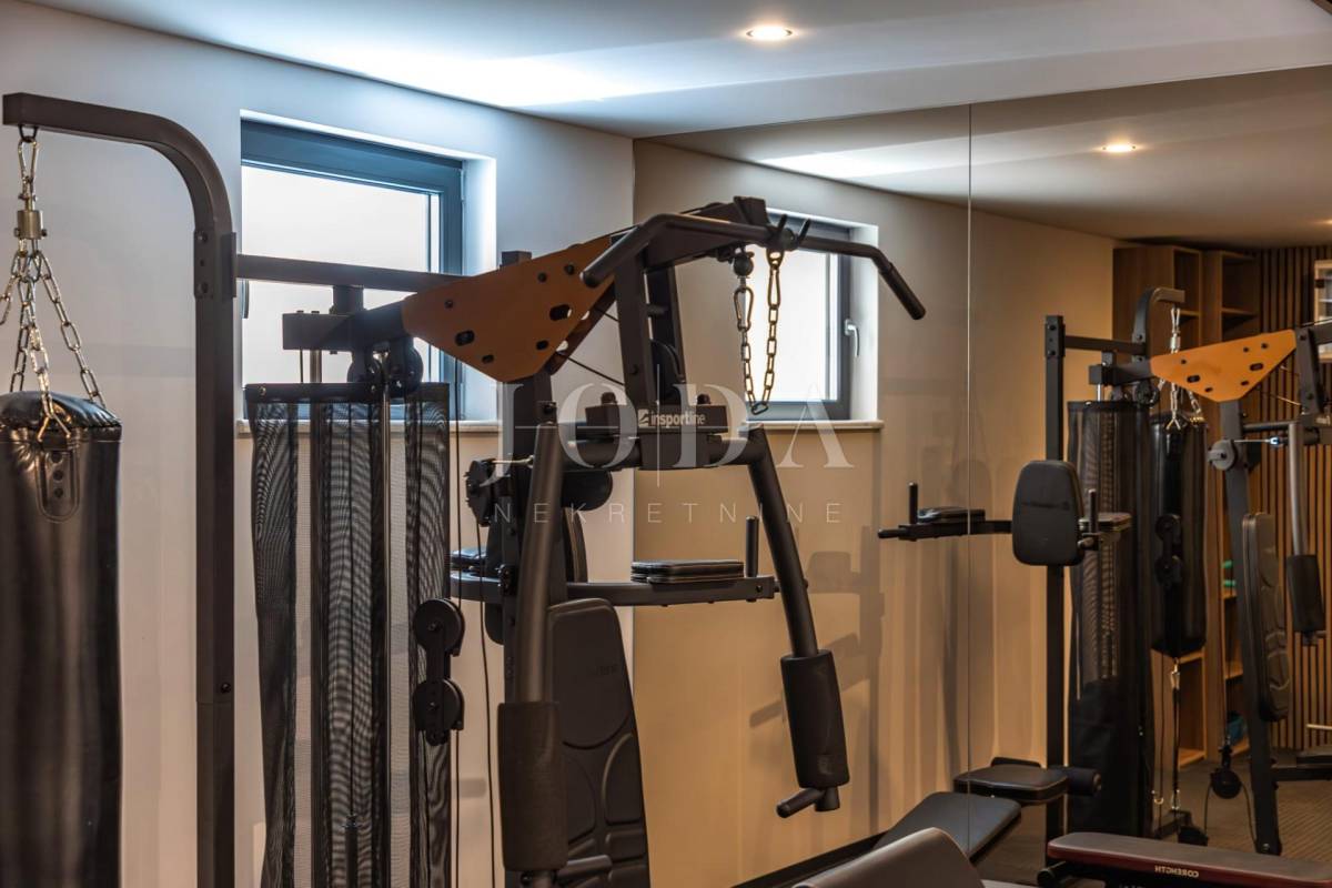 Ova moderna nekretnina prostire se na tri etaže – suteren, prizemlje i kat te nudi bogat sadržaj koji uključuje unutarnji i vanjski bazen, wellness zonu, saunu, teretanu i prostore za druženje i opuštanje.