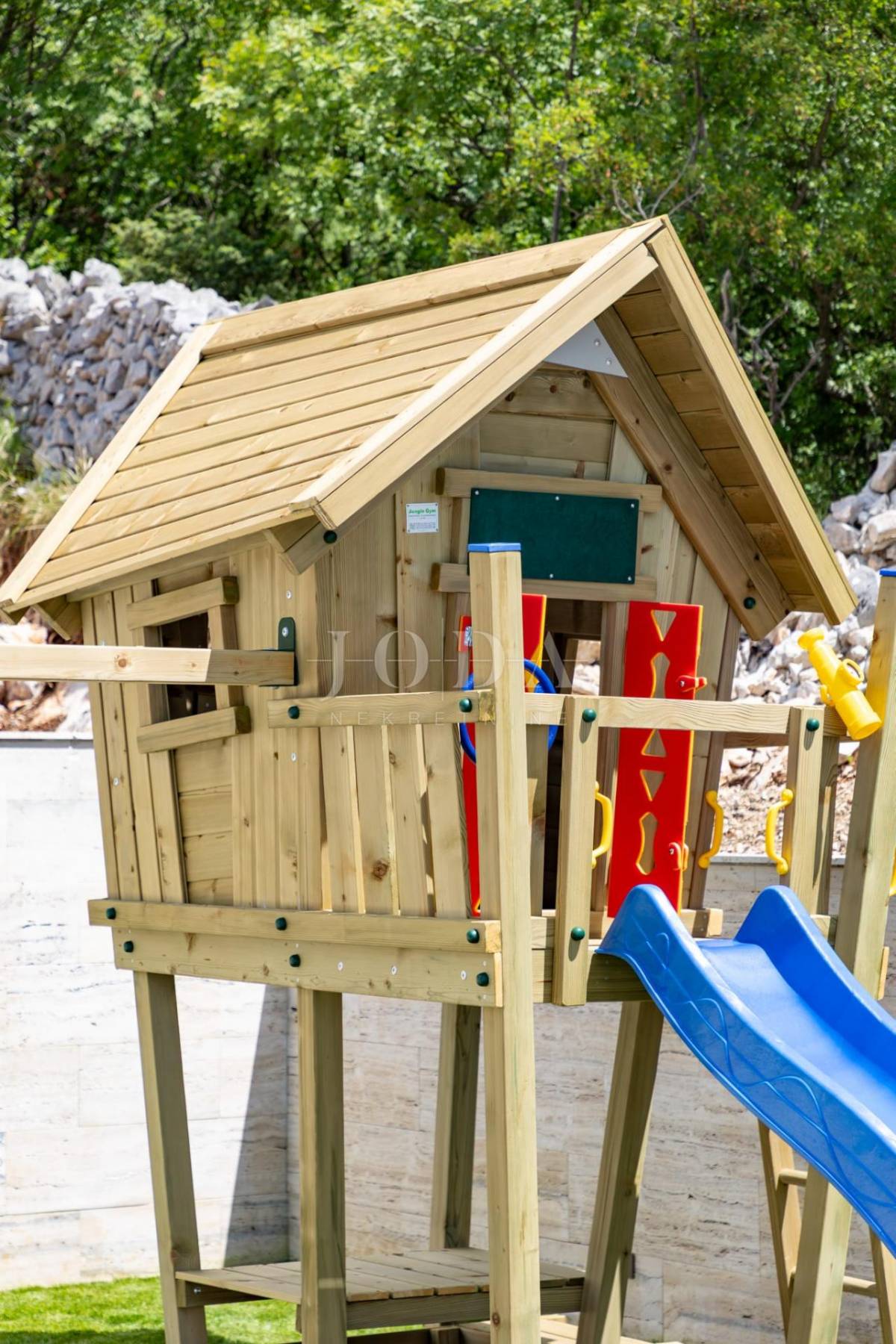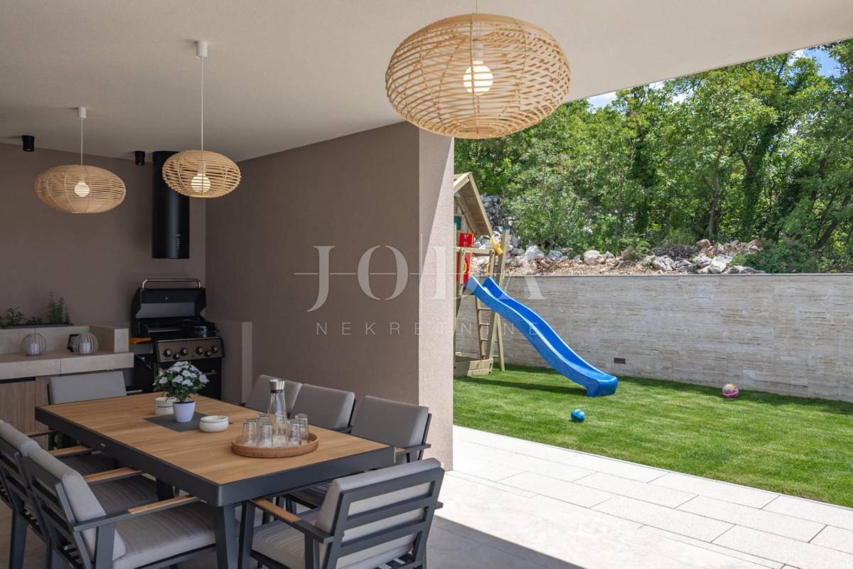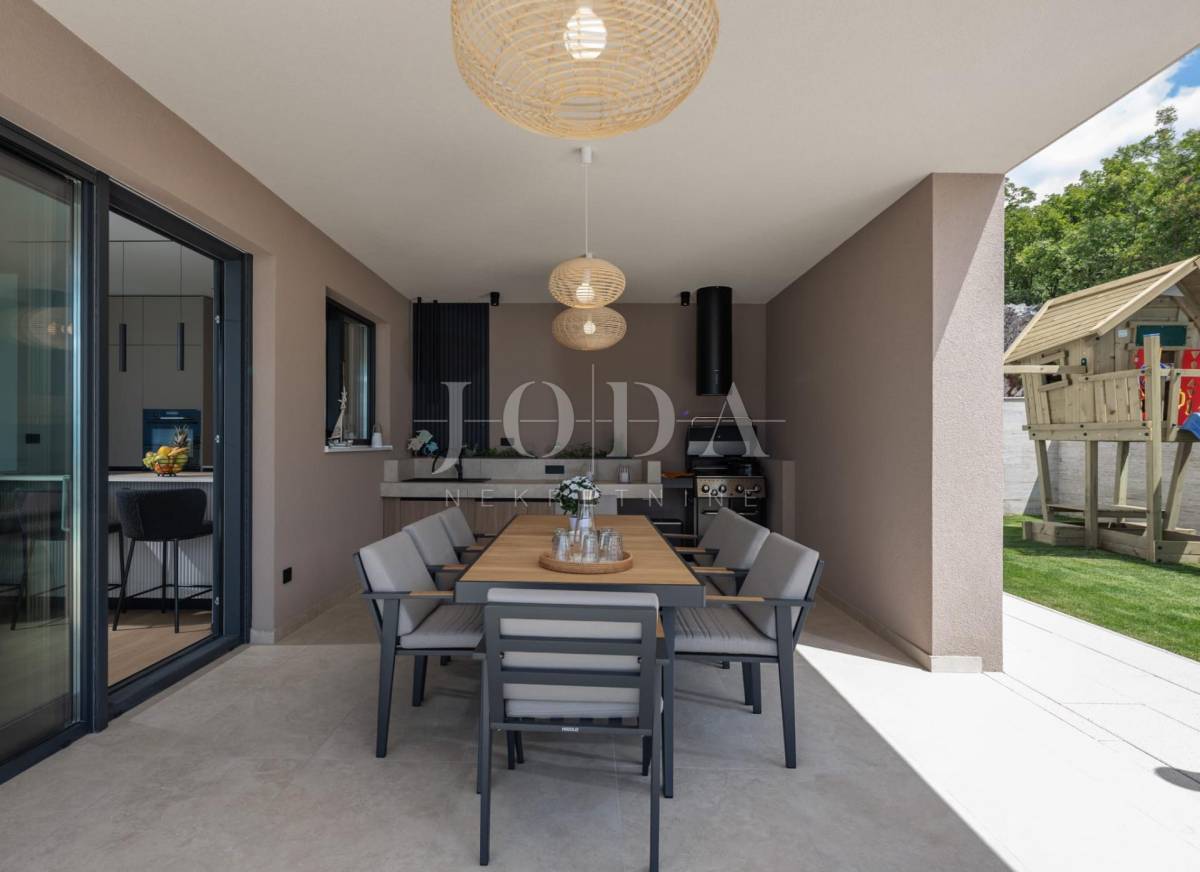 Pažljivo uređena okućnica nudi raznovrsne sadržaje za sve generacije – dječje igralište, terase za odmor, sunčalište uz bazen te privatni parking za pet vozila s instaliranim punjačem za električna vozila.