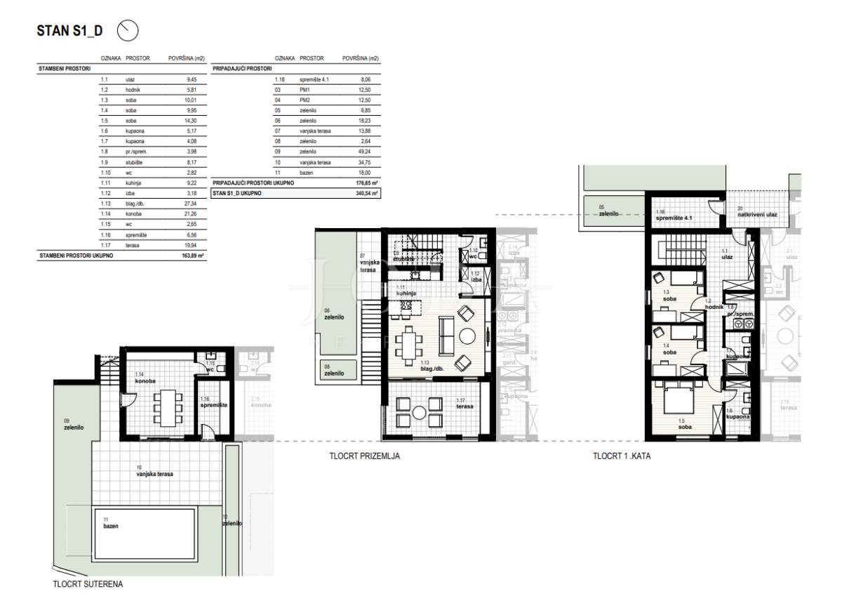 - dvije kupaonice, dva dodatna toaleta, hodnika i terase