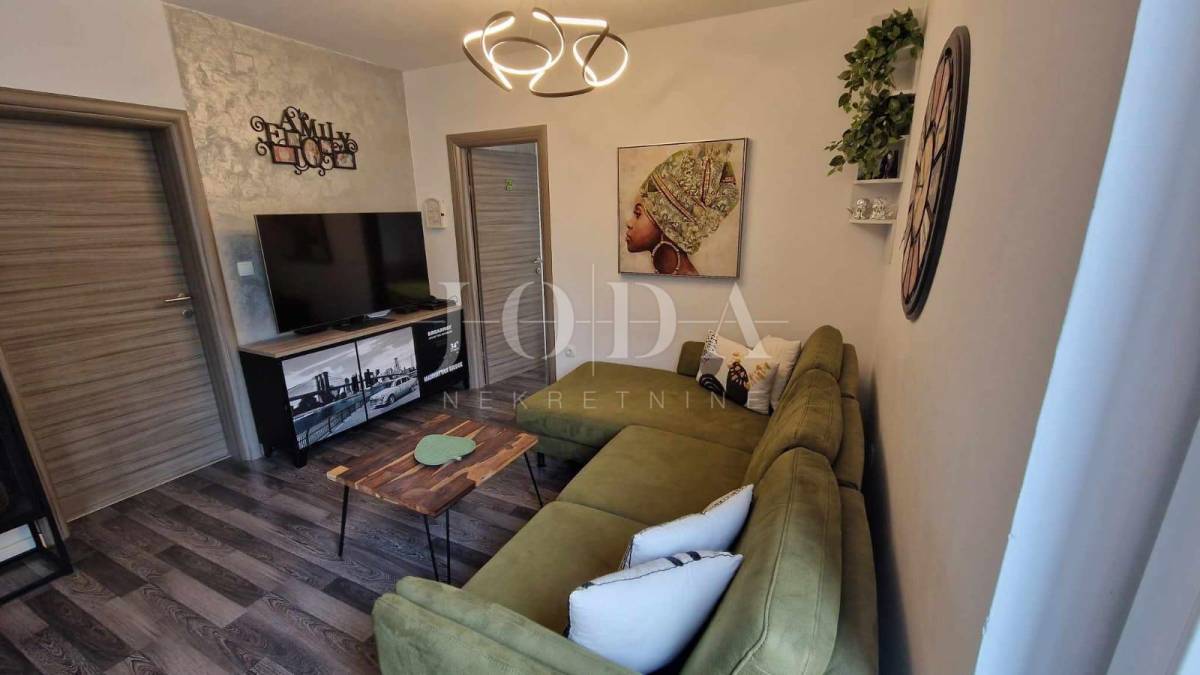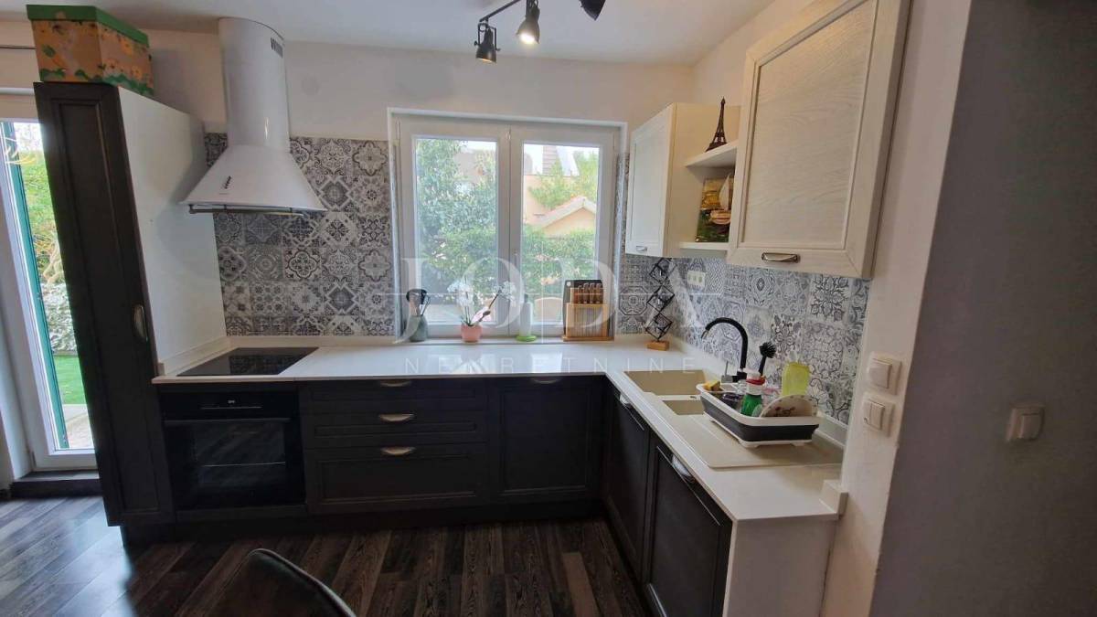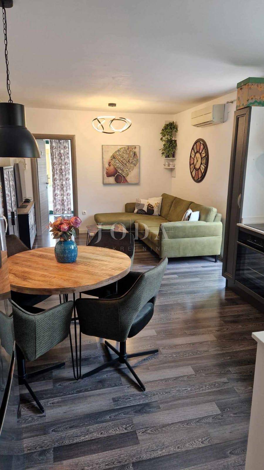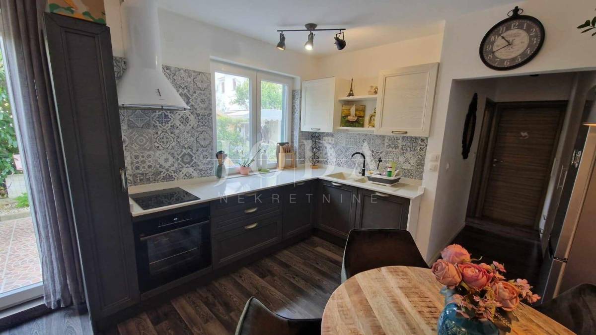 Apartman površine cca.55 m2 sastoji se od ulaznog prostora, dvije spavaće sobe, kupaonice, kuhinje s blagovaonicom i dnevnim boravkom koji ima izlaz na terasu površine 10 m2 i na okućnicu površine 30 m2, koja se može koristiti. Grijanje je putem klima uređaja. Prodaje se namješten. Ima jedno parkirno mjesto.
