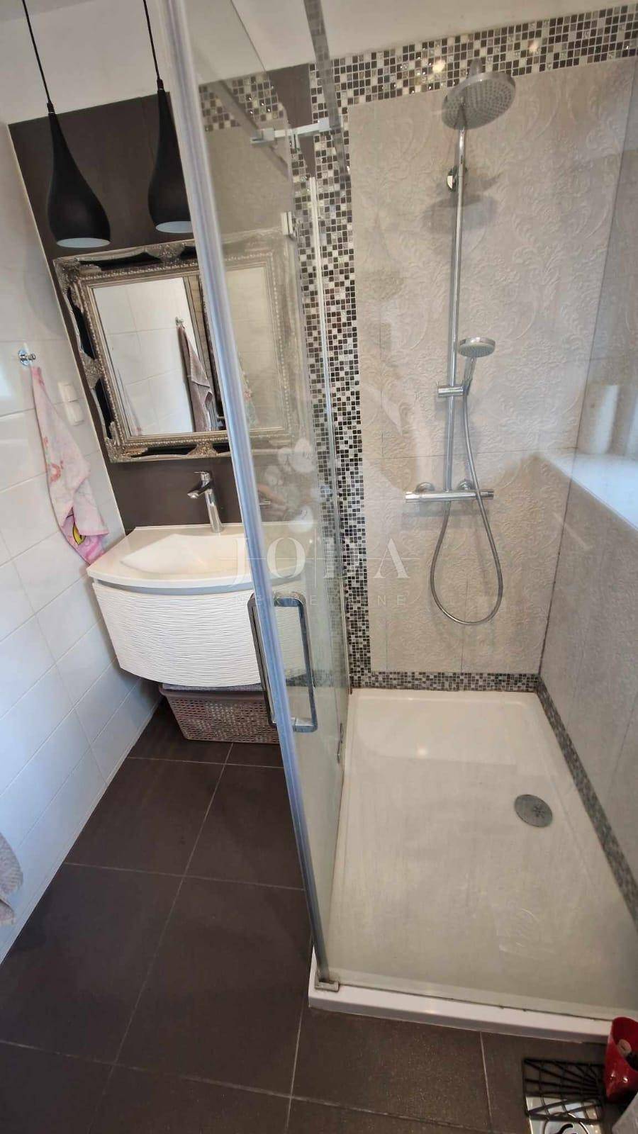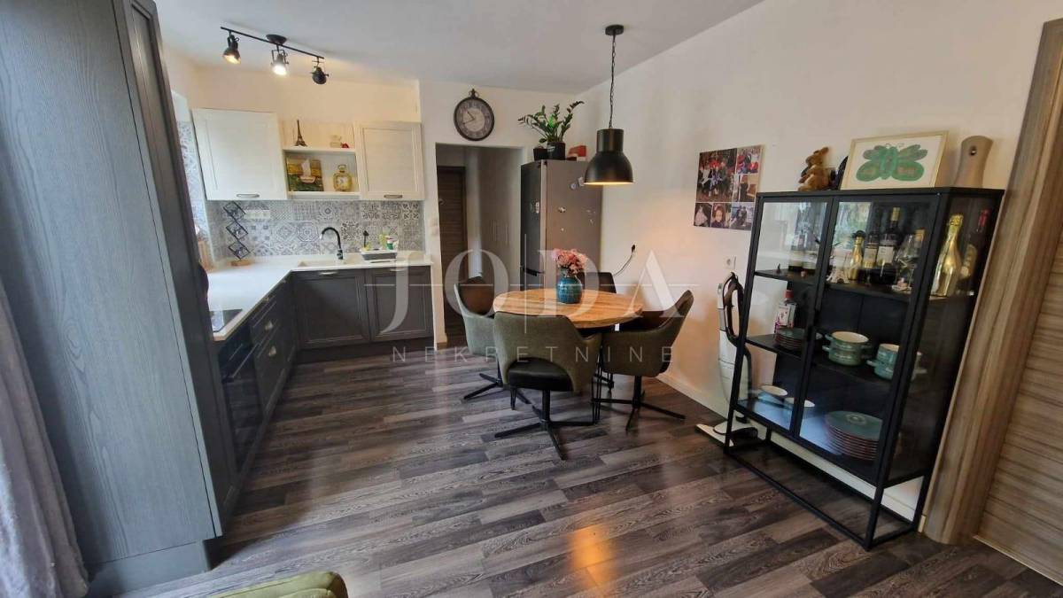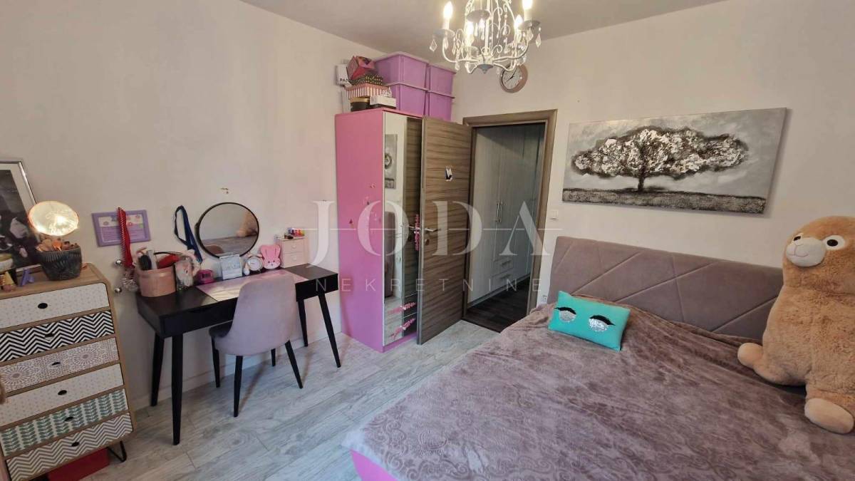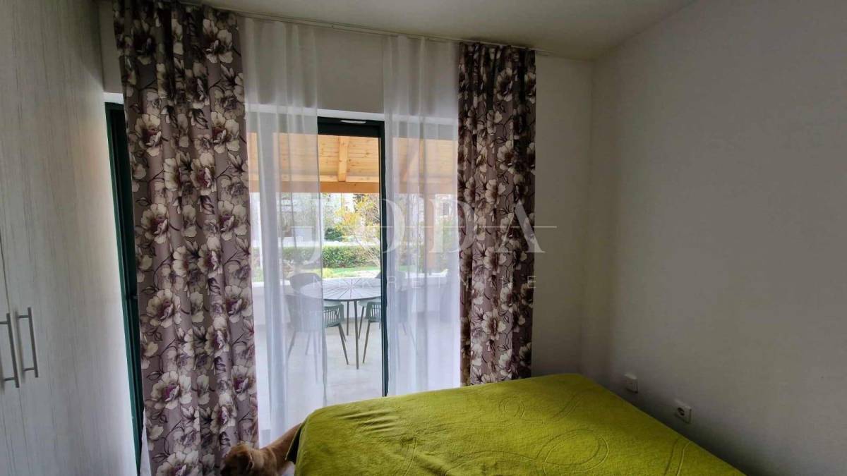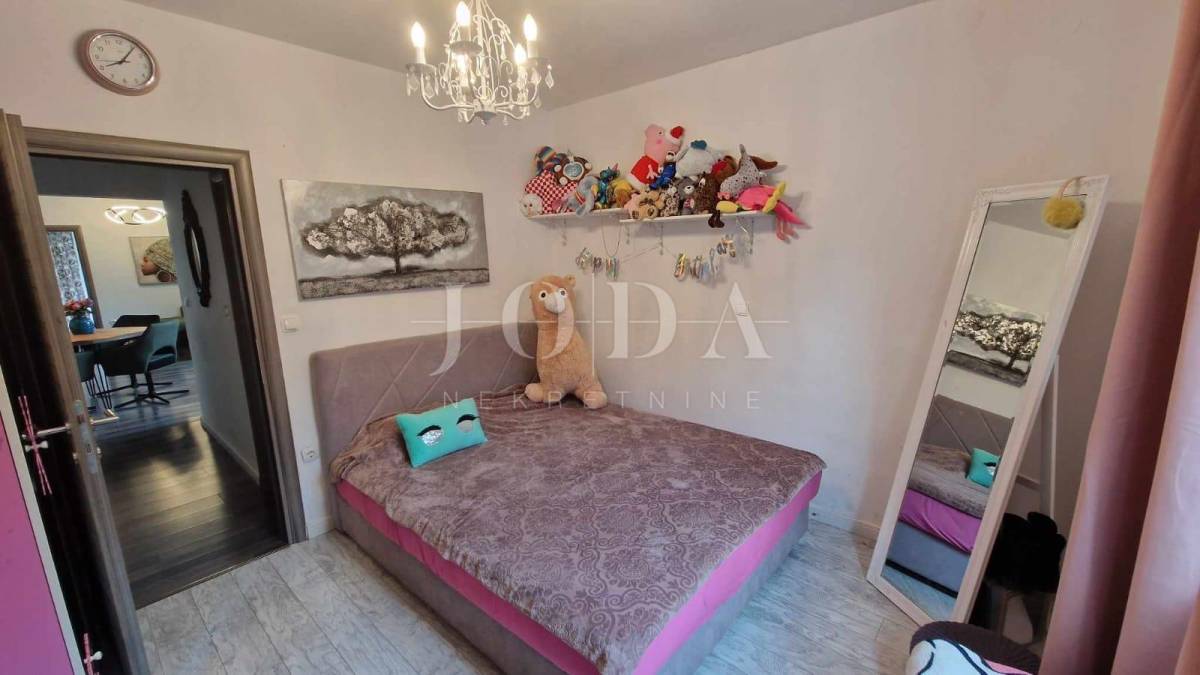 Apartman površine cca.55 m2 sastoji se od ulaznog prostora, dvije spavaće sobe, kupaonice, kuhinje s blagovaonicom i dnevnim boravkom koji ima izlaz na terasu površine 10 m2 i na okućnicu površine 30 m2, koja se može koristiti. Grijanje je putem klima uređaja. Prodaje se namješten. Ima jedno parkirno mjesto.