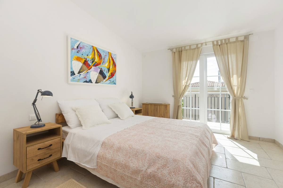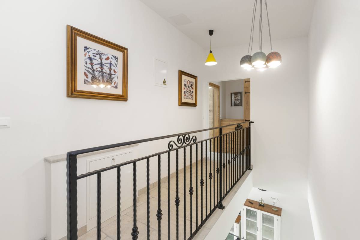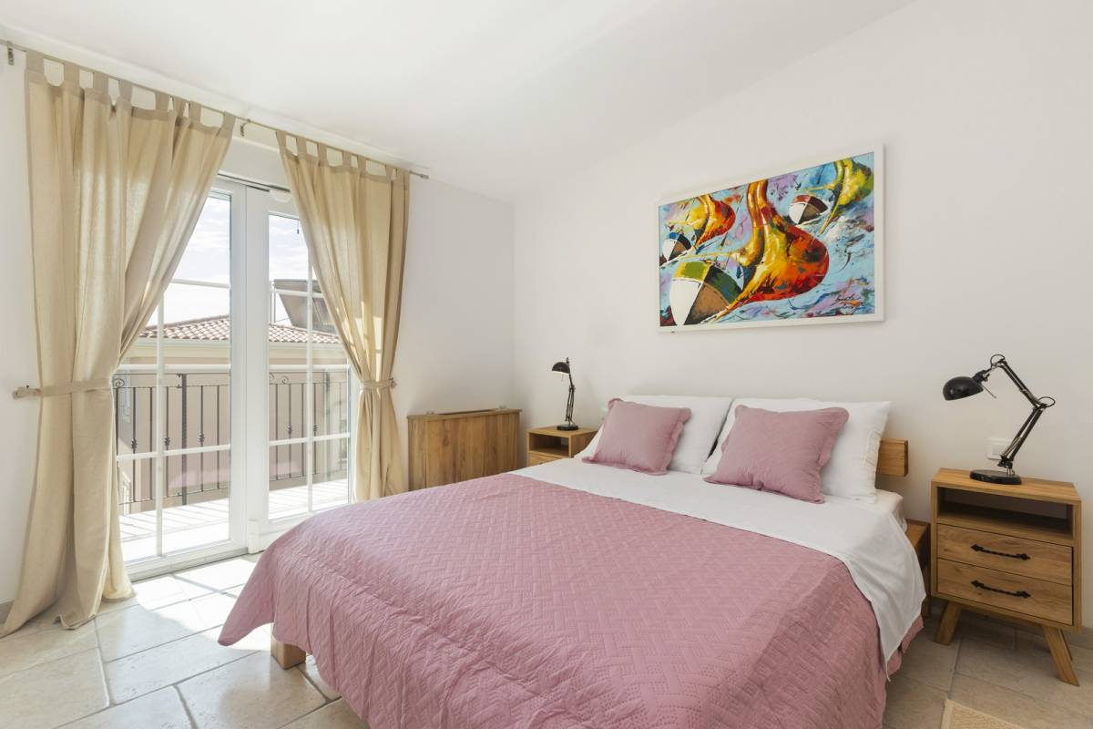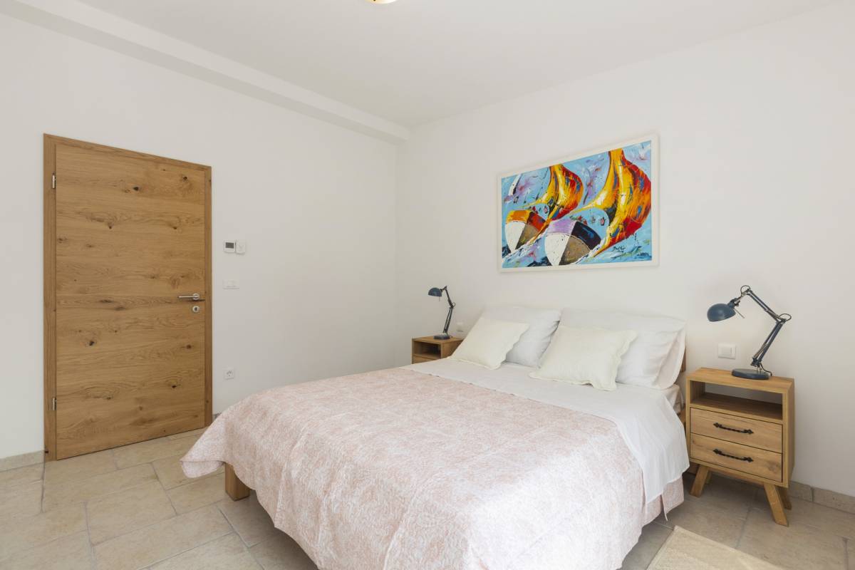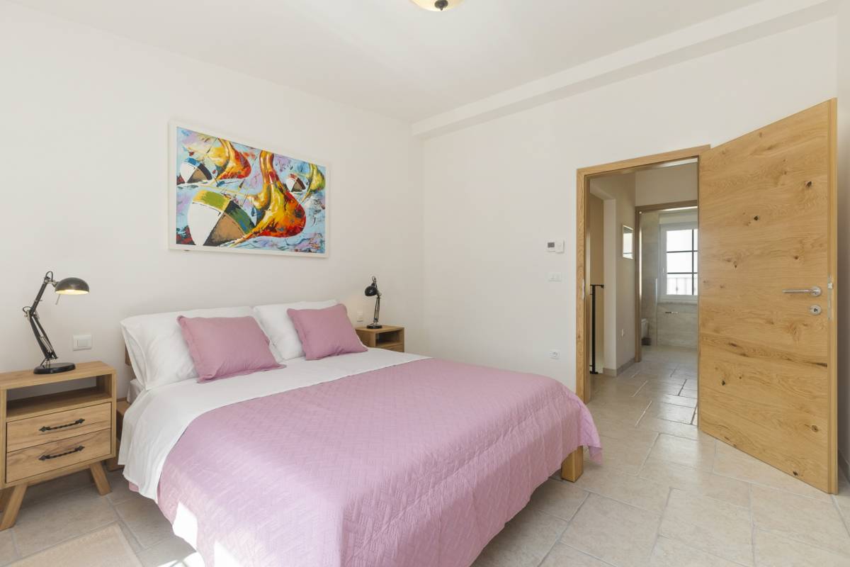 Na gornji kat vode unutarnje stepenice, a tu se nalaze dvije spavaće sobe sa zasebnim kupaonicama te izlazom na terasu s koje se pruža predivan pogled na more i okolicu. Kod glavnog ulaza u kuću nalazi se još jedna terasa. Strojarnica bazena dovoljne je veličine da može poslužiti i kao spremište.