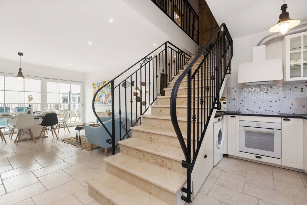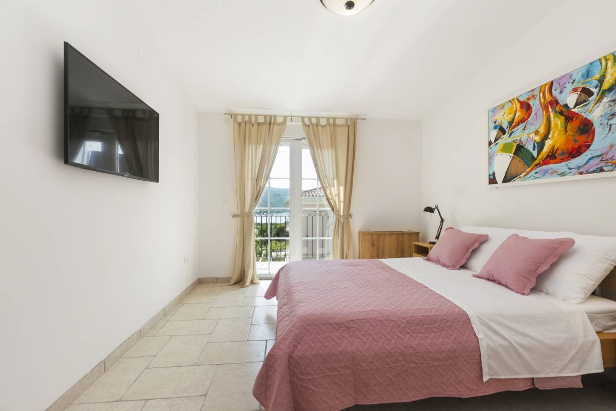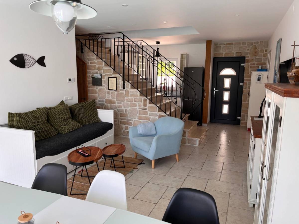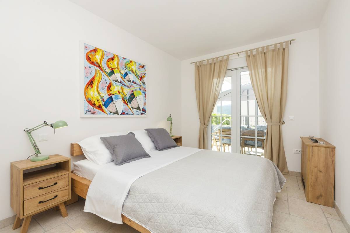 Na gornji kat vode unutarnje stepenice, a tu se nalaze dvije spavaće sobe sa zasebnim kupaonicama te izlazom na terasu s koje se pruža predivan pogled na more i okolicu. Kod glavnog ulaza u kuću nalazi se još jedna terasa. Strojarnica bazena dovoljne je veličine da može poslužiti i kao spremište.
