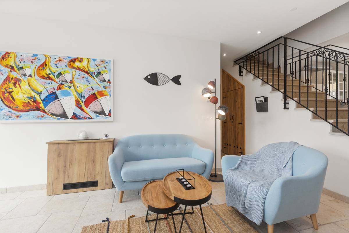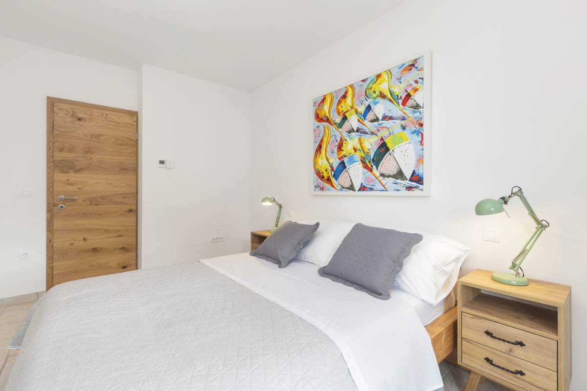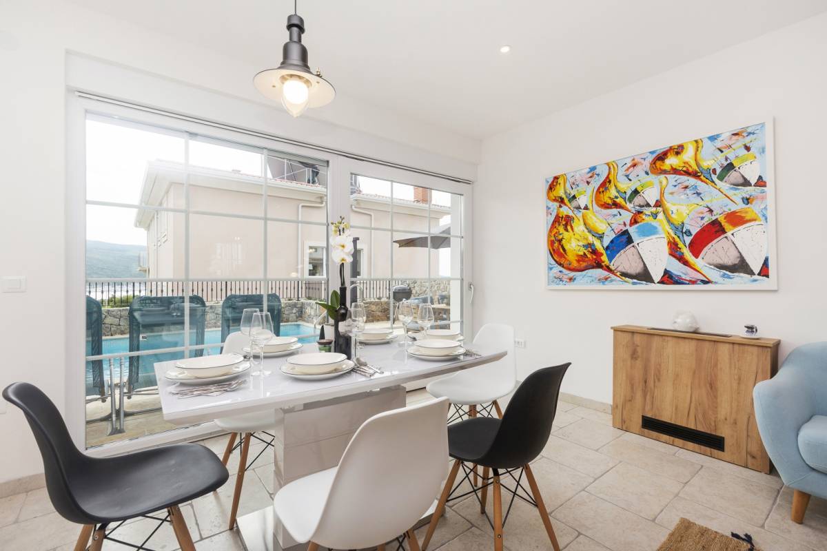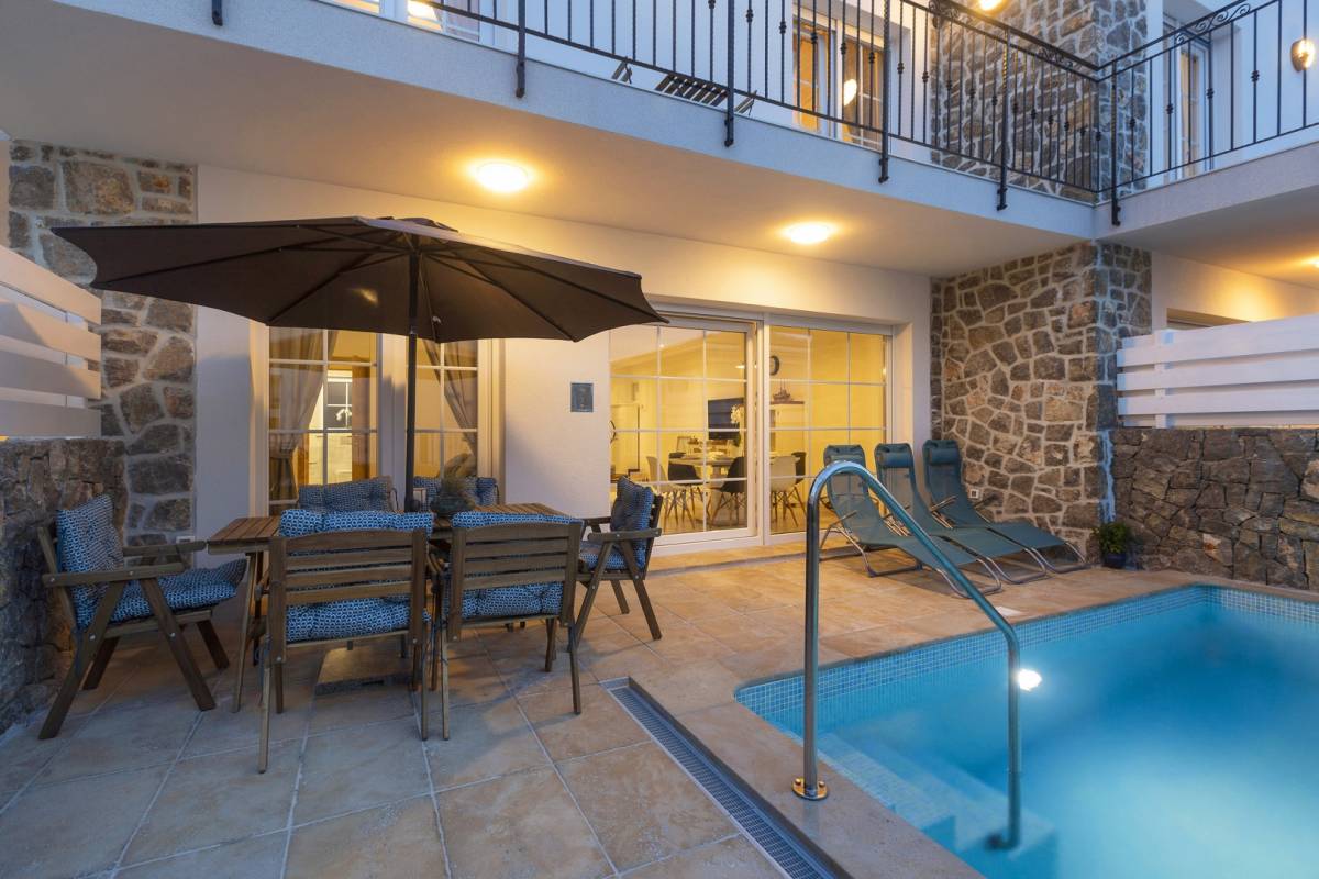 Ulaz u samu vilu vodi u dnevni boravak s blagovaonicom otvorenog prostora te funkcionalnu kuhinju. Na donjem se katu nalaze i hodnik, kupaonica te spavaća soba. Izlaz na prostranu terasu sa grijanim bazenom i sunčalištem vodi iz dnevnog boravka.
