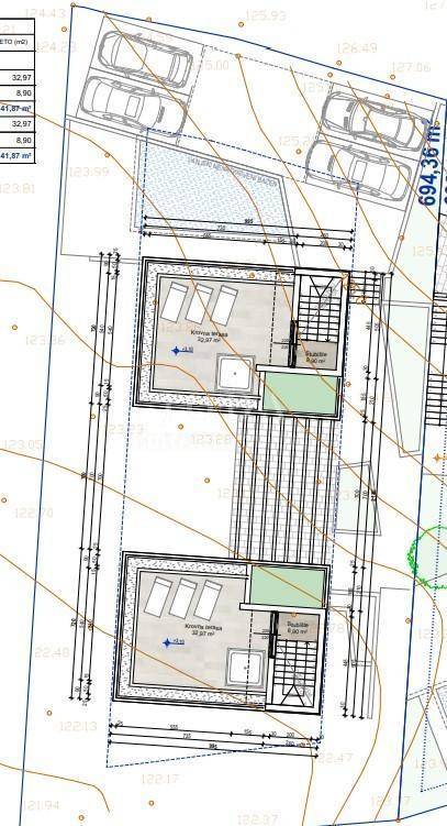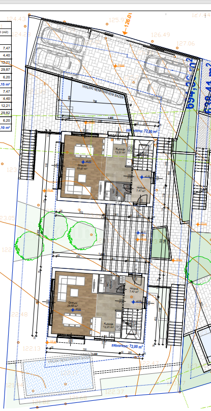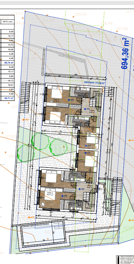 Dvojna kuća ukupne površine 146 m2 s cca. 250 m2 pripadajuće okućnice. Kuća je trenutno u izgradnji, a sastojat će se od tri etaže. U prizemlju će se nalaziti tri spavaće sobe, hodnik i dvije kupaone, spremište. Unutarnje stepenište vodi na kat, na kojemu je prostrani dnevni boravak, s kuhinjom i blagovaonom, hodnik i WC. Unutarnje stepenice vode na krovnu terasu s jacuzzijem. S krovne terase se pruža panoramski pogled na more. Na uređenoj okućnici je privatni bazen sa sunčalištem, ljetna kuhinja s roštiljem i dva parkirna mjesta.