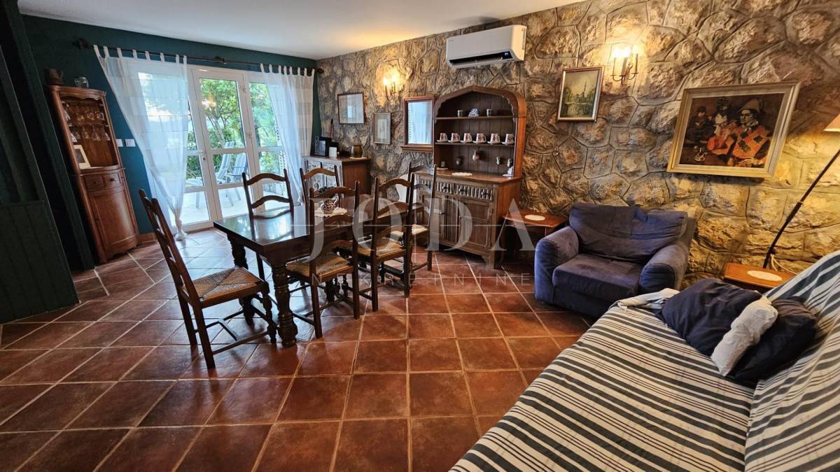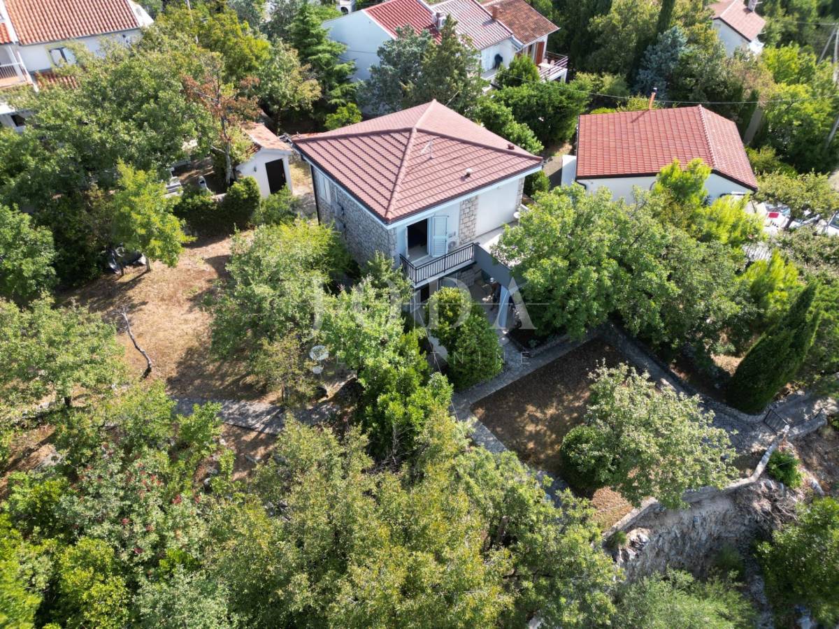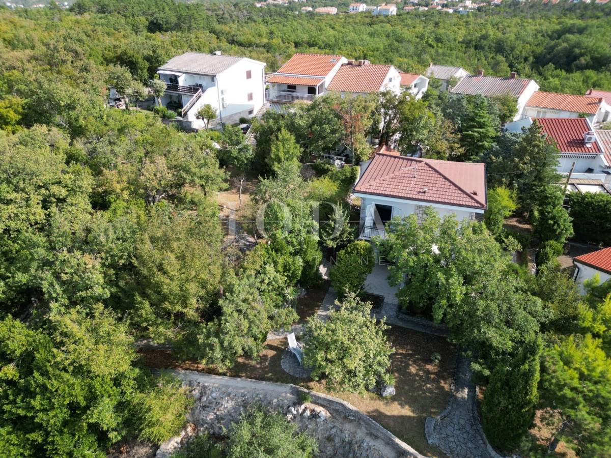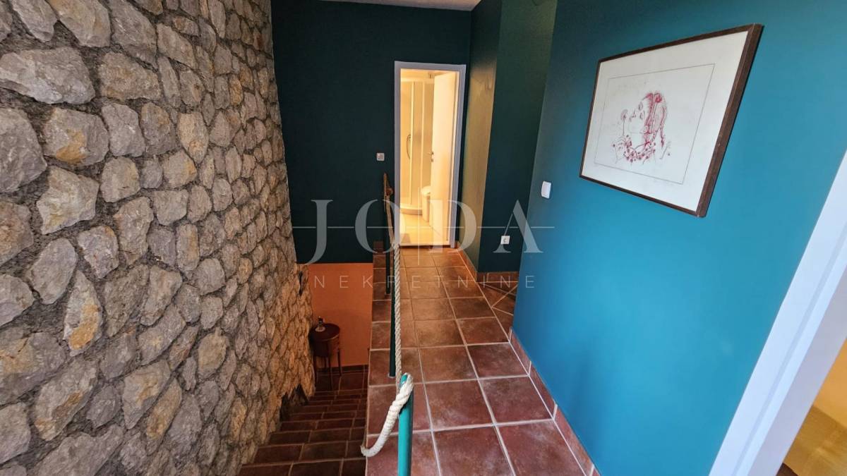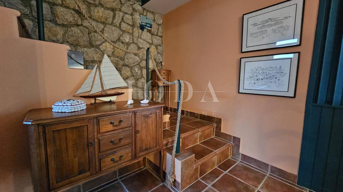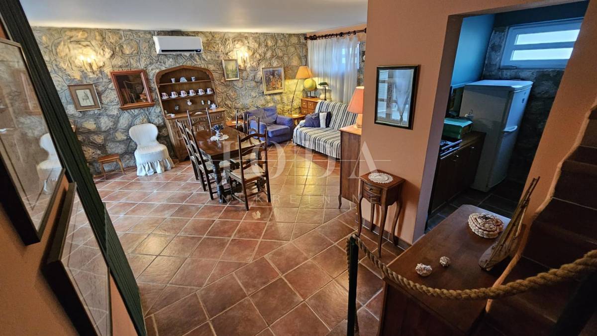 Kuća se sastoji od kuhinje, kupaonice, dnevnog boravka i blagovaonice (s izlazom na terasu i s pogledom na more) u prizemlju a na katu su smještene kupaonica, dvije veće spavaće sobe i jedna dječja soba. Iz prizemlja s izlazi na natkrivenu terasu a iz glavne spavače sobe na katu se izlazi na veliku terasu sa prekrasnim pogledom na Kvarner. Iza kuće se nalazi i spremište od 8m2 a ispod nje garaža (sa strujom i vodom) ispred koje stane još jedan automobil. Na prekrasno uređenoj okućnici koja nudi savršenu intimu i iznimno puno hlada smjestio se i veliki kameni roštilj s kamenim stolom za druženje.