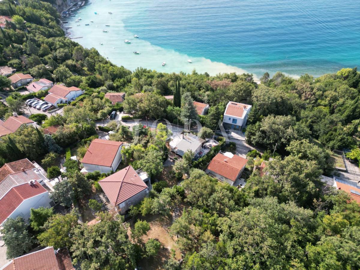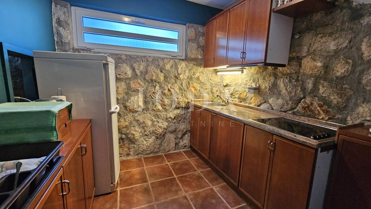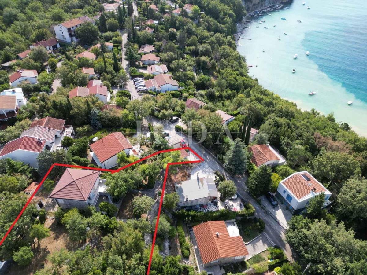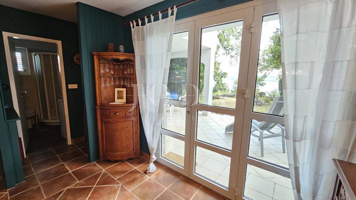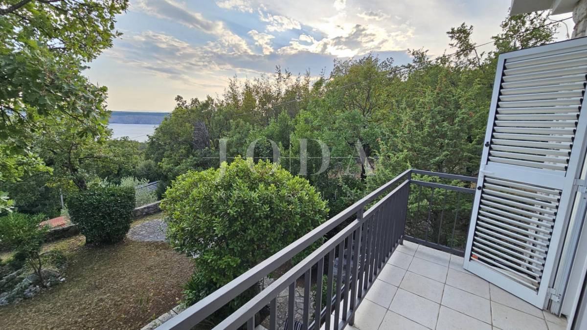 Kuća se sastoji od kuhinje, kupaonice, dnevnog boravka i blagovaonice (s izlazom na terasu i s pogledom na more) u prizemlju a na katu su smještene kupaonica, dvije veće spavaće sobe i jedna dječja soba. Iz prizemlja s izlazi na natkrivenu terasu a iz glavne spavače sobe na katu se izlazi na veliku terasu sa prekrasnim pogledom na Kvarner. Iza kuće se nalazi i spremište od 8m2 a ispod nje garaža (sa strujom i vodom) ispred koje stane još jedan automobil. Na prekrasno uređenoj okućnici koja nudi savršenu intimu i iznimno puno hlada smjestio se i veliki kameni roštilj s kamenim stolom za druženje.