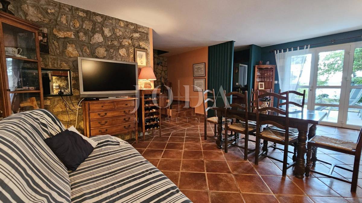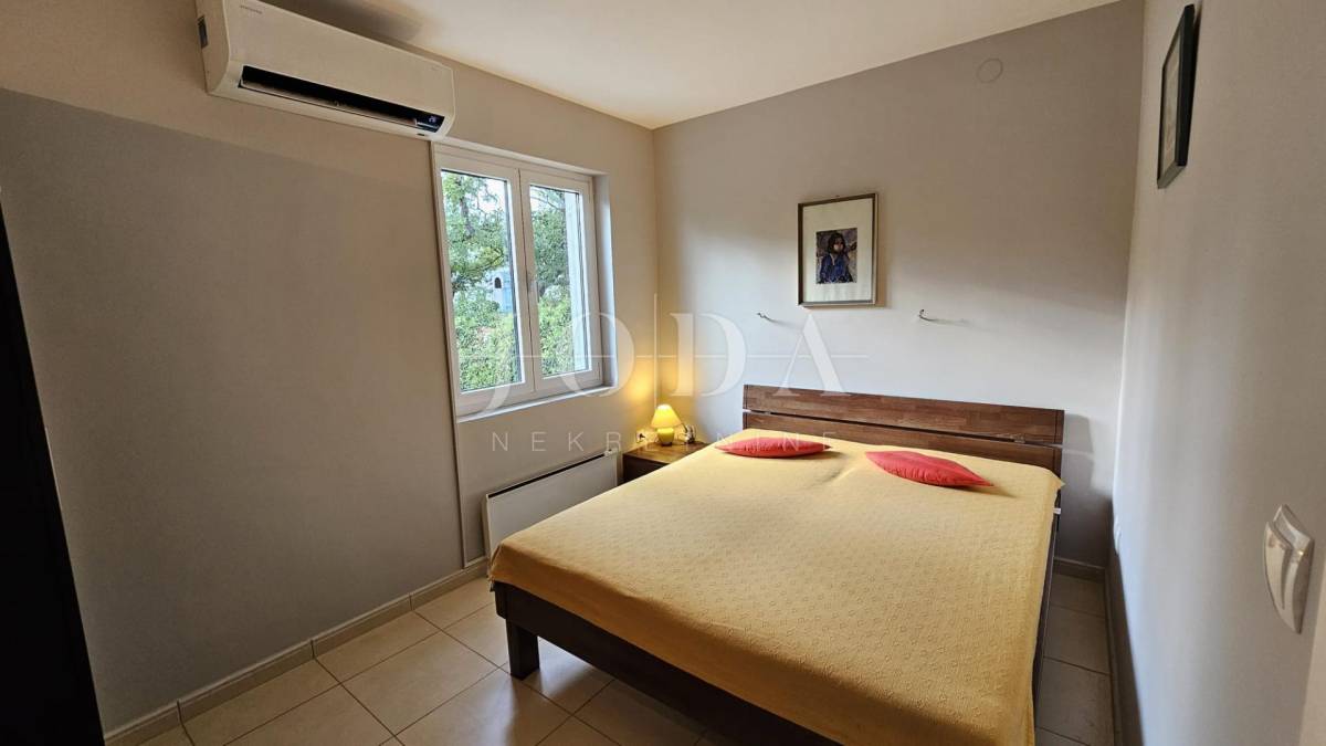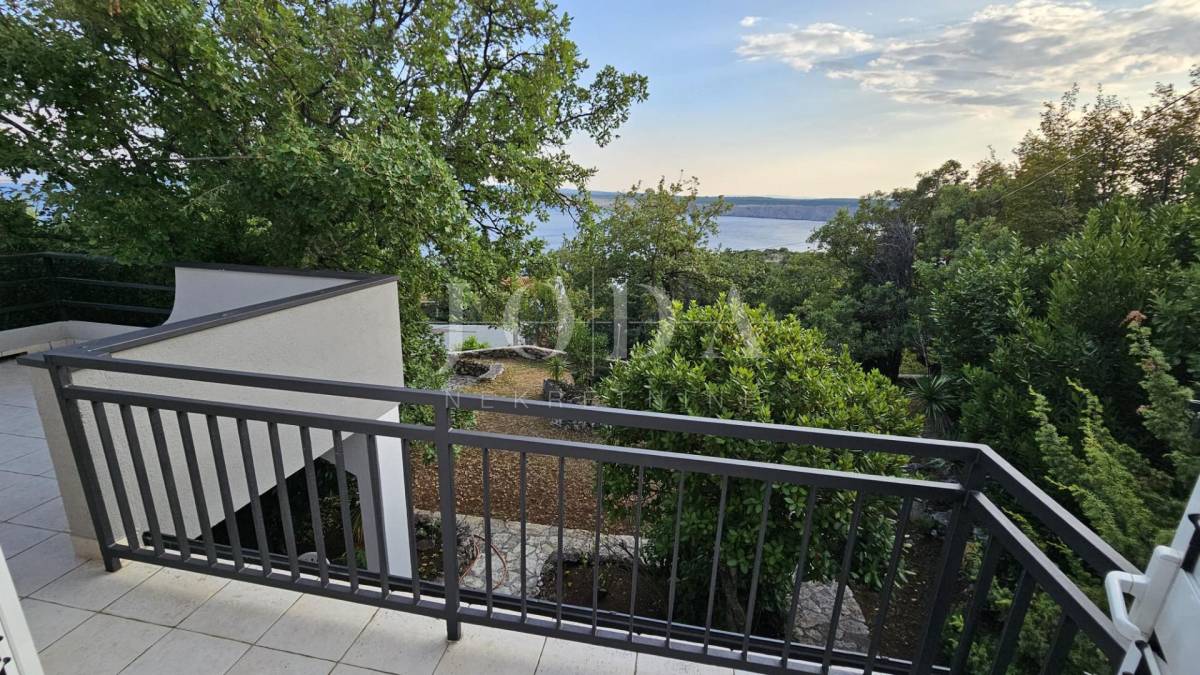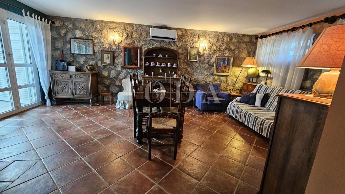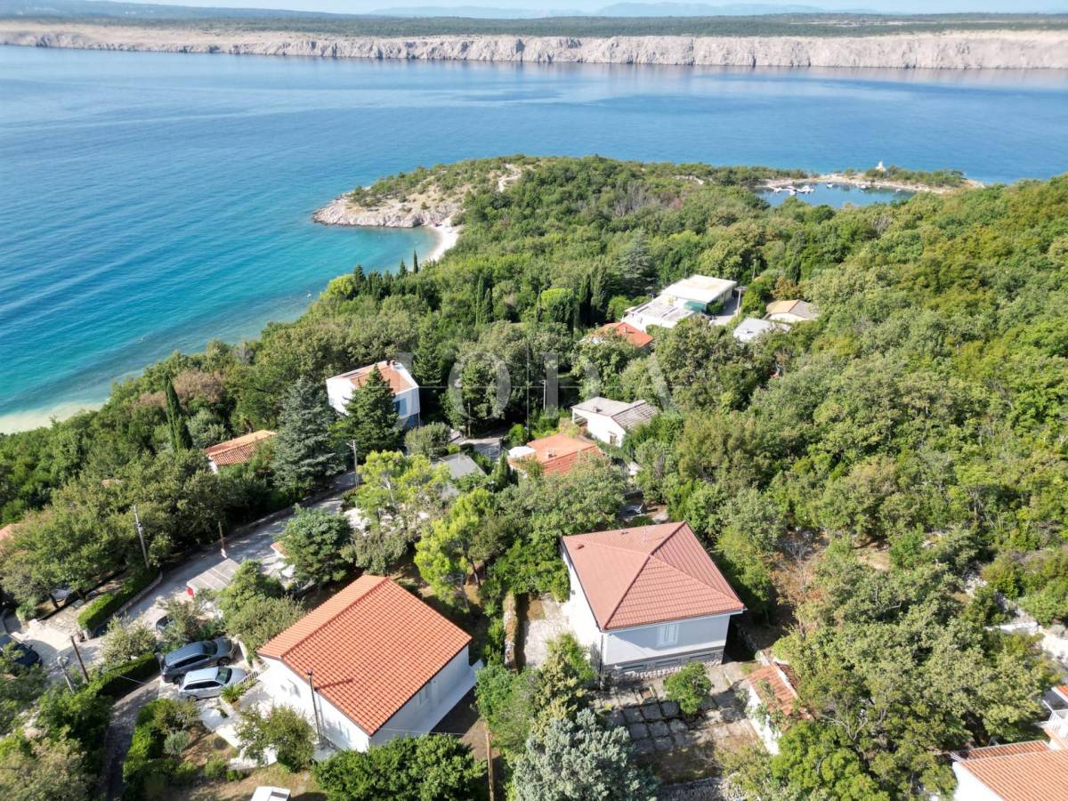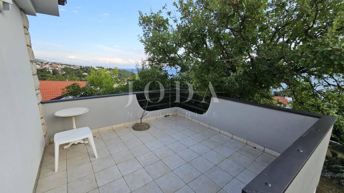 Kuća se sastoji od kuhinje, kupaonice, dnevnog boravka i blagovaonice (s izlazom na terasu i s pogledom na more) u prizemlju a na katu su smještene kupaonica, dvije veće spavaće sobe i jedna dječja soba. Iz prizemlja s izlazi na natkrivenu terasu a iz glavne spavače sobe na katu se izlazi na veliku terasu sa prekrasnim pogledom na Kvarner. Iza kuće se nalazi i spremište od 8m2 a ispod nje garaža (sa strujom i vodom) ispred koje stane još jedan automobil. Na prekrasno uređenoj okućnici koja nudi savršenu intimu i iznimno puno hlada smjestio se i veliki kameni roštilj s kamenim stolom za druženje.