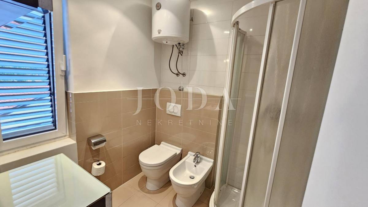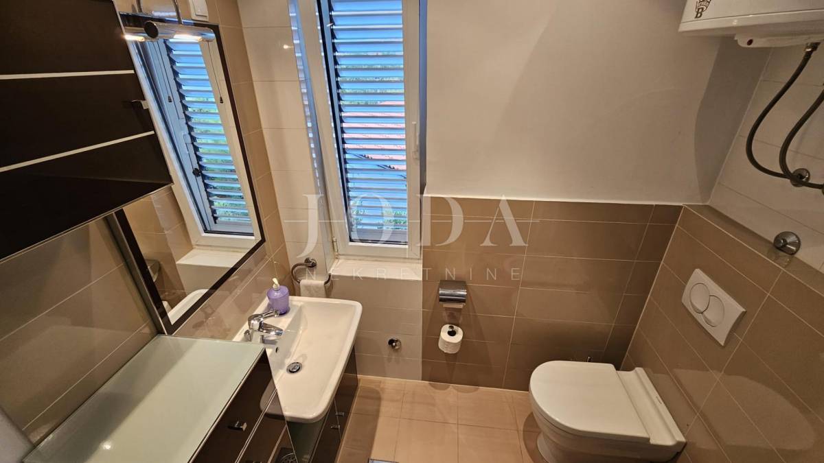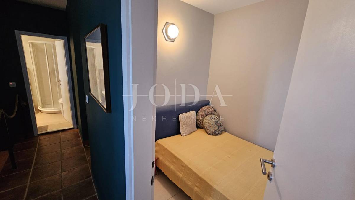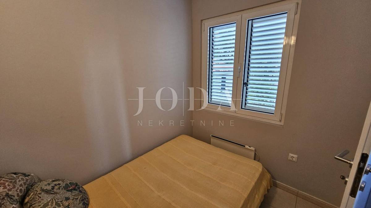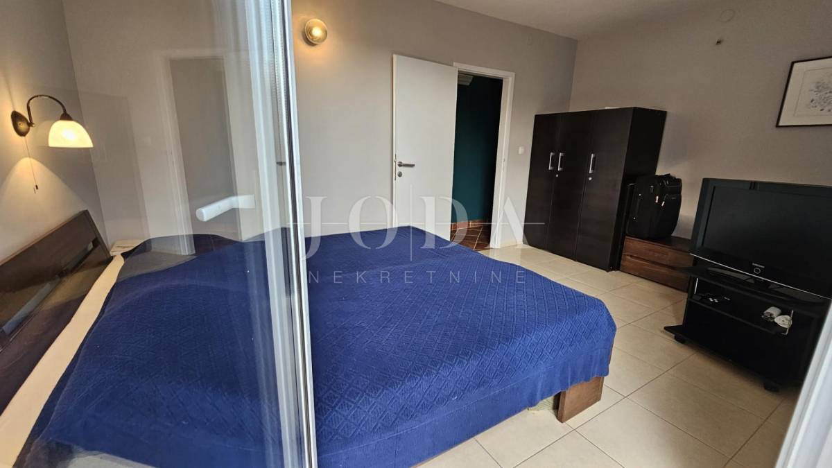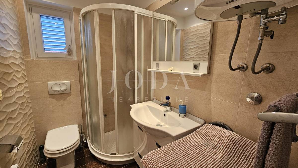 Kuća se sastoji od kuhinje, kupaonice, dnevnog boravka i blagovaonice (s izlazom na terasu i s pogledom na more) u prizemlju a na katu su smještene kupaonica, dvije veće spavaće sobe i jedna dječja soba. Iz prizemlja s izlazi na natkrivenu terasu a iz glavne spavače sobe na katu se izlazi na veliku terasu sa prekrasnim pogledom na Kvarner. Iza kuće se nalazi i spremište od 8m2 a ispod nje garaža (sa strujom i vodom) ispred koje stane još jedan automobil. Na prekrasno uređenoj okućnici koja nudi savršenu intimu i iznimno puno hlada smjestio se i veliki kameni roštilj s kamenim stolom za druženje.