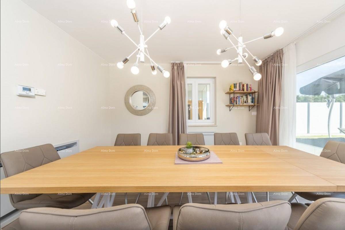Prodajemo prekrasnu novogradnju sa šest spavaćih soba , četiri kupaonice (1 kada, 3 tuš kabine), kuhinjom sa blagovaonicom za dvanaest osoba, velikim dnevnim boravkom. Kuća ima veliku okućnicu sa grijanim bazenom veličine 26,5 m2 sa slapom i masažnim pumpama, jacuzzi, sauna, dječje igralište, trampolin, roštilj....kuća se iznajmljuje u turističke svrhe i opremljena je sa svim potrebnim sadržajima, te se kao takva i prodaje. Grijanje/hlađenje na dizalice topline. Sve prostorije su klimatizirane. Kvalitetna gradnja i unutarnje uređenje, mirna lokacija idealna za savršeni odmor.