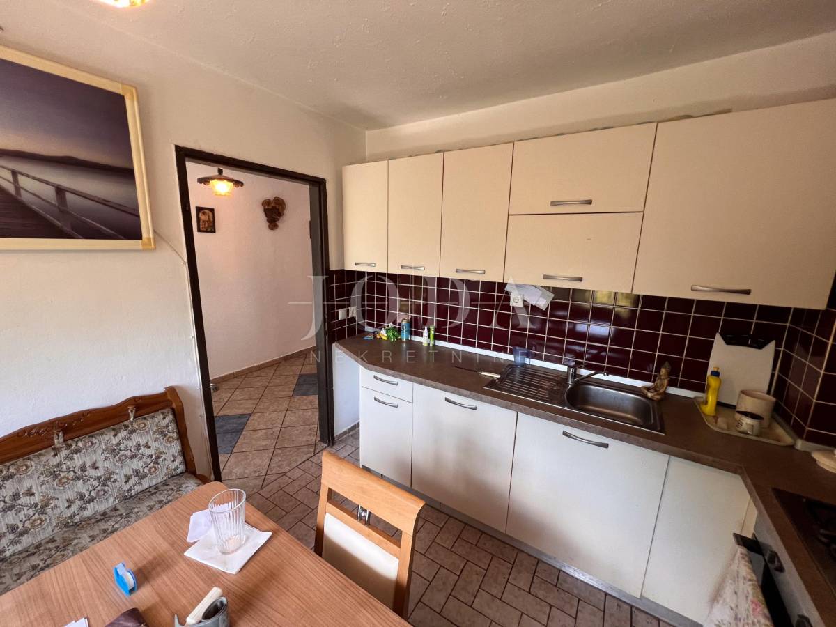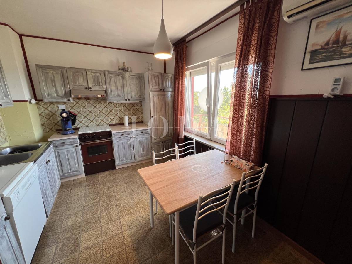 Stan na prvom katu se sastoji od dvije spavaće sobe, dnevnog boravka, kuhinje sa blagavaonicom, kupaonice, hodnika i balkona na koji se izlazi iz dnevnog boravka. Sa balkona se pruža prekrasan pogled na more, otok Krk, Velebit i Učku. Stan je uređen, namješten i u dobrom je stanju.