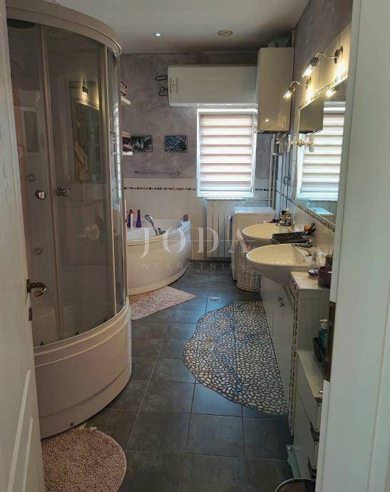 Velika kupaonica opremljena je s dva umivaonika, masažnom tuš kabinom s ugrađenim radiom, jacuzzi kadom, wc-om i perilcom rublja.