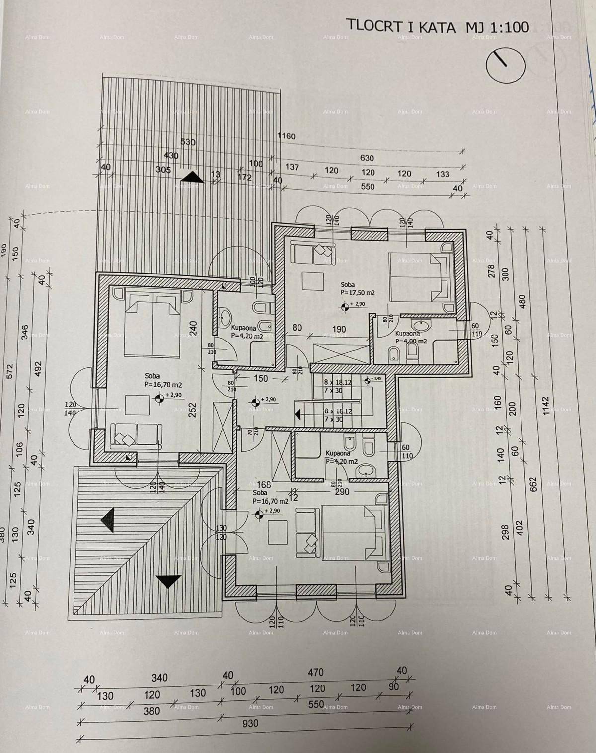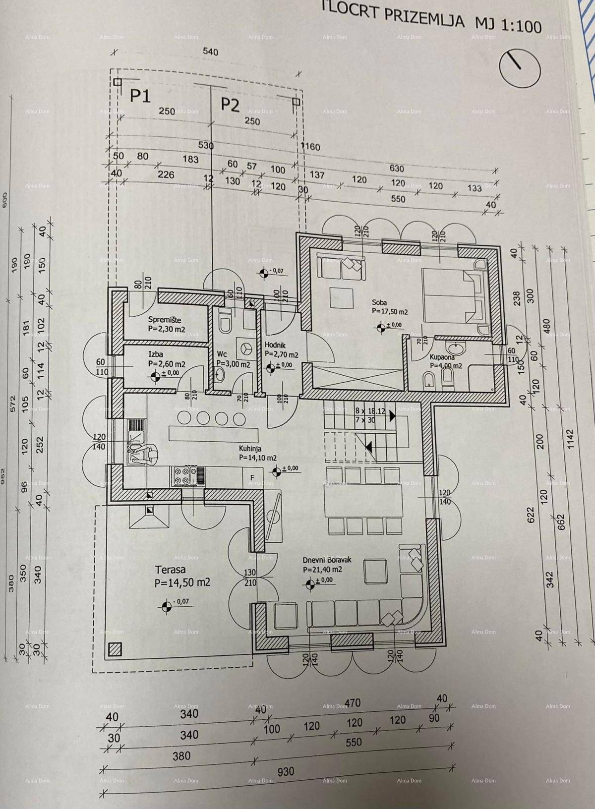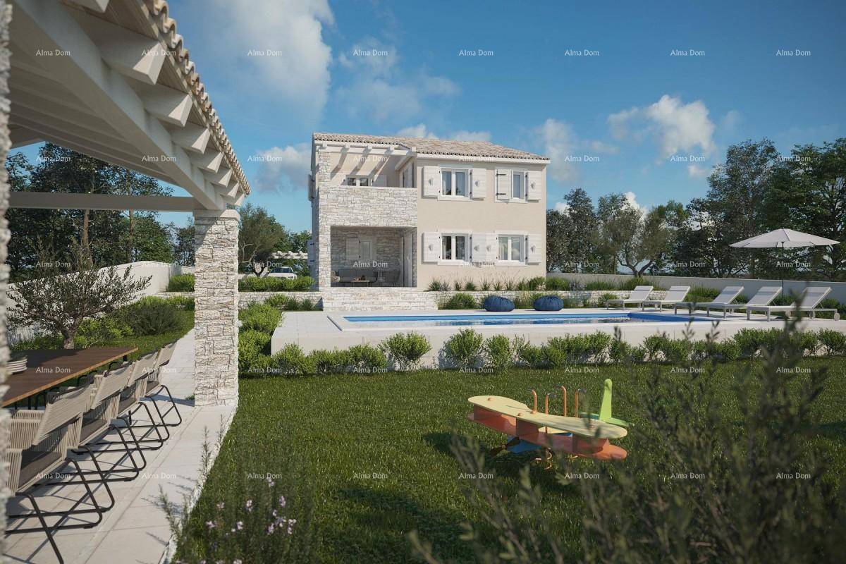 Na zemljištu veličine 998m2 smještena je kuća površine 195m2, u prizemlju se nalazi prostrani dnevni boravak sa kuhinjom i blagavaonom, ostava, mali wc te jedna spavaća soba sa vlastitom kupaonicom, na katu se nalaze 3 spavaće sobe svaka sa svojom kupaonicom i izlaskom na terasu,bazen veličine 37m2, ljetna kuhinja i sjenica veličine 24m2.