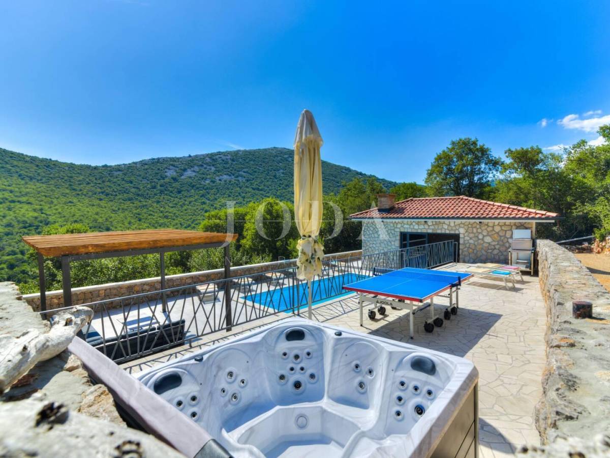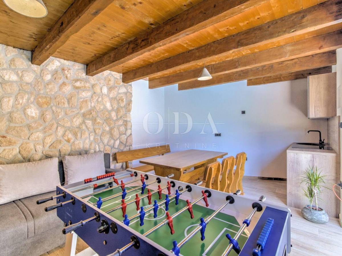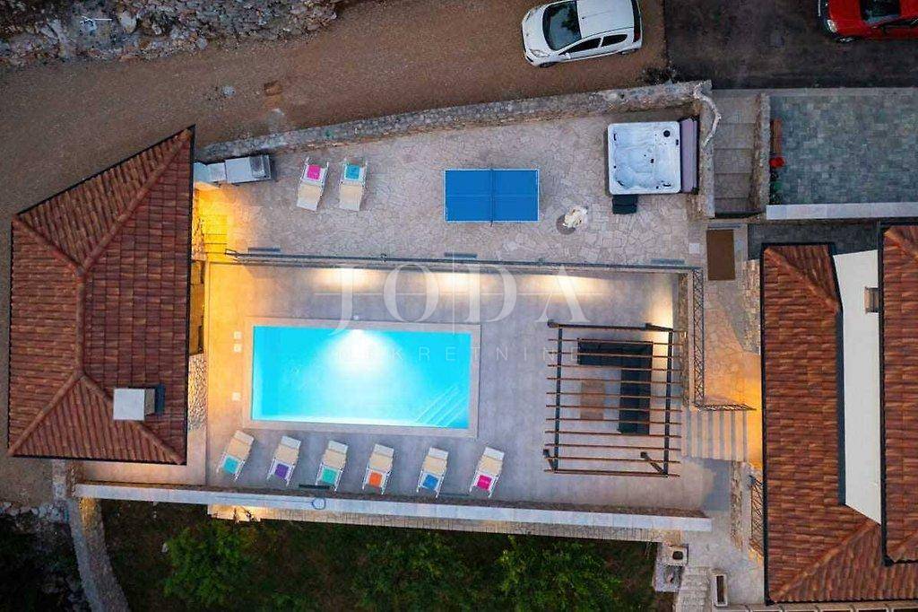 Na bočnom dijelu popločane okućnice su bazen sa sunčalištem,veliki roštilj,prostor za druženje i pomoćni objekt koji je opremljen kao studio apartman.