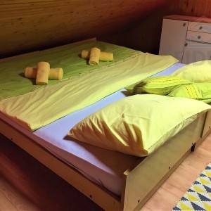 Na katu se nalaze 3 spavaće sobe i kupaonica dok se u potkrovlju nalazi soba s 4 ležaja.