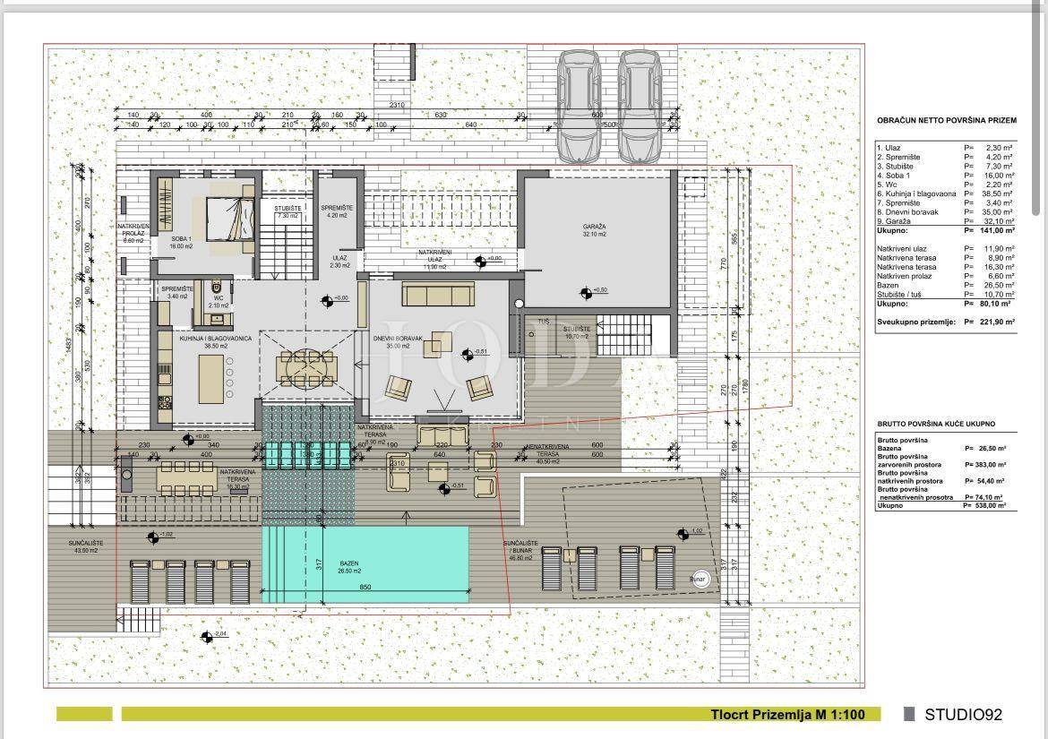 U prizemlju se nalazi kuhinja sa blagovaonom i dnevnim boravkom, spavaća soba, kupaona, spremište, garaža te, velika natkrivena terasa, sa koje se pruža pogled na more.