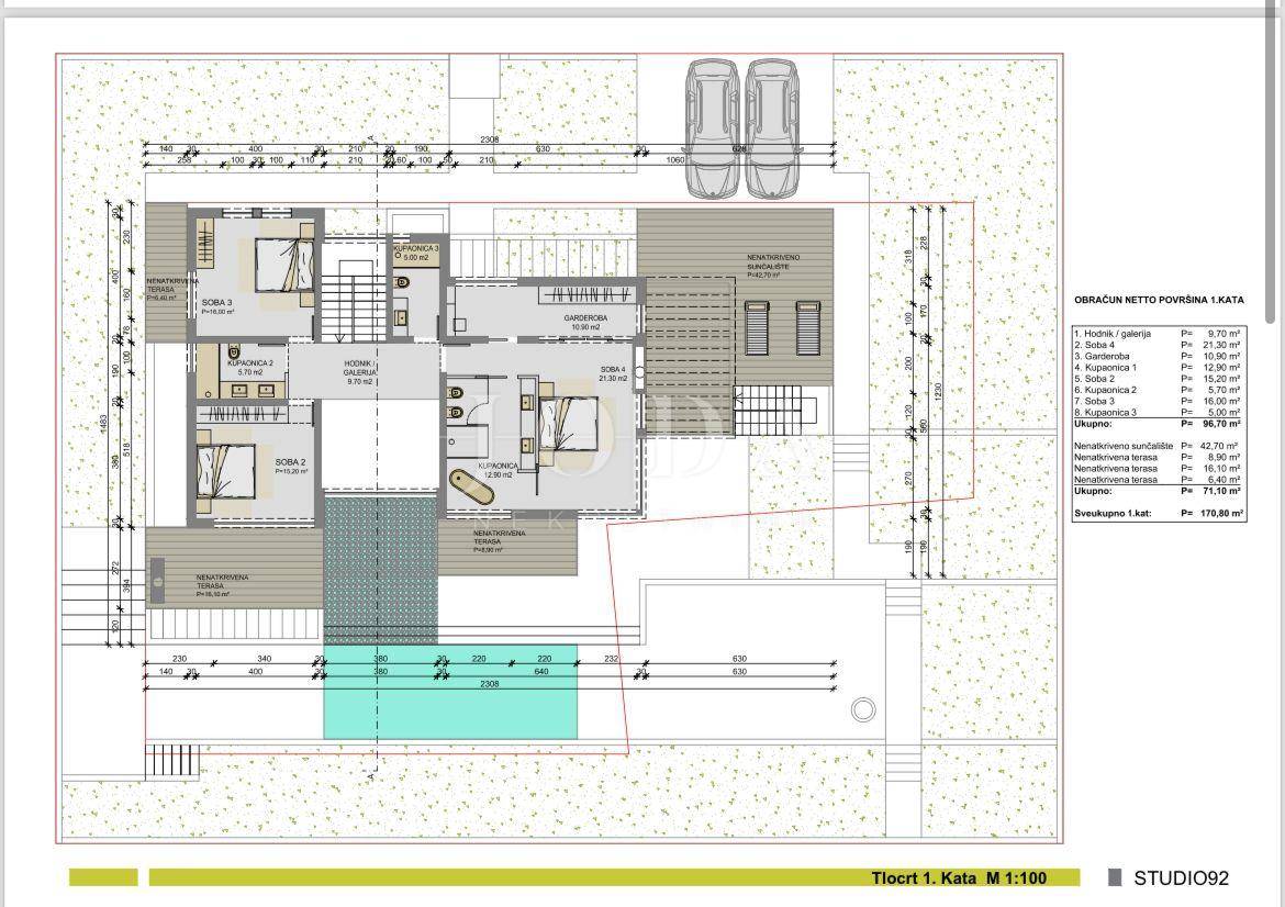 Na katu su smještene tri spavaće sobe, tri kupaone, garderoba i natkrivena terasa, također sa prekrasnim, neodoljivim pogledom na more.