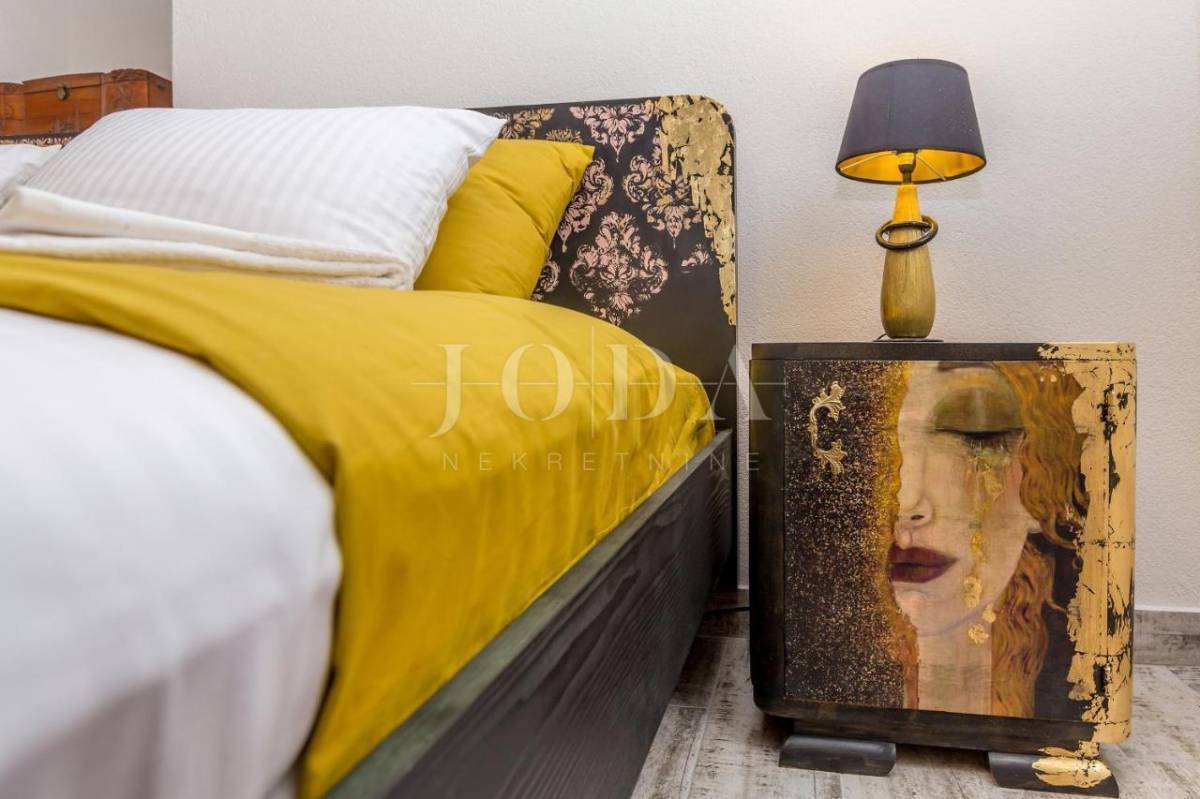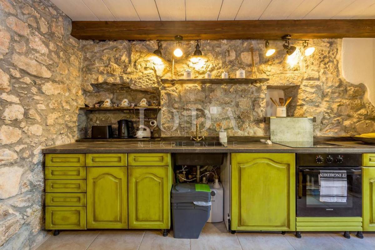 Pri uređenju je puno pažnje uloženo u detalje pa su se dijelovi stare kamene kuće odlično uklopili u poseban dizajn i unikatan, ručno izrađen namještaj, što ovu nekretninu čini jedinstvenom kreativnom oazom idealnom za odmor i opuštanje.
