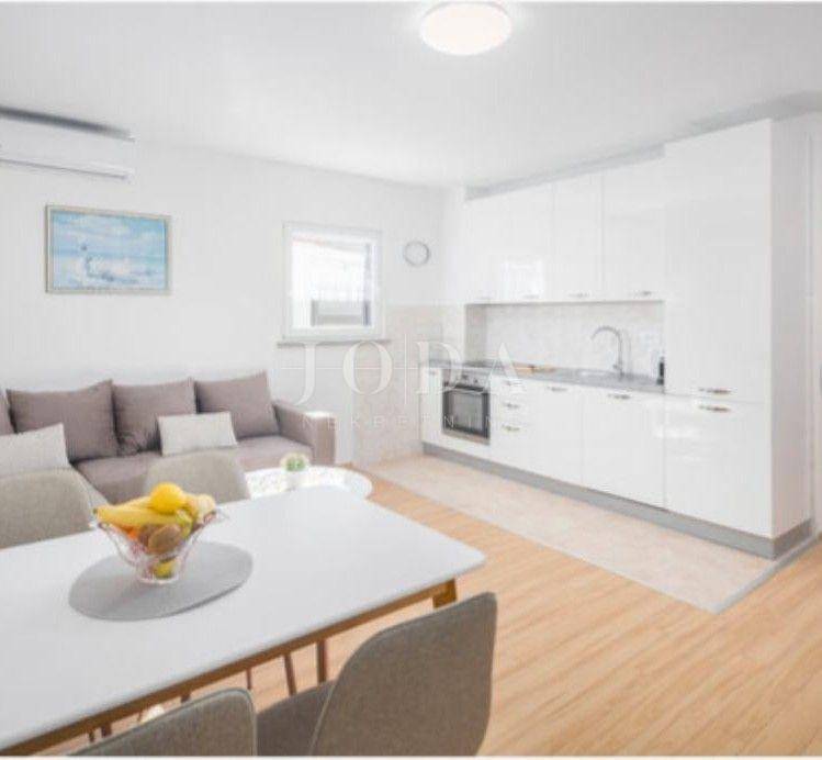 -Apartman u prizemlju sastoji se od hodnika, dnevnog boravka s kuhinjom, kupaone, spavaće sobe i natkrivene terase.