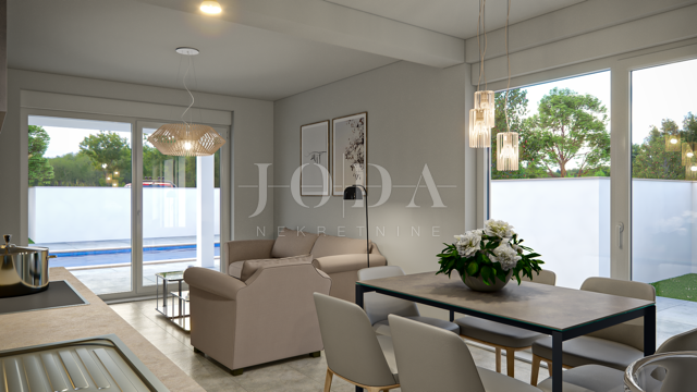 U prizemlju se nalazi dnevni boravak sa kuhinjom i blagovaonom otvorenog tipa sa pogledom na predivan vrt i bazen, te pristup natkrivenoj terasi na kojoj možemo uživati tijekom cijele godine. U prizemlju se još nalazi i spavaća soba sa kupatilom i wc.