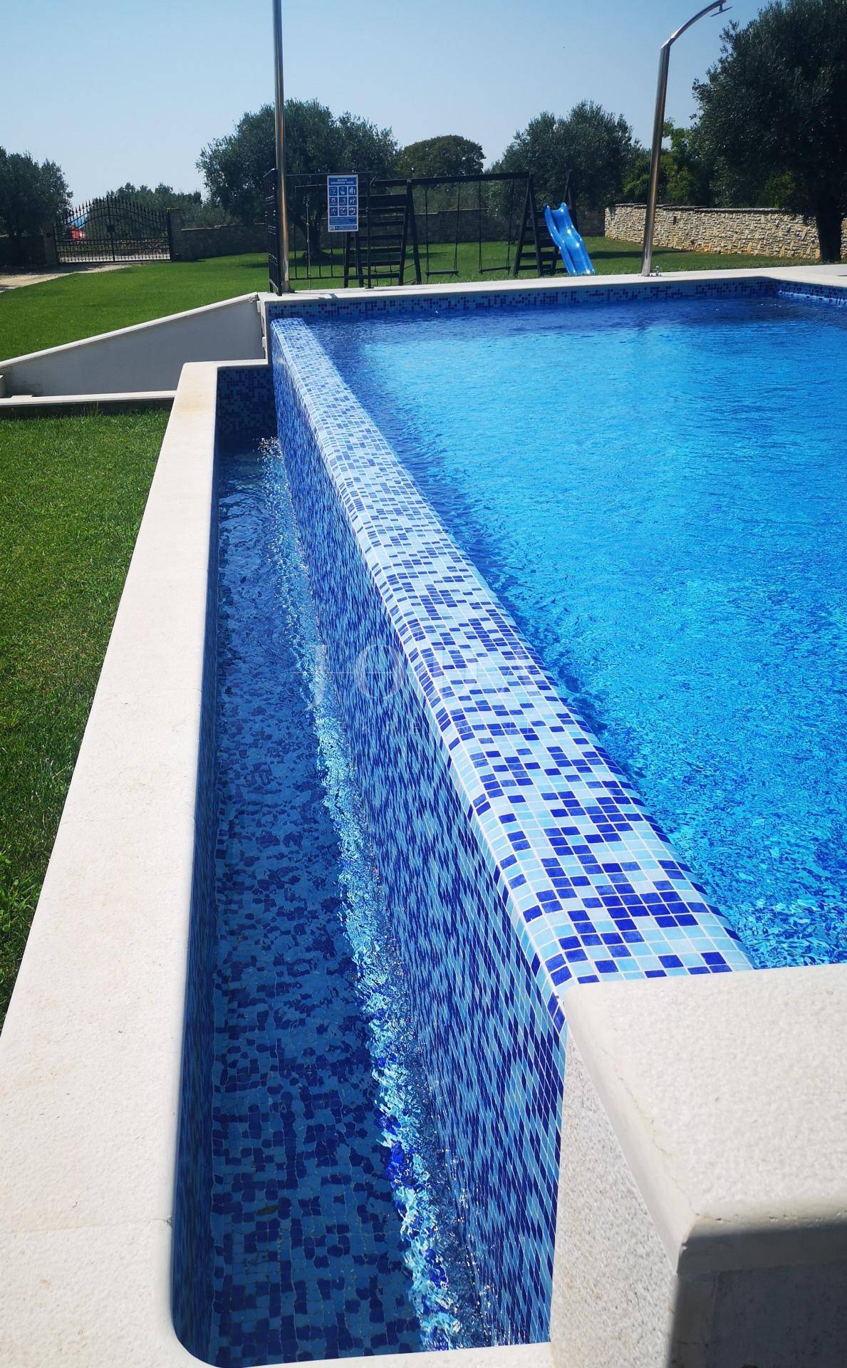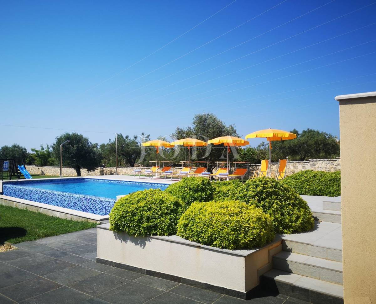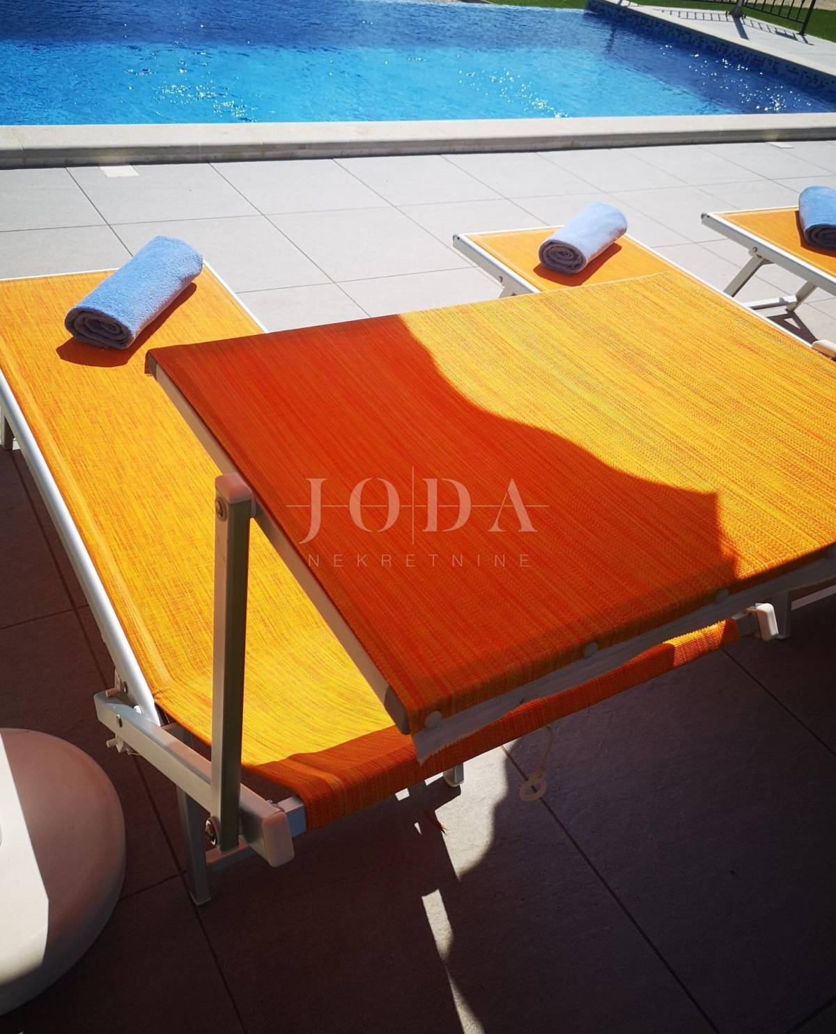 Uz terasu koja okružuje kuću,nalazi se ljetna kuhinja te bazen i sunčalište,a na prekrasnoj travnatoj okučnici nalazi se dječje igralište.