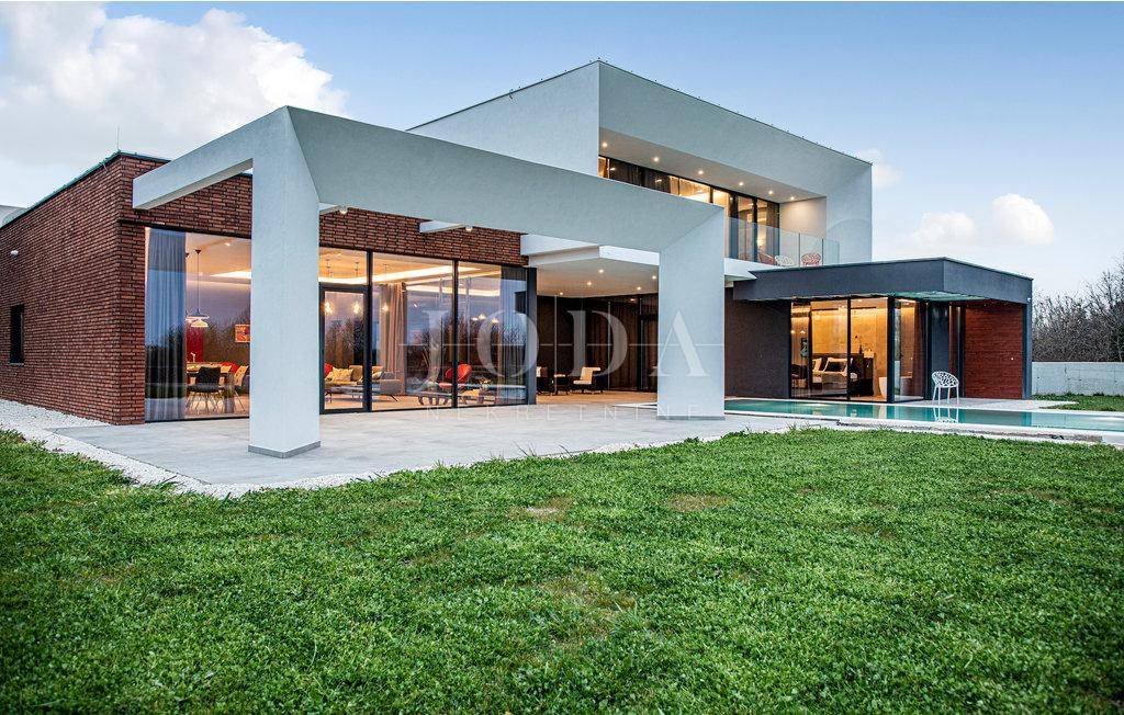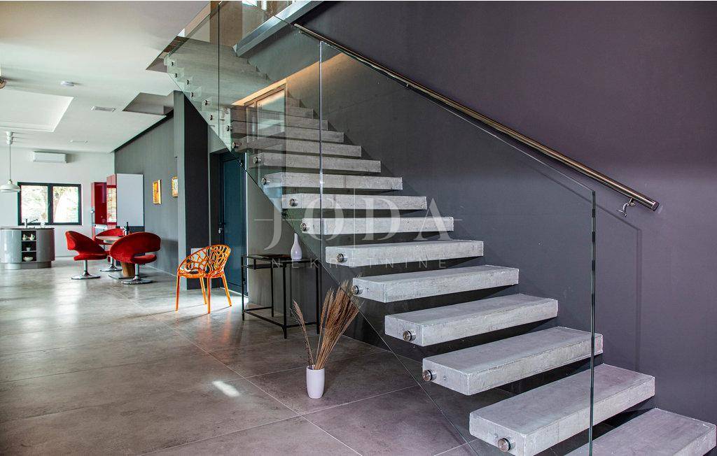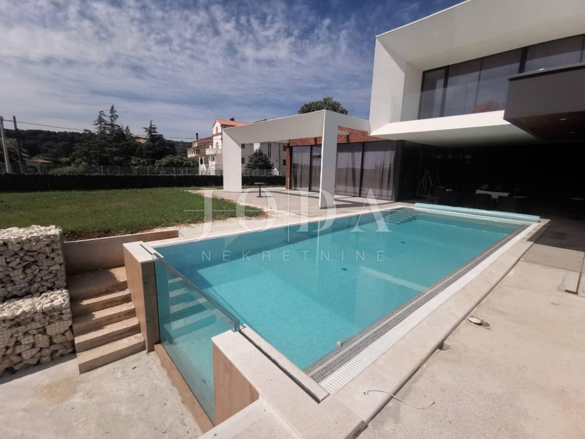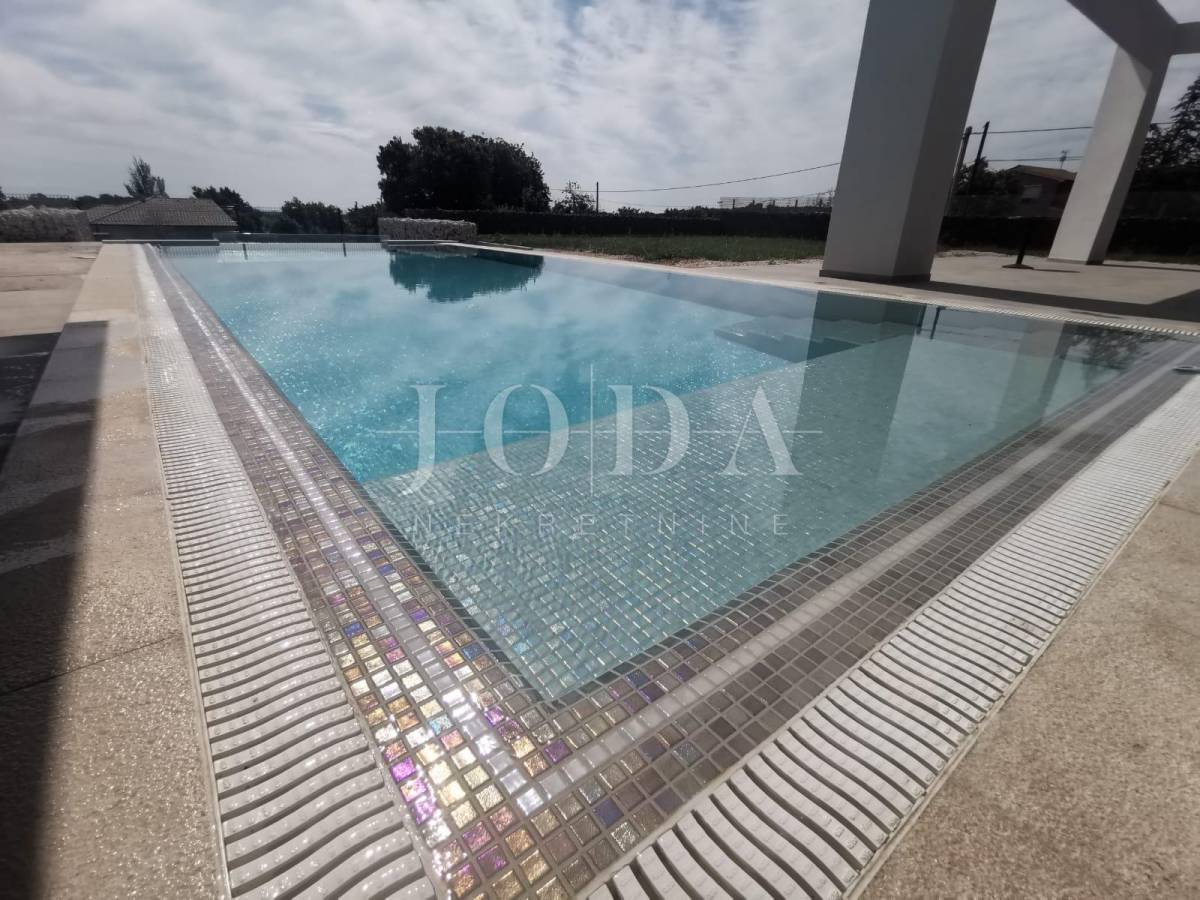 Samostojeća obiteljska kuća na 1100m2 oređene i ograđene okućnice koncipitrana kao jedan stan.Prizemlje je otvoren prostor velikog dnevnog boravka,kuhinje i blagavaonice iz kojeg se izlazi na natkrivenu terasu za druženje i sunčalište unutar kojega dominira preljevni grijani bazen.
