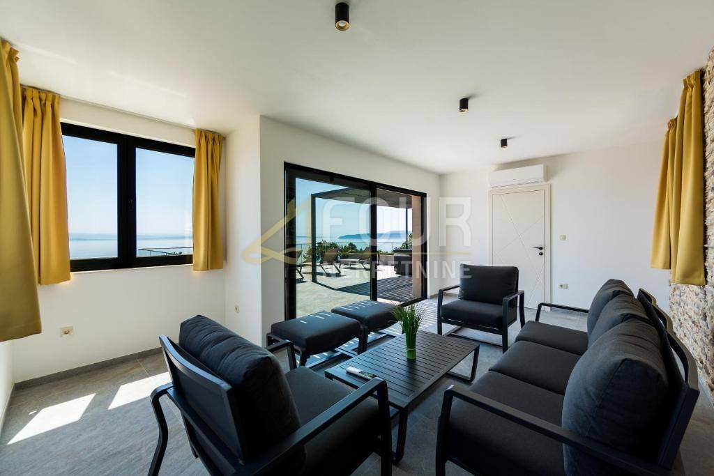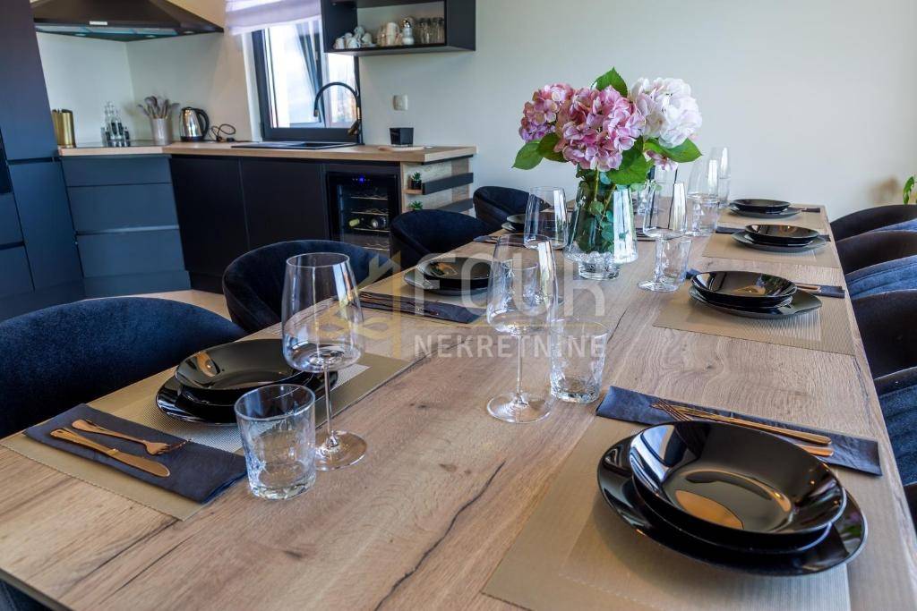 Prizemlje obuhvaća elegantan dnevni boravak povezan s moderno opremljenom kuhinjom, spavaću sobu i kupaonicu.
