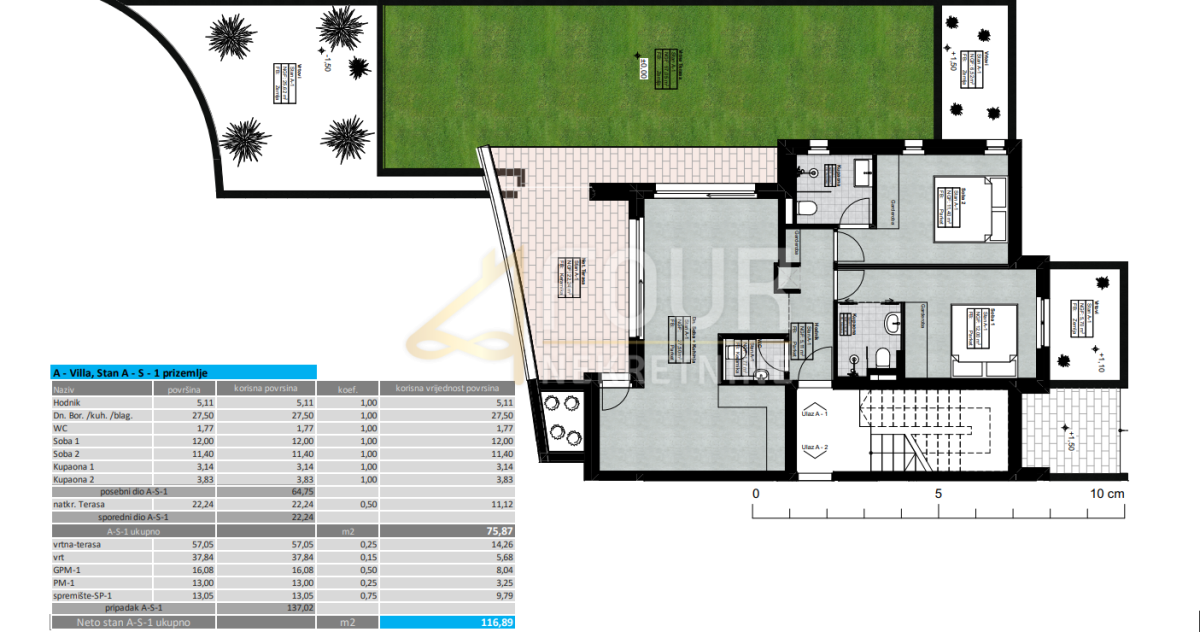 Stan je ukupne površine 75.87m2, uz natkrivenu terasu od 22.24m2, okućnicu od 94.89m2, dva parkirna mjesta (garažno mjesto od 16.08m2 i vanjsko mjesto od 13m2) te spremište od 13.05m2.