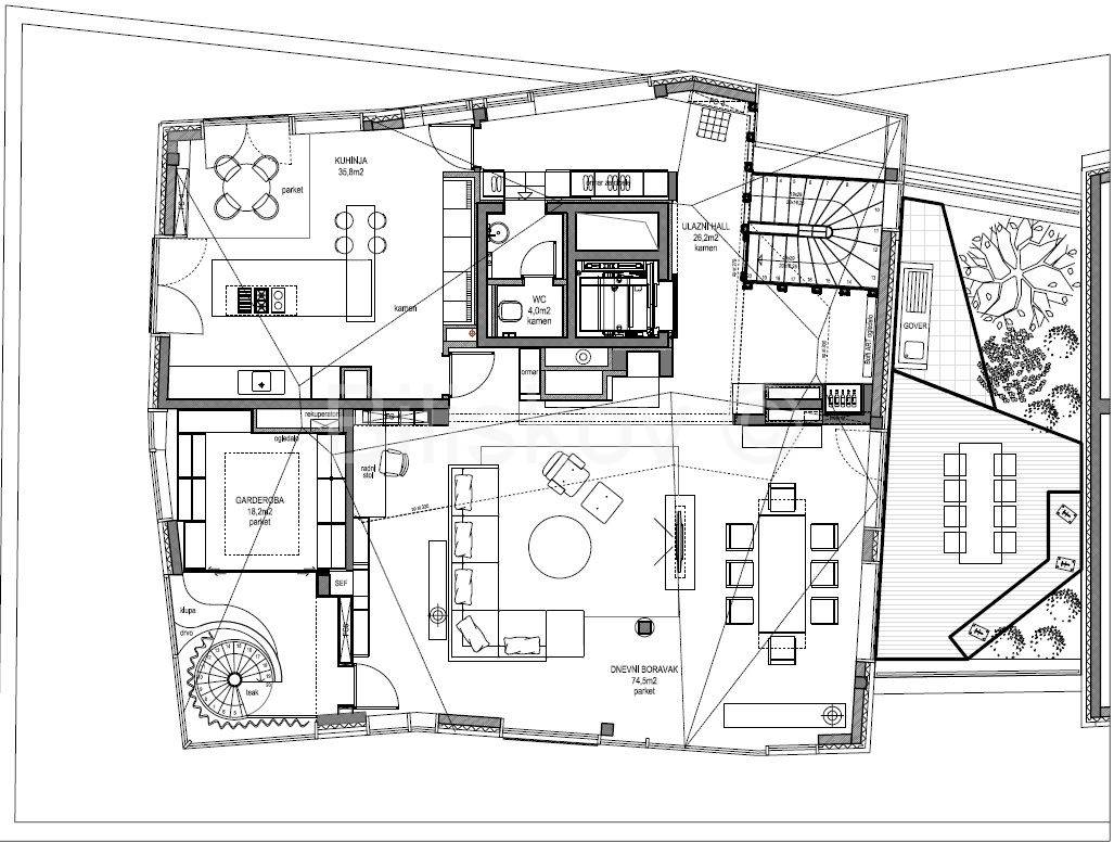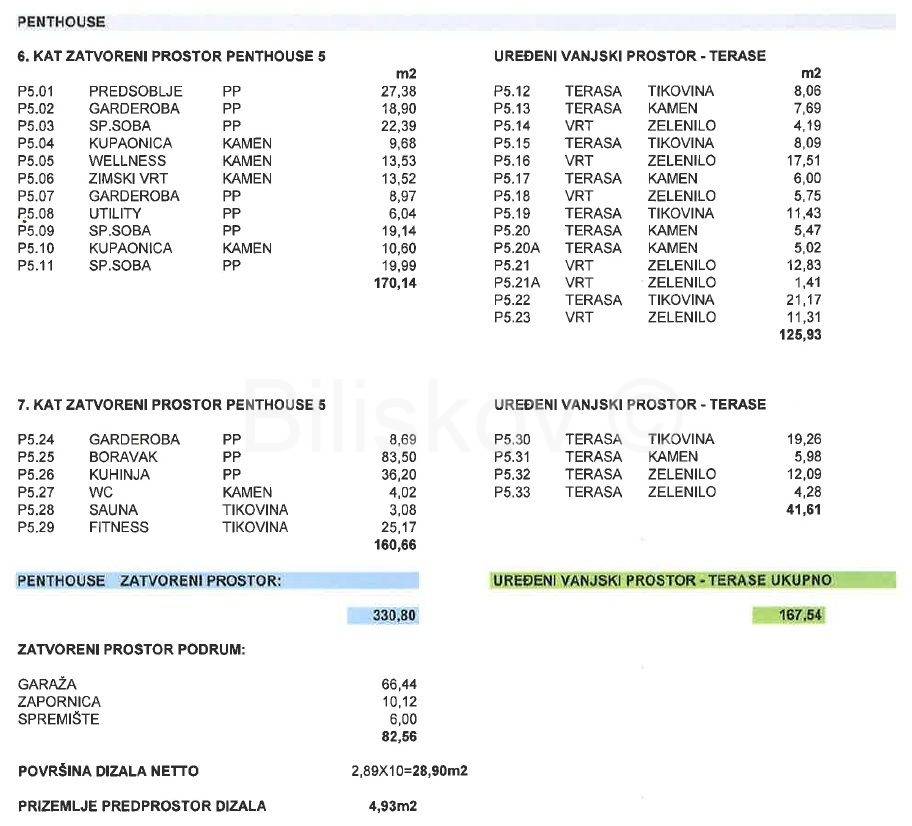 Gornja etaža stana sastoji se prostranog dnevnog boravka, velike kuhinje, saune, fitnessa, WC-a te garderobe zatvorene površine 160,66m2, te od predivnih terasa koje površinski iznose 41,61m2.