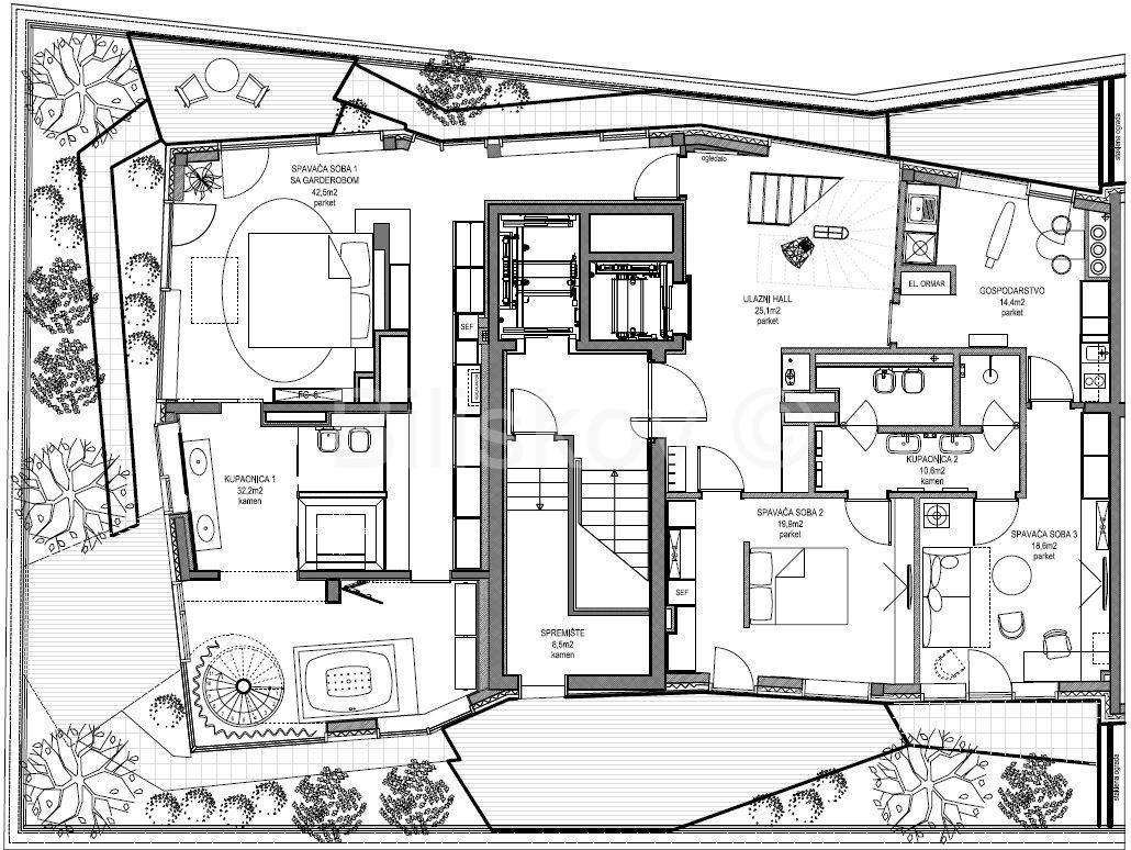 Doljnja etaža stana sastoji se od tri prostrane spavaće sobe, dvije garderobe, dvije kupaonice, wellnesa, zimskog vrta i predsoblja ukupne zatvorene površine 170,14m2, te od vrtova i terasa koji okružuju gotovo cijelu doljnju etažu te površinski iznose 125,93m2.