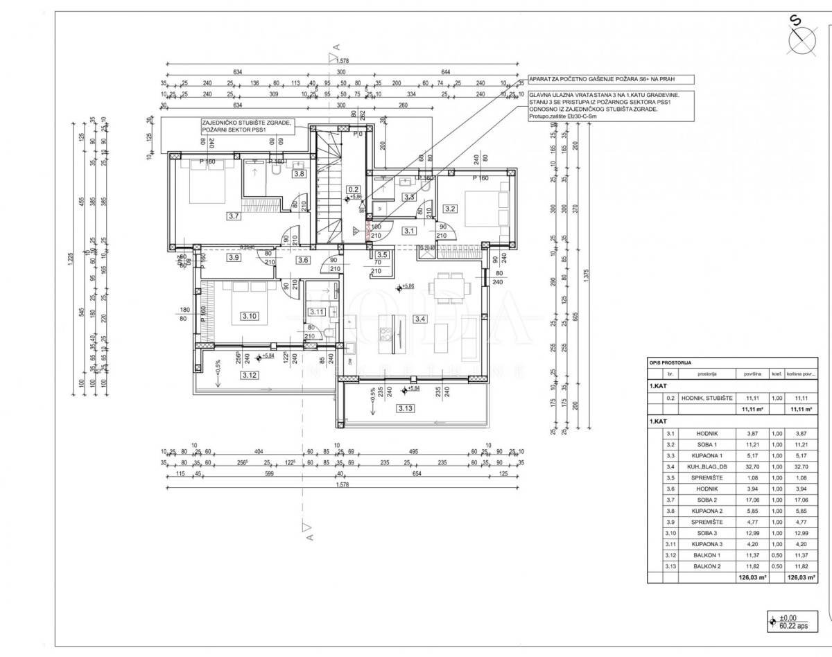 Ovaj stan će se nalaziti na prvome katu (sa južne strane gledano - drugi kat), i zauzimati će cijelu etažu. Imati će krasan, otvoreni pogled na more.