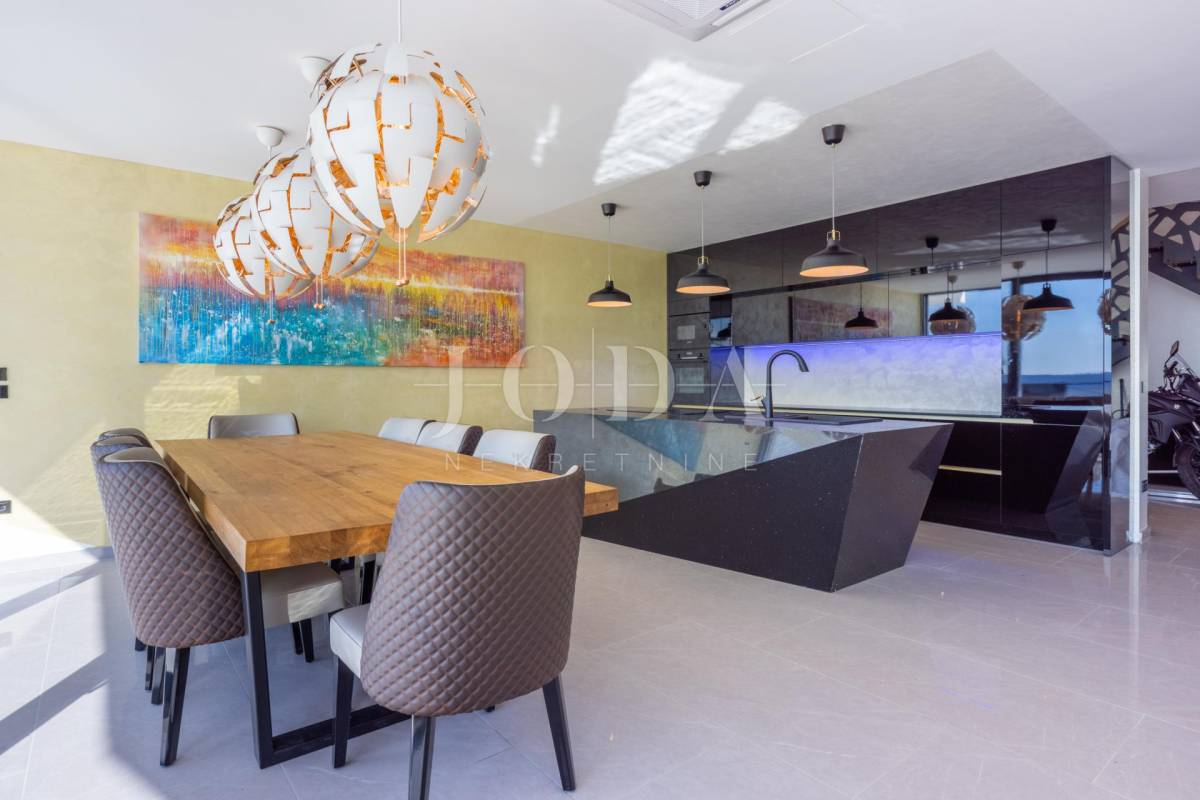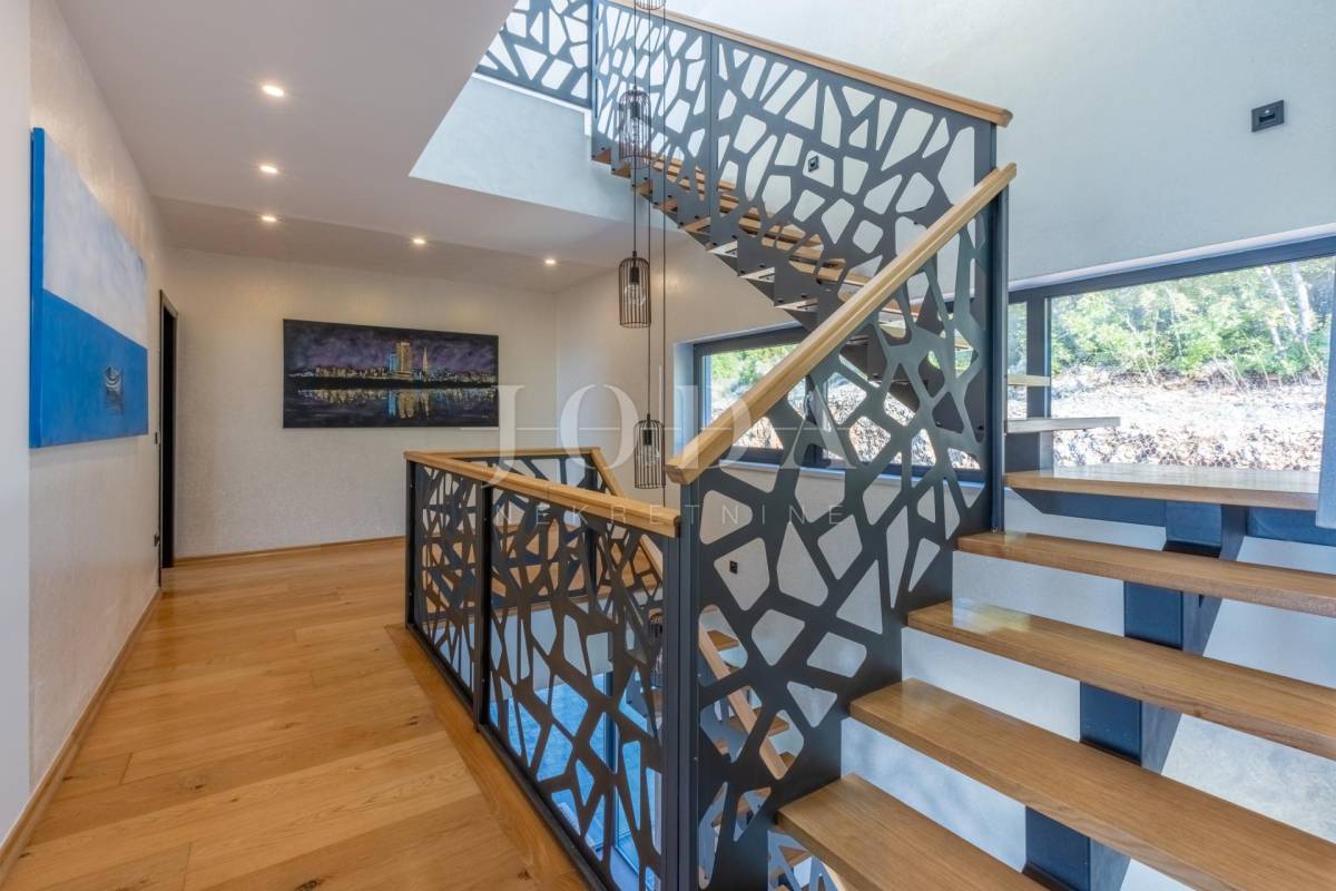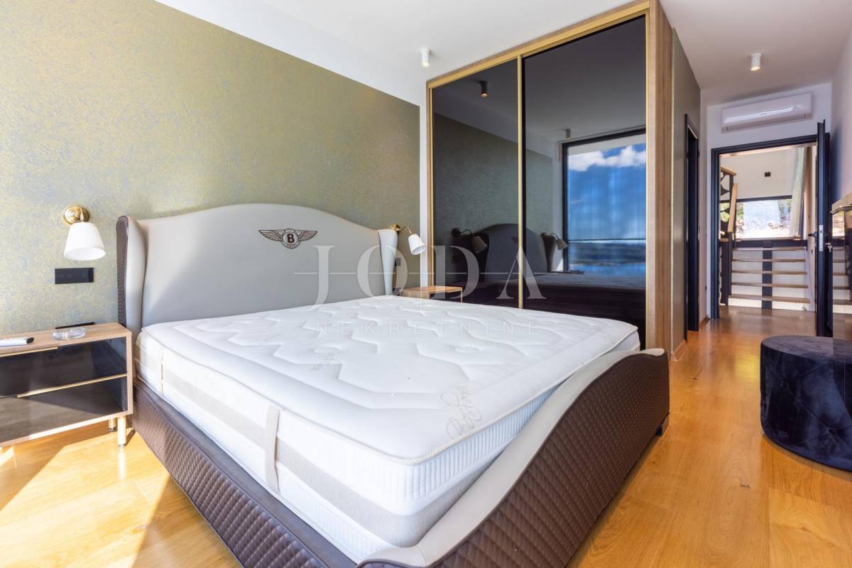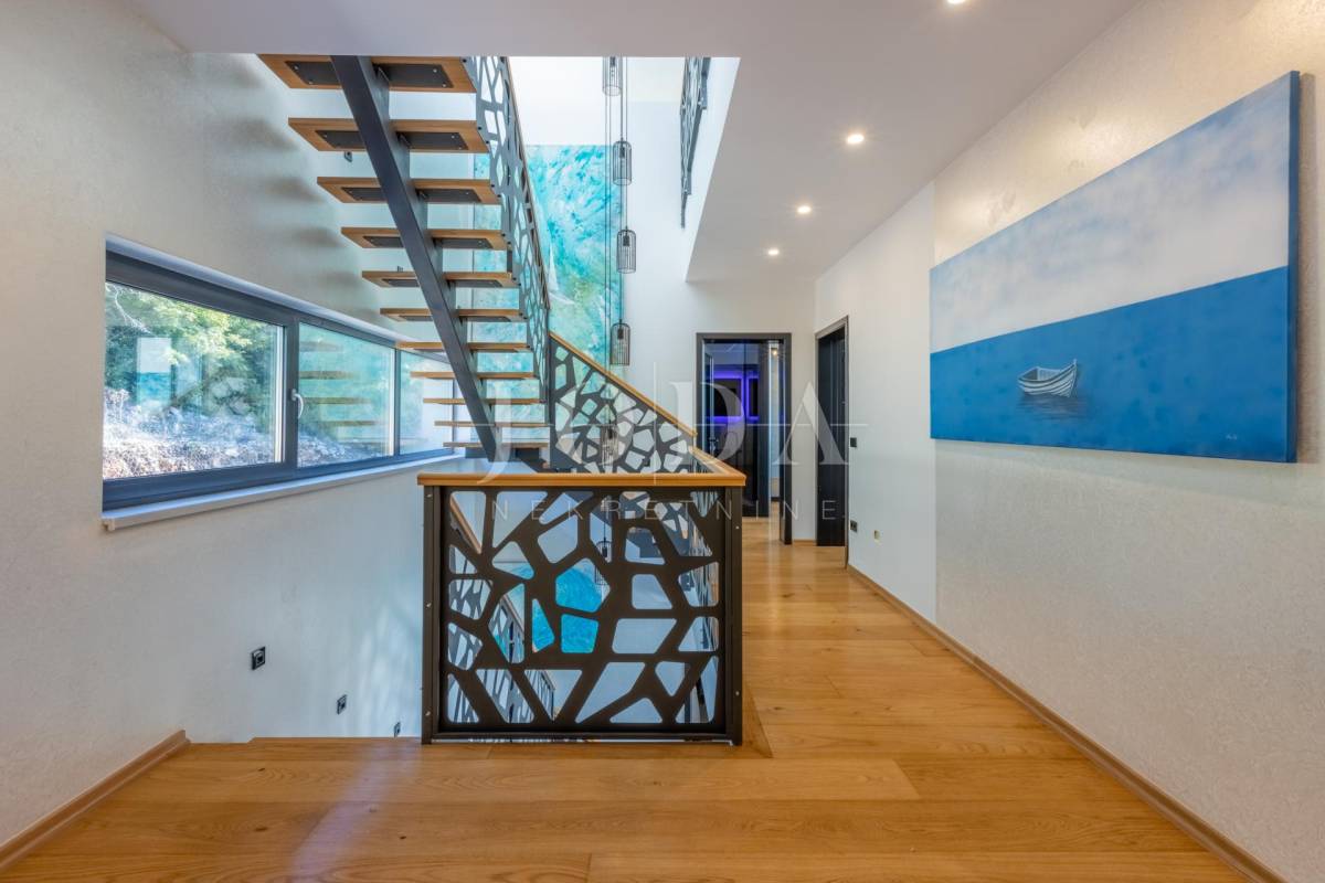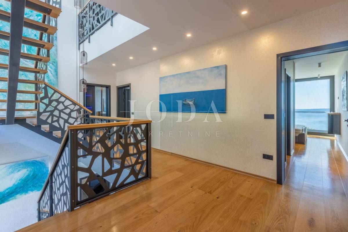 Stubište vodi na kat gdje su smještene tri spavaće sobe svaka sa vlastitom kupaonicom i balkonima,dok je na zadnjoj etaži krovna terasa sa sunčalištem i jacuzzijem.