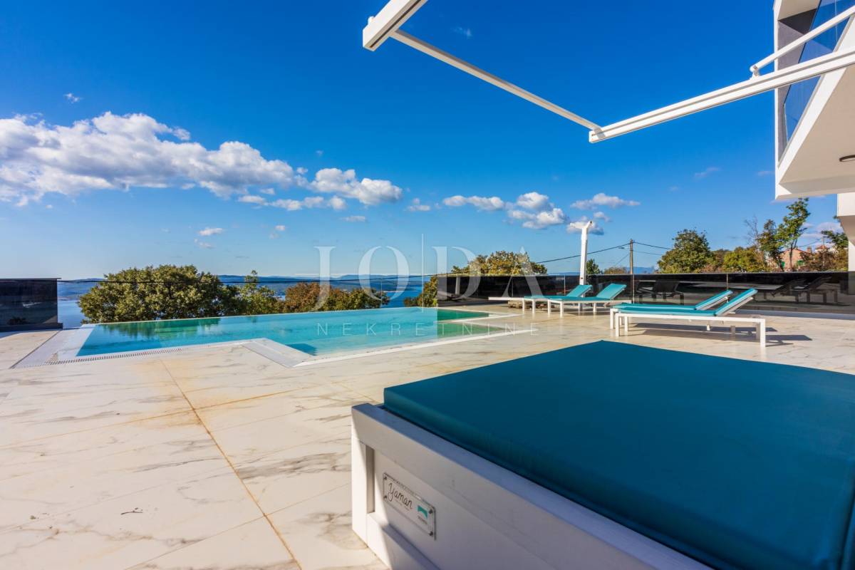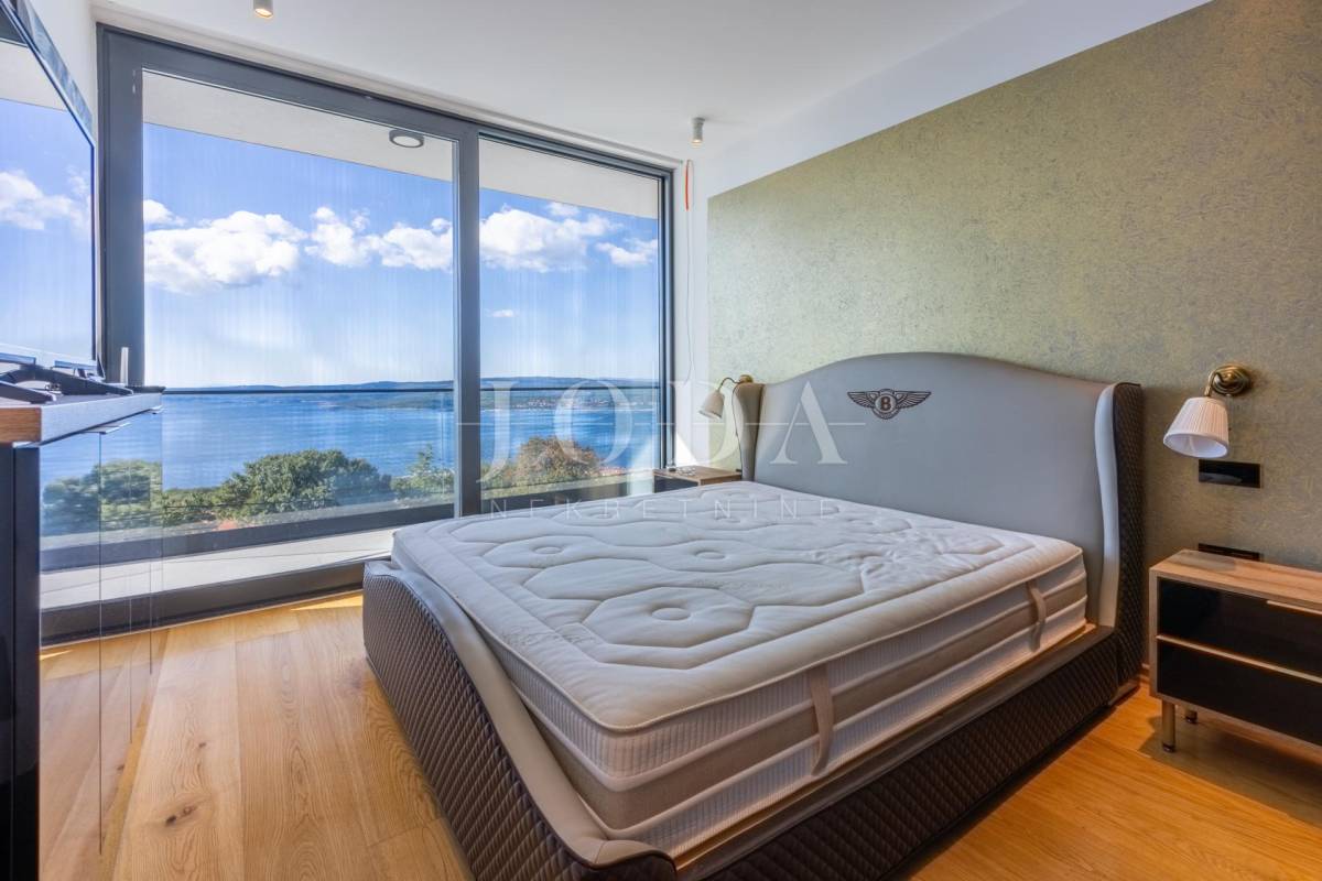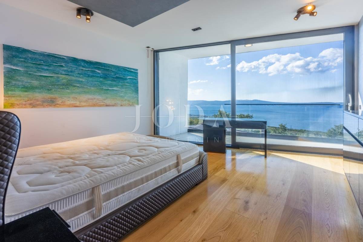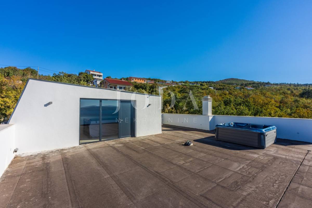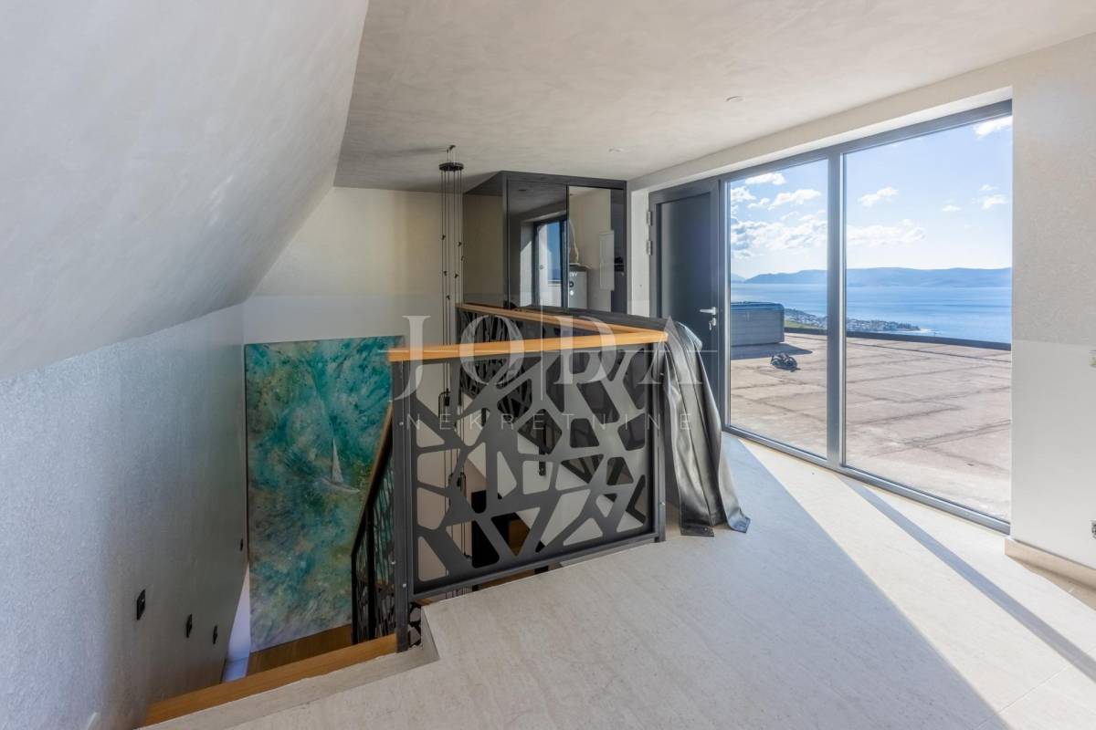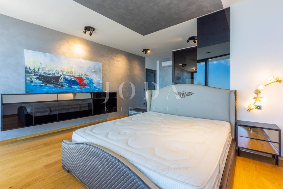 Stubište vodi na kat gdje su smještene tri spavaće sobe svaka sa vlastitom kupaonicom i balkonima,dok je na zadnjoj etaži krovna terasa sa sunčalištem i jacuzzijem.
