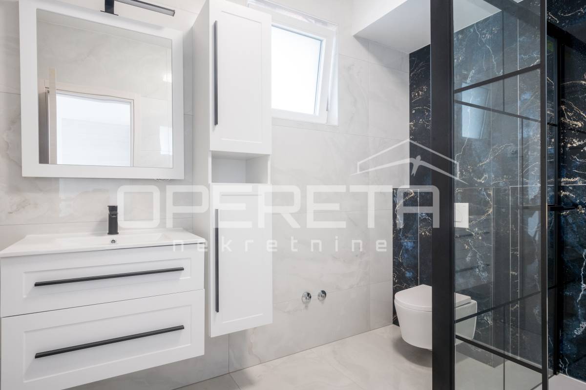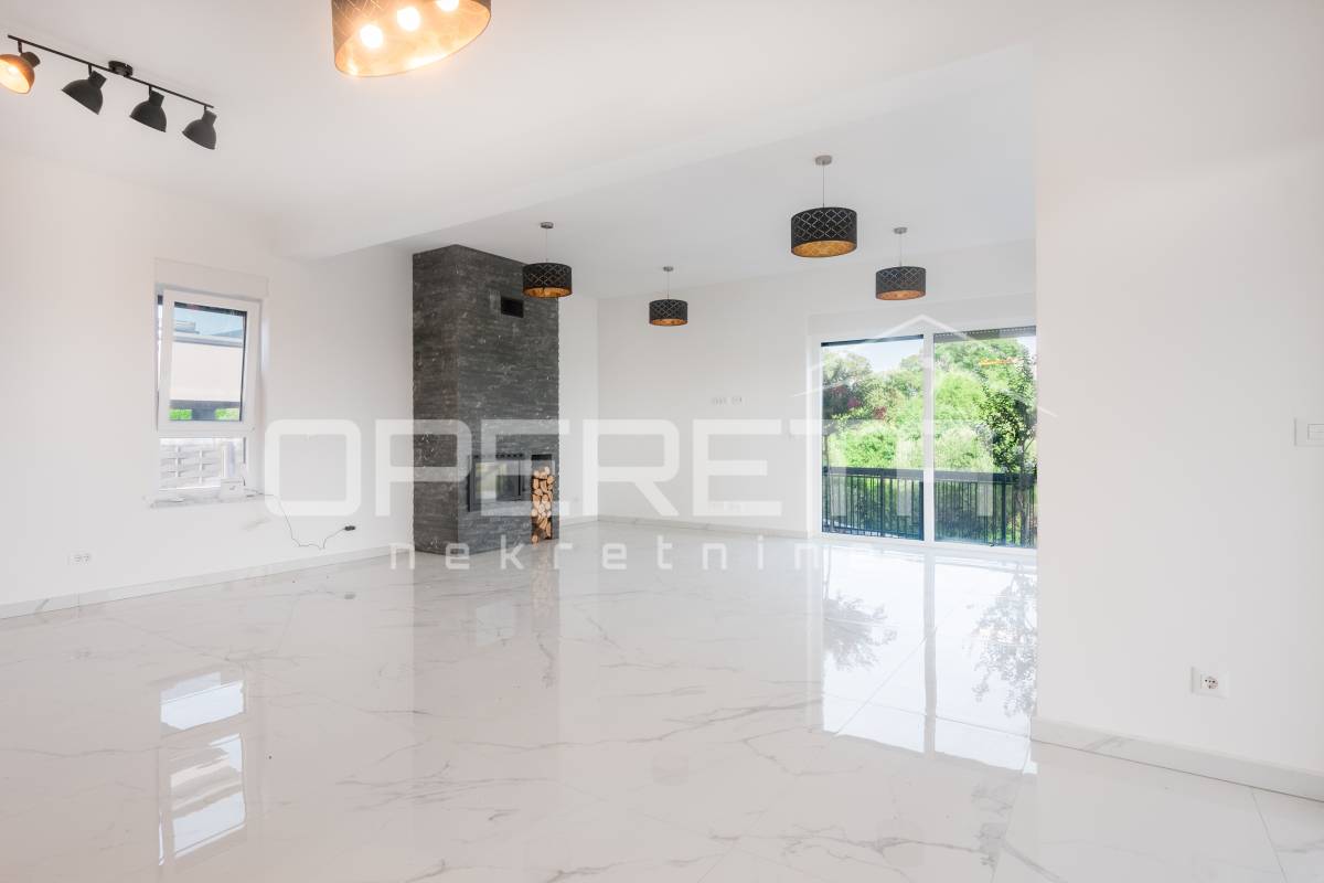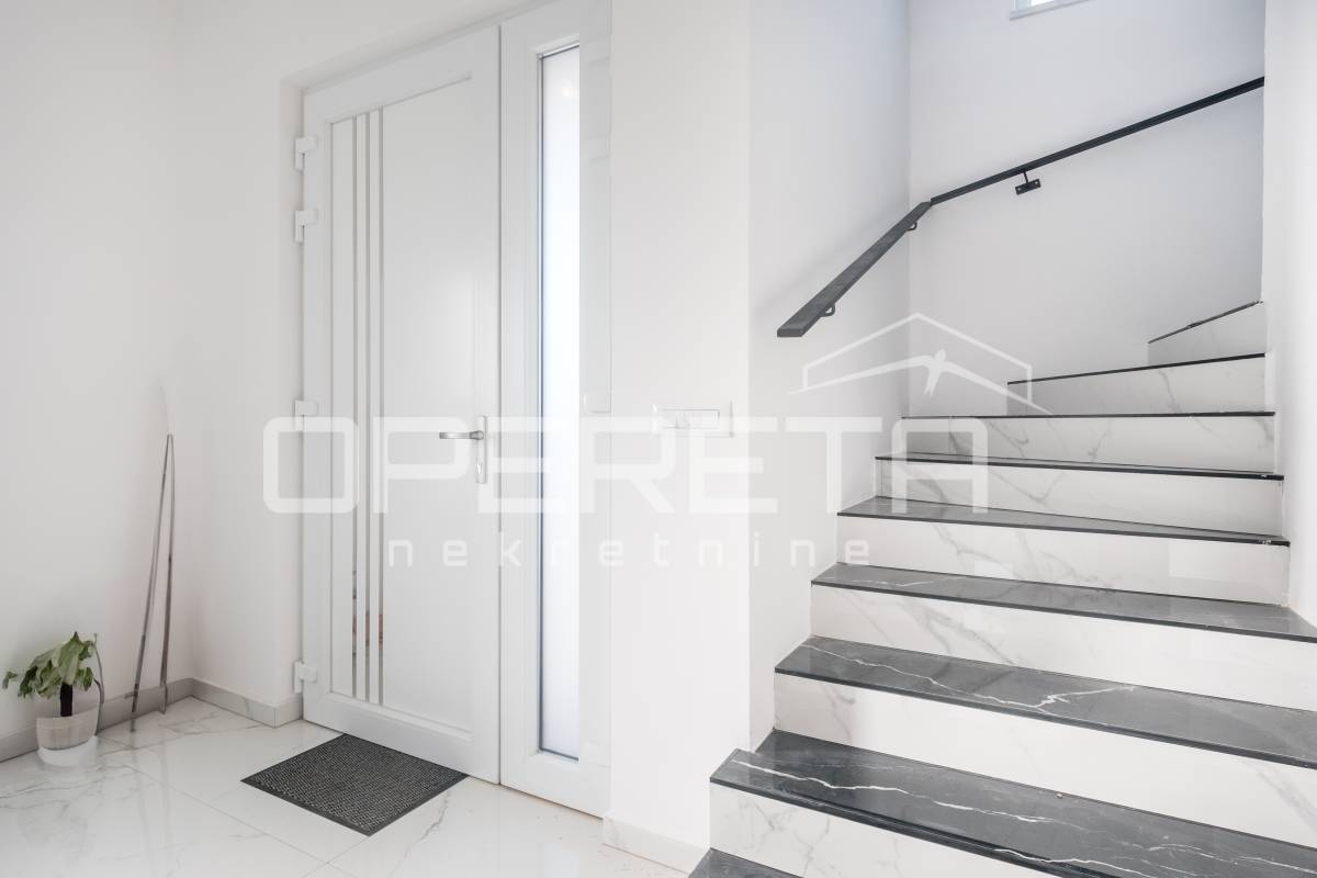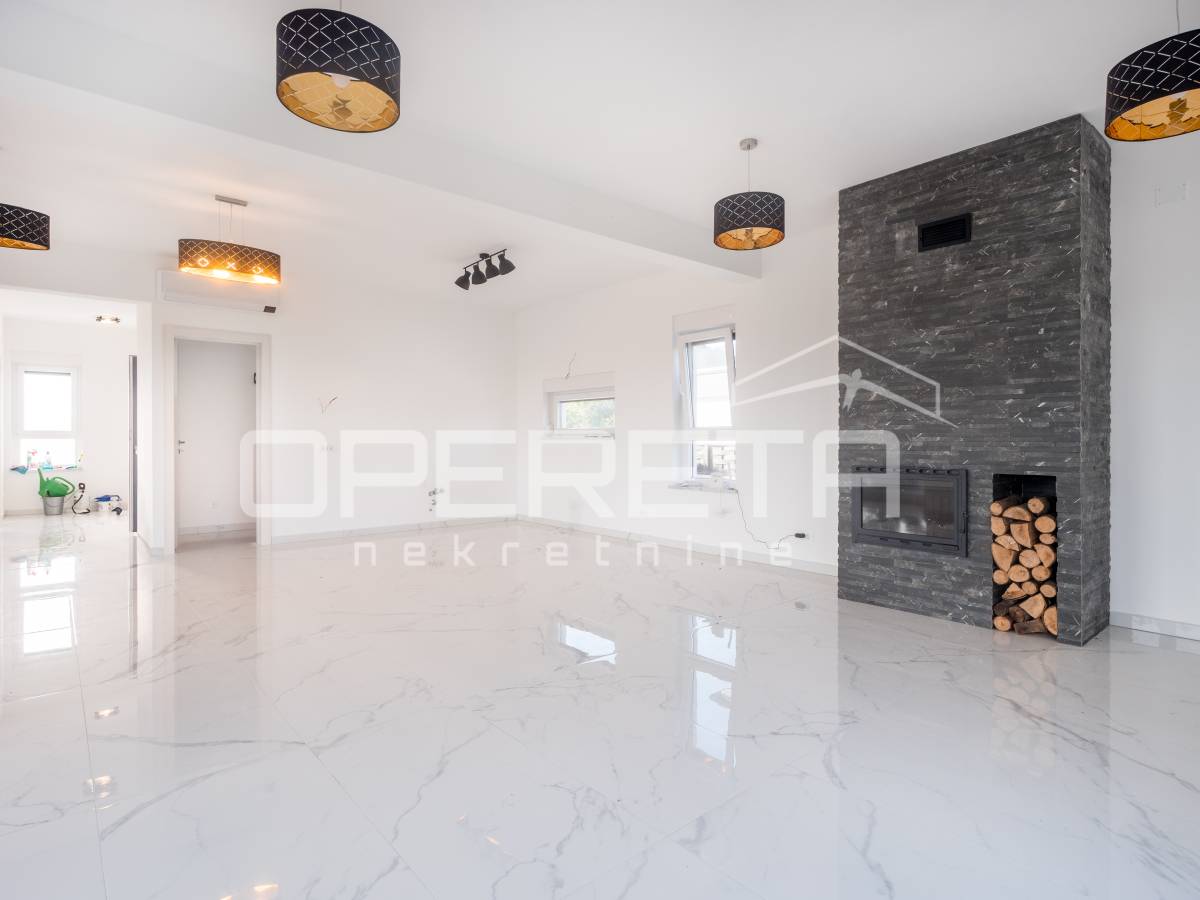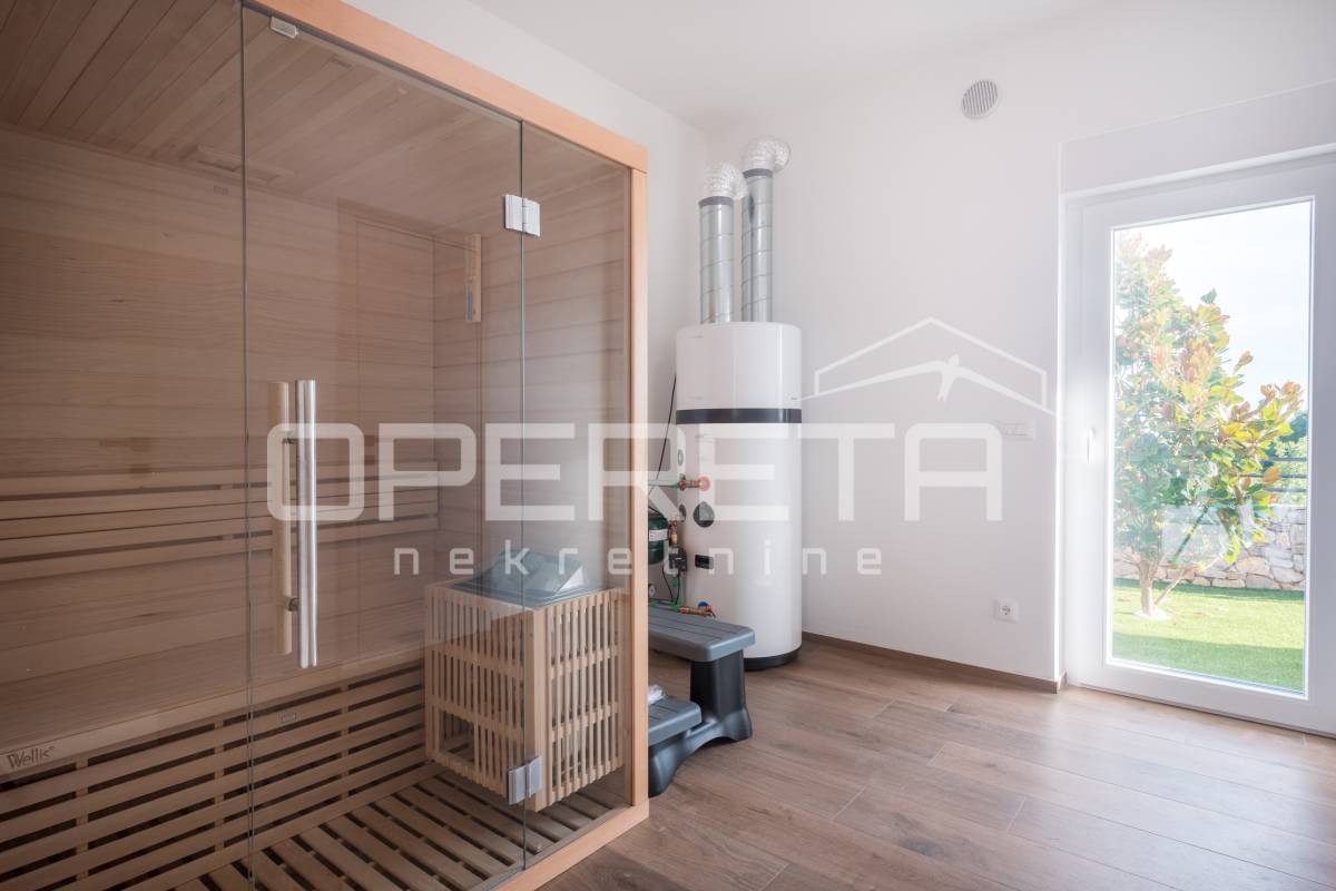 Interijer je osmišljen s naglaskom na udobnost, uz praktičan raspored prostorija i suvremene detalje koji zadovoljavaju potrebe svakodnevnog života. Unutrašnjost uključuje prostrani dnevni boravak, blagovaonicu i prostor predviđen za kuhinju, kao i tri spavaće sobe na katu, svaku s vlastitom kupaonicom. U prizemlju se nalazi i sauna s dodatnim tušem te odvojeni toalet za goste, što dodatno pridonosi udobnosti i promišljenom rasporedu prostora.