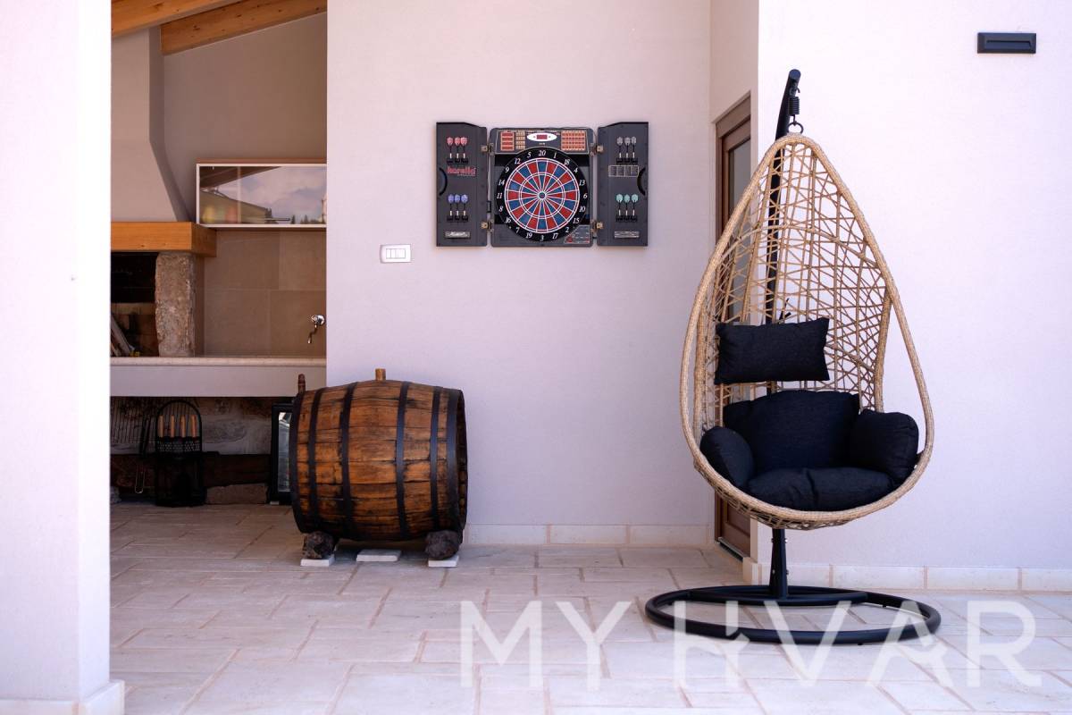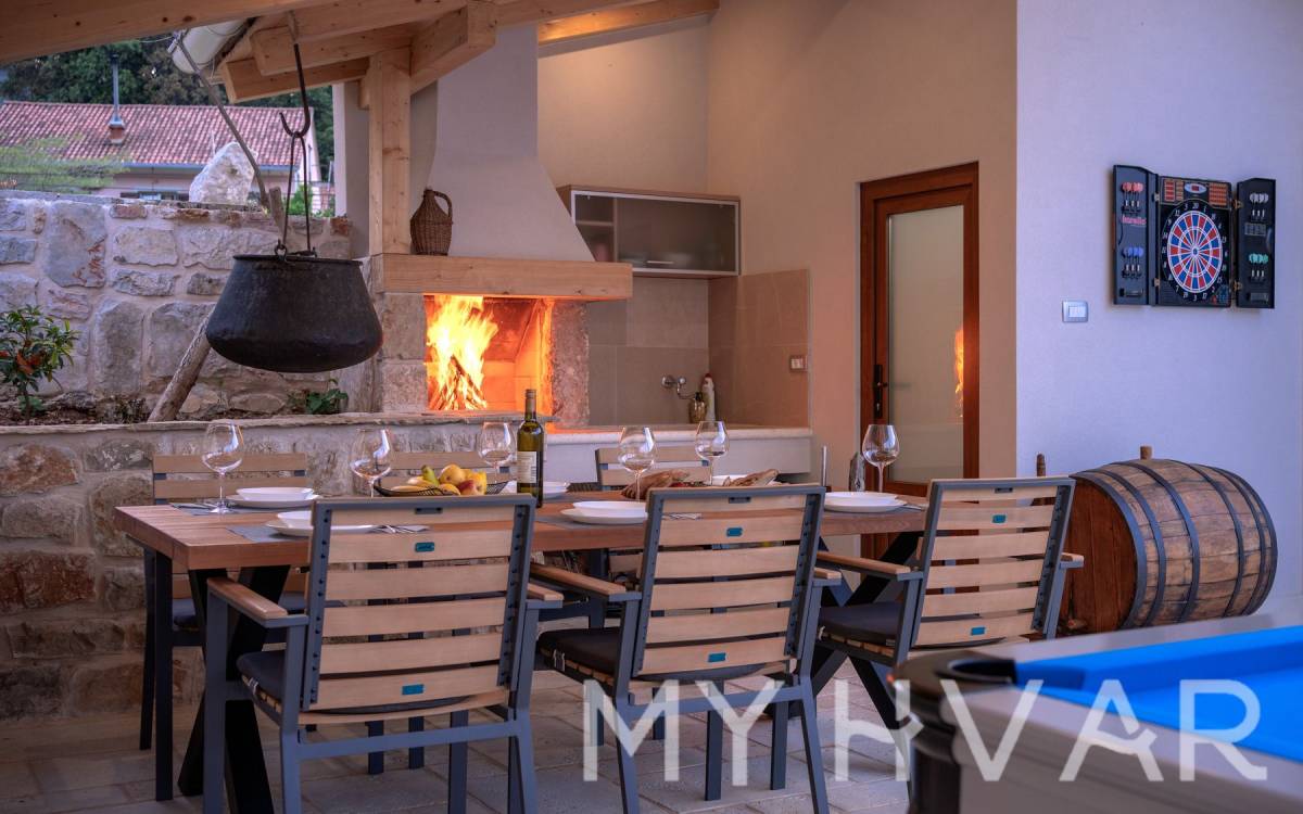 Vanjski prostor jednako je privlačan, s velikim dvorištem koje uključuje tradicionalni kamin i potpuno opremljenu ljetnu kuhinju, savršenu za objedovanje na otvorenom i druženja pod zvjezdanim nebom. Prostrana terasa nudi dovoljno prostora za opuštanje i uživanje u miru okolnog krajolika.