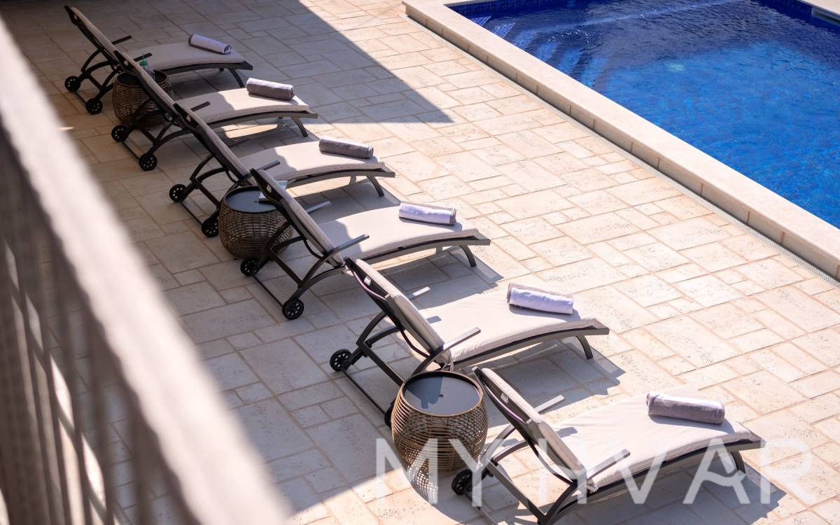 Vila se ističe prekrasno dizajniranim grijanim bazenom, koji osigurava uživanje tijekom cijele godine—toplim zimi i osvježavajuće hladnim ljeti. Svaka prostorija opremljena je klima uređajem, dok centralno električno grijanje preko radijatora osigurava ugodnu toplinu u hladnijim mjesecima.